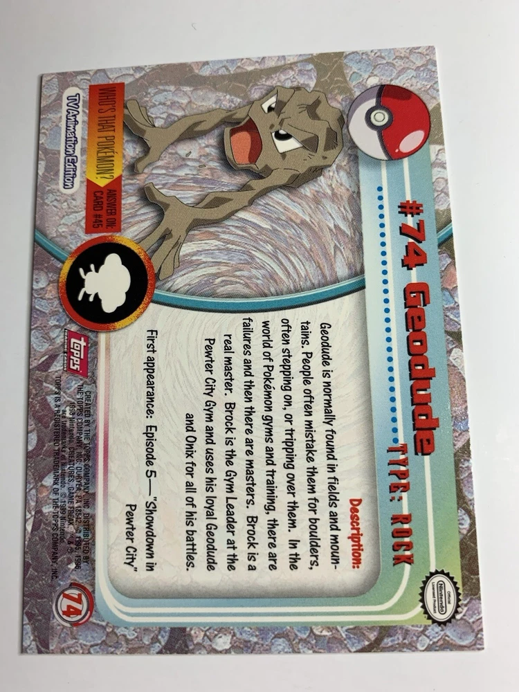1999 Topps Pokemon TV Animation Red Logo #74 Geodude Up for sale is a 1999 Topps Pokemon TV Series card. Please review pictures as the card pictured is of the actual card that you will receive. The card will be placed in a penny sleeve and shipped in a cardboard box with delivery tracking. I have 100% positive feedback and have been selling items on ebay for many years. Let me know if you have any questions or need additional pictures and I will be happy to provide them. Yes - I do offer combined shipping. Additional shipping cost for each ungraded (raw) card is FREE and for each PSA graded item is only $0.50. Pokémon Official Trading Cards , informally known as Pokémon Trading Cards series 1 , was a set of Pokémon-themed trading cards manufactured by Topps in 1999. There were 90 cards in total: 76 Pokémon cards, 13 character cards, and a checklist card. Each of these 90 cards also had two foil card versions (silver and rainbow) in their main United States distributions. This set contained no bonus "chase cards". In the United States There were four different printings. These cards all had an oval Nintendo seal. The printings are distinguished by a blue, black, green, or red Topps logo, with card texts being updated between the first (blue) and second (black) printings. Due to an error, all foil cards after the first printing were printed with black logos, but can still be distinguished by the differences in their debossings. § 1st printing: blue logo on all cards, foil cards had a smooth texture with no debossings. § 2nd printing: black logo on all cards, Pokémon foil cards were debossed with rays and starbursts, while TV cards had a sandpaper finish. § 3rd printing: green logo on non-foil cards only, Pokémon foil cards were debossed with flames and teardrops, while TV cards had dots and rectangles. § 4th printing: red logo on non-foil cards only, Pokémon foil cards were debossed with Poké Balls and targets, while TV cards had dents. A fifth printing featuring foil cards with a smooth finish but a black logo (features of both the 1st and 2nd printings) was also produced to an uncertain extent. Pokémon Trading Cards series 2 was a set of Pokémon-themed trading cards manufactured by Topps in 2000. There were 72 cards in total: 41 Pokémon cards, 5 "Heroes & Villains" cards, 25 episode cards, and a checklist card. Each of these 72 cards also had two foil card versions (silver and rainbow). In addition, there were 27 bonus "chase cards" not included on the checklist, including 12 die-cut embossed cards, 10 animation stick-on cards, and 5 clear cards. Pokémon Trading Cards series 3 was a set of Pokémon-themed trading cards manufactured by Topps in 2000. There were 72 cards in total: 34 Pokémon cards, 12 "Heroes & Villains" cards, 19 episode cards, 6 puzzle cards, and a checklist card. Each of these 72 cards also had two foil card versions (silver and rainbow). In addition, there were 27 bonus "chase cards" not included on the checklist, including 12 die-cut embossed evolution cards, 10 pop-up cards, and 5 clear cards.