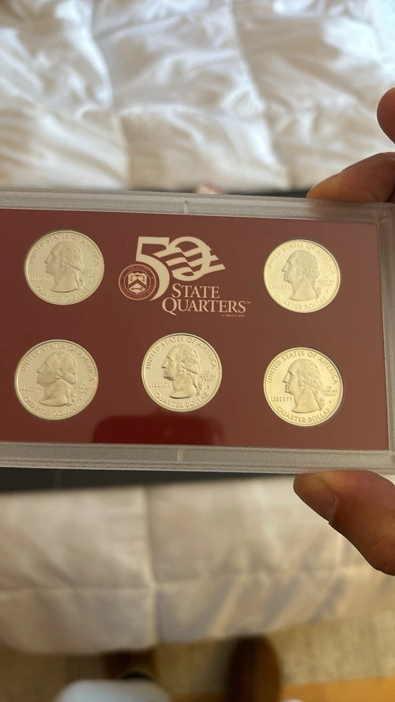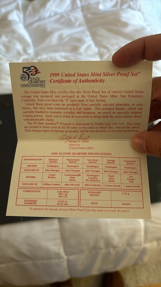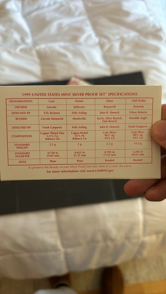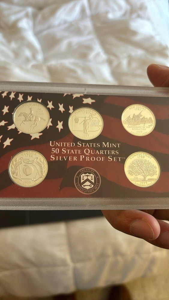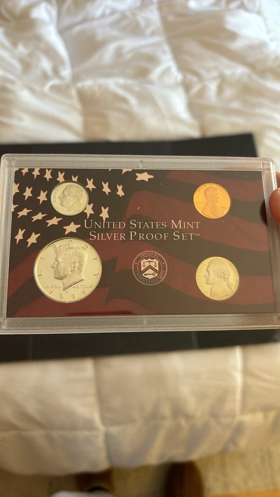 This is a 1999 US Silver 9 coin proof set with state quarters, in US Mint packaging. The set includes uncirculated coins made of silver, with a proof strike type. It was manufactured in the United States and certified by the U.S. Mint.
