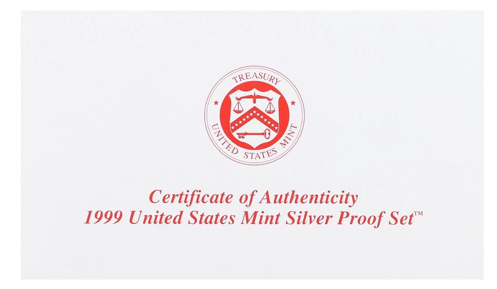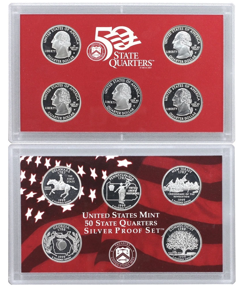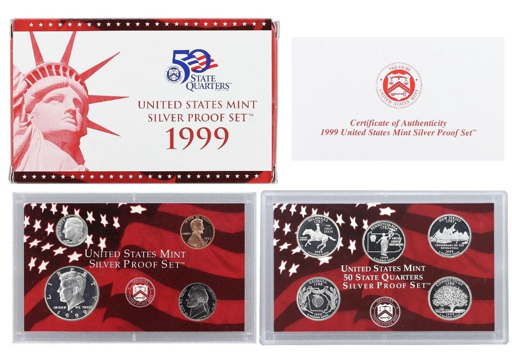 1999 United States Mint Silver Proof Set - 9 Coins - COA & OGP 90% Silver This 1999 U.S. Mint Silver Proof Set contains 9 proof condition coins. This set contains the Lincoln Cent, the Jefferson Nickel, the Roosevelt Dime, Kennedy Half-Dollar, and all five of the Washington Quarter-Dollars minted for the 50 State Quarters Program in 1999. The 5 state quarters include Delaware, Georgia, Pennsylvania, New Jersey and Connecticut, and are minted in 90% silver, as are the dime, quarter, and half dollar. All 5 quarters share the same Washington obverse. This 1999 U.S. Mint Silver Proof set comes in like new condition, sealed in two plastic display cases as packaged by the U.S. Mint, and includes the original Mint packaging box and Certificate of Authenticity.