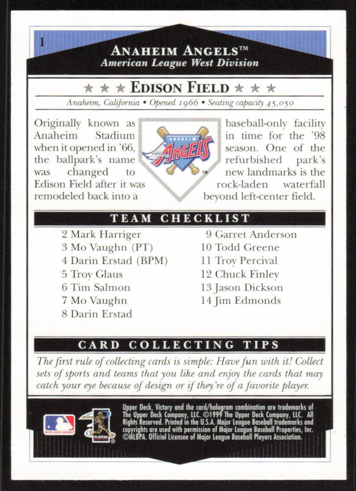 This is a nice example of a 1999 Upper Deck Victory #1 Anaheim Angels Other important information about this card: In 1999 Anaheim Angels played for the Anaheim Angels. Please check out our other listings for more great cards.