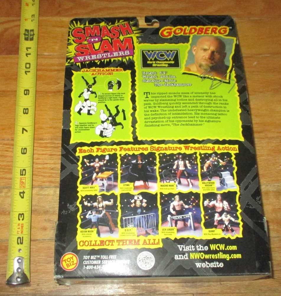This item is a in Package WCW Toy Biz Wrestling Figure of former WCW NWO WWF WWE Wrestling Star Who's Next Bill Goldberg. He was produced in 1999 by Marvel Toys and is in his sealed Package with only minor wear to the edges and corners as can be seen in the photos. He is a Smash and Slam and includes a Rey Mysterio figure as a bonus. Shipping outside of the United States will be extra. Please check out my other wrestling auctions and contact me with any questions or wrestling related item requests. Serious bidders only as negative comments will be placed if bids are not completed. Good Luck