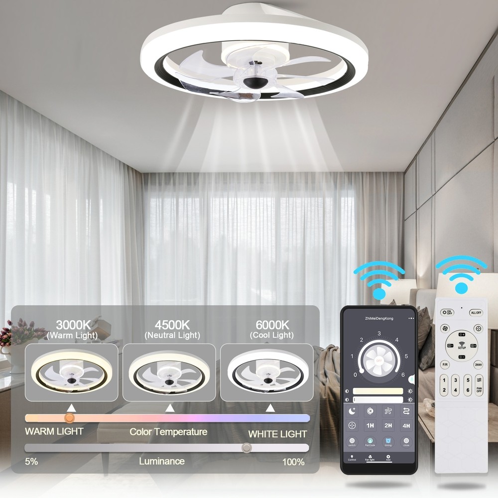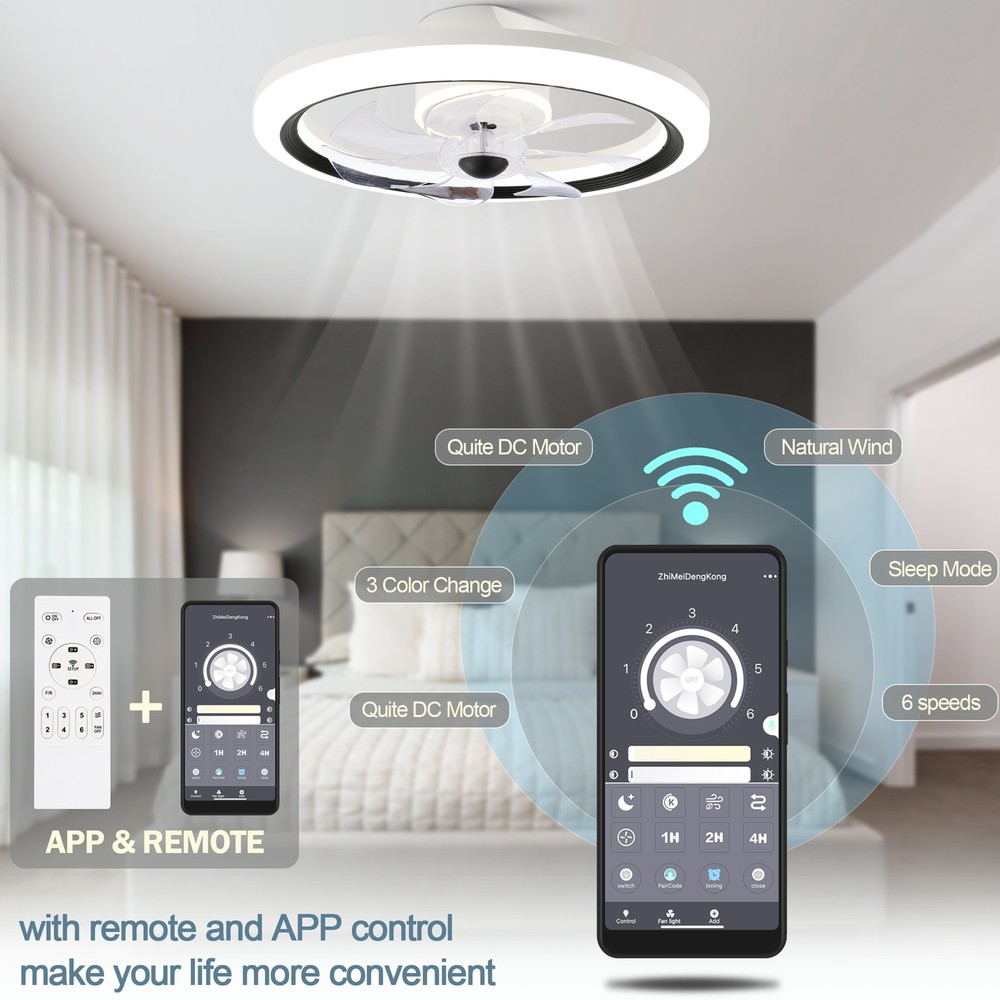 Introducing the perfect addition to your modern home a ceiling fan with a stunning matte finish that will elevate any room's décor. With its six fan speeds and three light temperature options, this fan provides you the ultimate cooling and illuminating experience . Its reversible whisper-quiet motor ensures that the fan operates smoothly and quietly, giving you the ultimate relaxation experience. With phone app control, you can easily operate the fan from anywhere in the room, adjusting the 6 fan speed or 3 light temperature to suit your needs.Features: Eye-catching matte white finish adds a touch of modern style to your décor Remote control and phone apps control give your the most convenient ceiling fan experience. 6 fan speeds, 3 light temperatures and dimming function are for you Free Shipping Over $49.99* Details CurveCurio 19" Matte White Flush Ceiling Fan App Control Remote Control 6 Speed Product Description: Introducing the perfect addition to your modern home a ceiling fan with a stunning matte finish that will elevate any room's décor. With its six fan speeds and three light temperature options, this fan provides you the ultimate cooling and illuminating experience . Its reversible whisper-quiet motor ensures that the fan operates smoothly and quietly, giving you the ultimate relaxation experience. With phone app control, you can easily operate the fan from anywhere in the room, adjusting the 6 fan speed or 3 light temperature to suit your needs. Features: Eye-catching matte white finish adds a touch of modern style to your décor Remote control and phone apps control give your the most convenient ceiling fan experience. 6 fan speeds, 3 light temperatures and dimming function are for you to choose from, able to meet the needs of all kinds of occasions Reversible whisper-quiet motor that circulates air in the winter and cools your space in the summer. Dimensions: 19.7 * 19.7 * 4.9 Additional Info : 19-inch ceiling fan is perfect for small rooms (up to 75 sq ft.) Slope Ceiling supported up to 15 degrees This product is UL listed for a dry environment MaterialSteel, Plastic ColorWhite FinishMatte LightIncluded LED Kit Light Wattage28W Light Kit replaceableYes DimmableYes Light color tone3warm light(3000k); warm white(4500k); white light(6000k) Motor wattage15W PRM501-599-692-788-892-994 (6 speeds) Fan blades7 reversibleYes Phone App ControlYes RemoteYes Remote control included (battery not included, please use AAA batteries) WarrantyLifetime on motor and one year on all the other parts