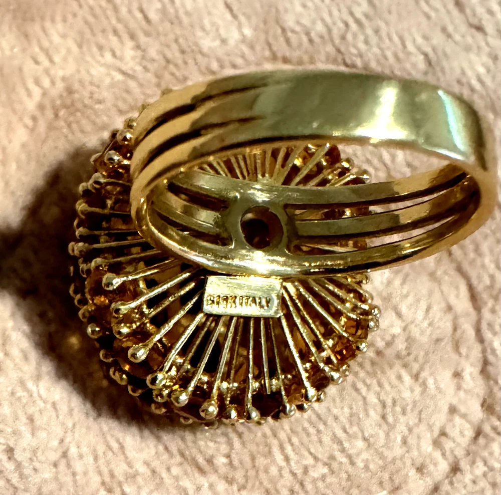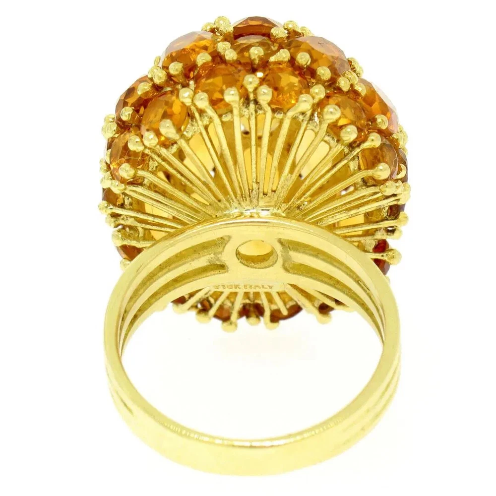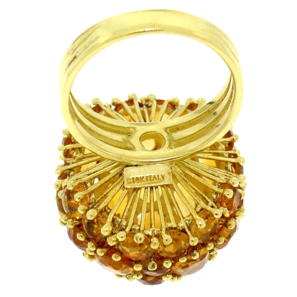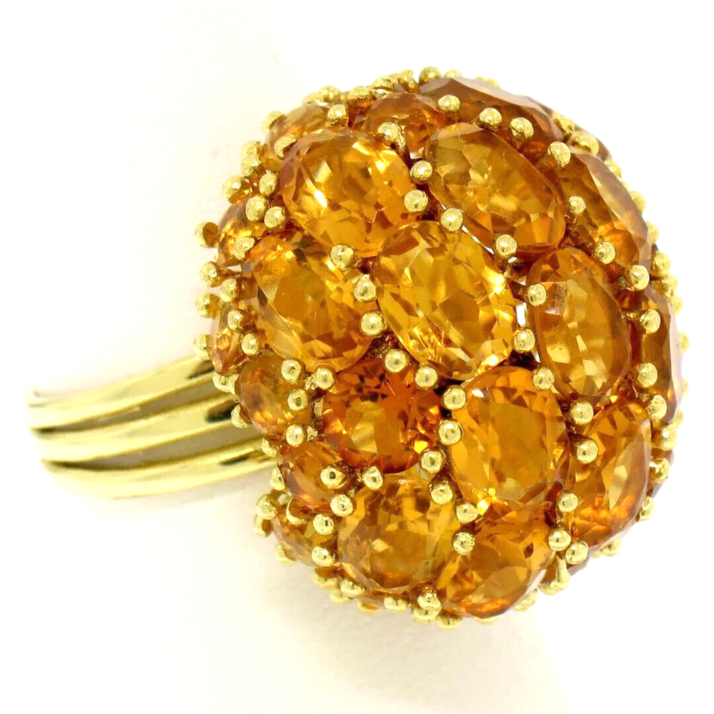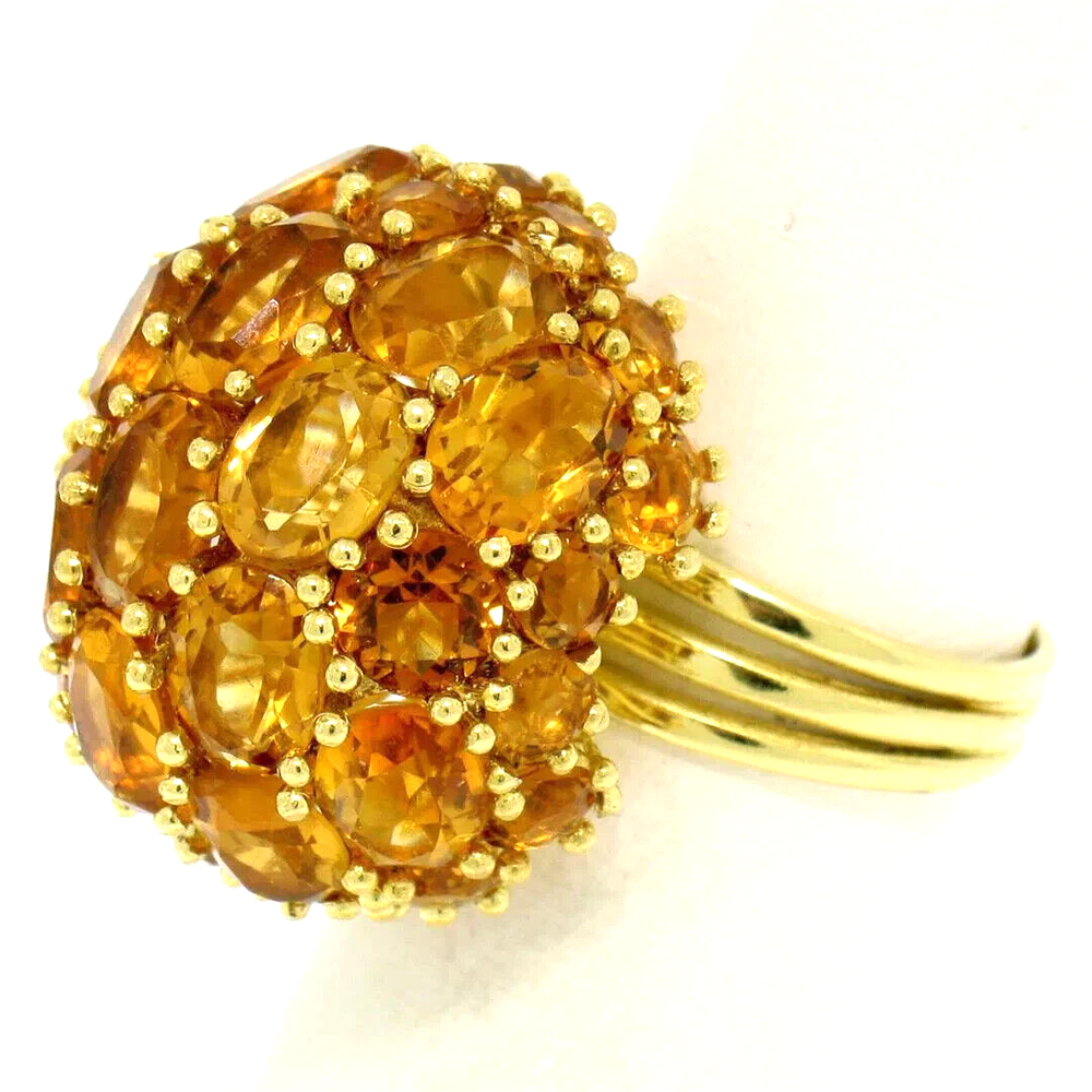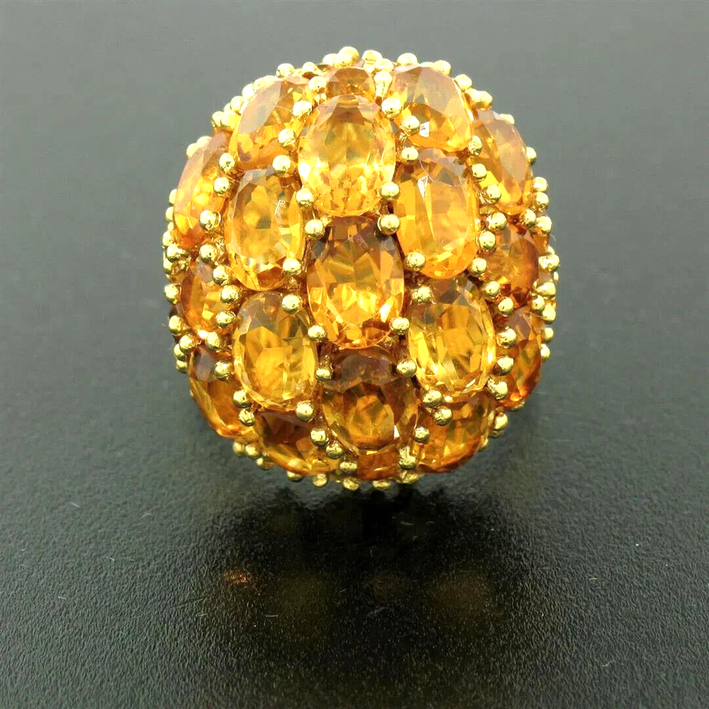 Beautiful Oval & Round Citrine Large Dome Cluster Cocktail Ring in 18K Yellow Gold This item is Handmade, one of a kind. Total Carats: 19.0ctw Material: 18K Solid Yellow Gold Ring Weight: 14.0 Grams Stone 1 - Number of Stones: 17 Natural Genuine Citrine: Total Carat Weight: 14.50ctw - Oval Cut - Prong Set - Golden Orange Color Stone 2 - Number of Stones: 20 Natural Genuine Citrine: - Total Carat Weight: 4.50ctw (approx.) - Round Cut - Prong Set - Golden Orange Color Ring Size: 7.0 Ring Width: 24mm Ring Height: 17mm rise off the finger Handmade, one of a kind. Condition: Excellent Condition