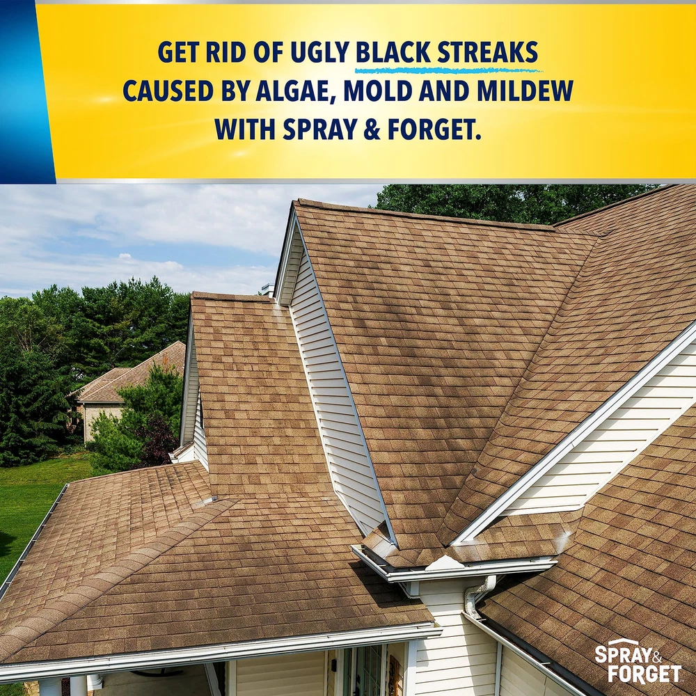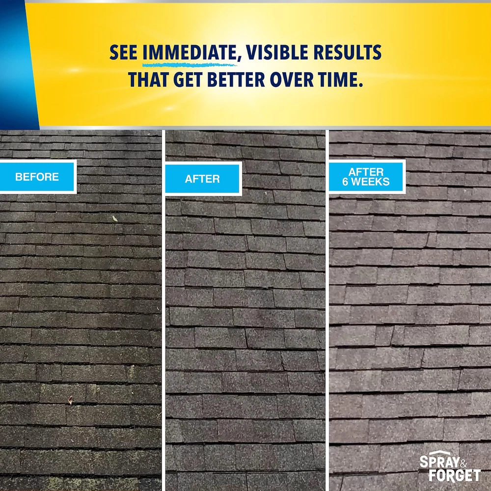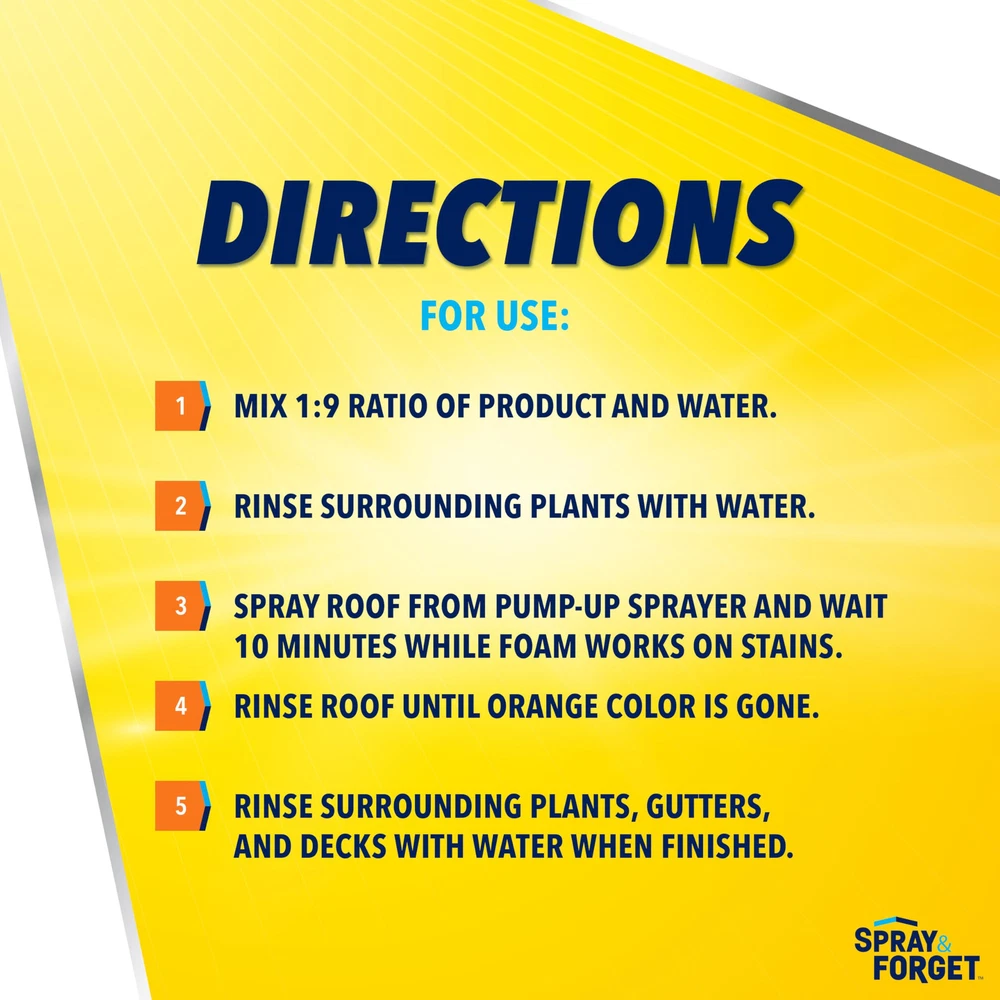 Clean up your roof with Revolutionary Roof Cleaner Concentrate. This roof cleaner uses a fast-acting formula that effectively removes stubborn black streaks and other stains caused by algae, mold and mildew – delivering results in minutes, not weeks! Packed in a 1-gallon bottle, this concentrate can make up to 10 gallons of cleaning solution – enough to cover 1000 to 2000 square feet*. is an ideal roof cleaner for asphalt shingles, wood shingles, slate shingles, clay shingles and tile shingles. DIRECTIONS FOR USE: 1) Mix 1:9 ratio of product and water. 2) Rinse surrounding plants with water. 3) Spray mixture from pump sprayer on roof. 4) Wait 1 minute while foam works on stains. Most stains will turn orange when cleaning. 5) Turn nozzle to “RINSE” and spray until orange color is gone for more immediate results or allow rain to rinse over time. 6) Repeat if necessary (darker stained roofs may need multiple applications). 7) Rinse surrounding plants, gutters and decks with water when finished. Use only as directed. For outdoor use only. Inspect roof prior to stepping or walking on. Make sure it is dry and clear of debris. Avoid with eyes and skin. Use eye protection and resistant gloves when applying. Wash thoroughly with soap and water after handling. * Results may vary depending on soil level. REMOVES STAINS & BLACK STREAKS: Revolutionary Roof Cleaner Concentrate effectively removes stubborn black streaks as well as other stains caused by algae, mold and mildew. WORKS FAST: This bleach and phosphate-free concentrate works fast so you get results in minutes, not weeks! FOR USE ON SHINGLES including asphalt, wood, slate, clay and tile. COVERS A WIDE AREA: Roof Cleaner Concentrate can make up to 10 Gallons of cleaner solution – enough to cover 1000 - 2000 square feet. * EASY TO USE: Just mix 1:9 ratio of product and water. Spray mixture onto roof and wait 1 minute for foam to lift and turn stains orange. Rinse for more immediate results or allow rain to rinse over time. Not all stains will turn orange.