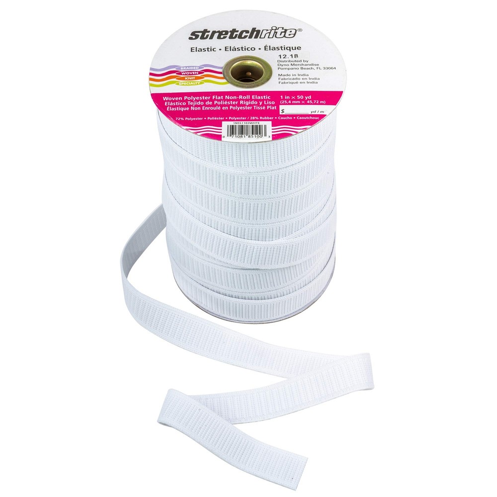 Each spool contains 50 yards of white elastic measuring 1-inch wide 72% polyester and 28% rubber Elastic is perfect for waistbands in skirts, slacks, shorts and pants Ribbing prevents rolling and adds body to waistband construction Stretches easily and resumes its original shape and length