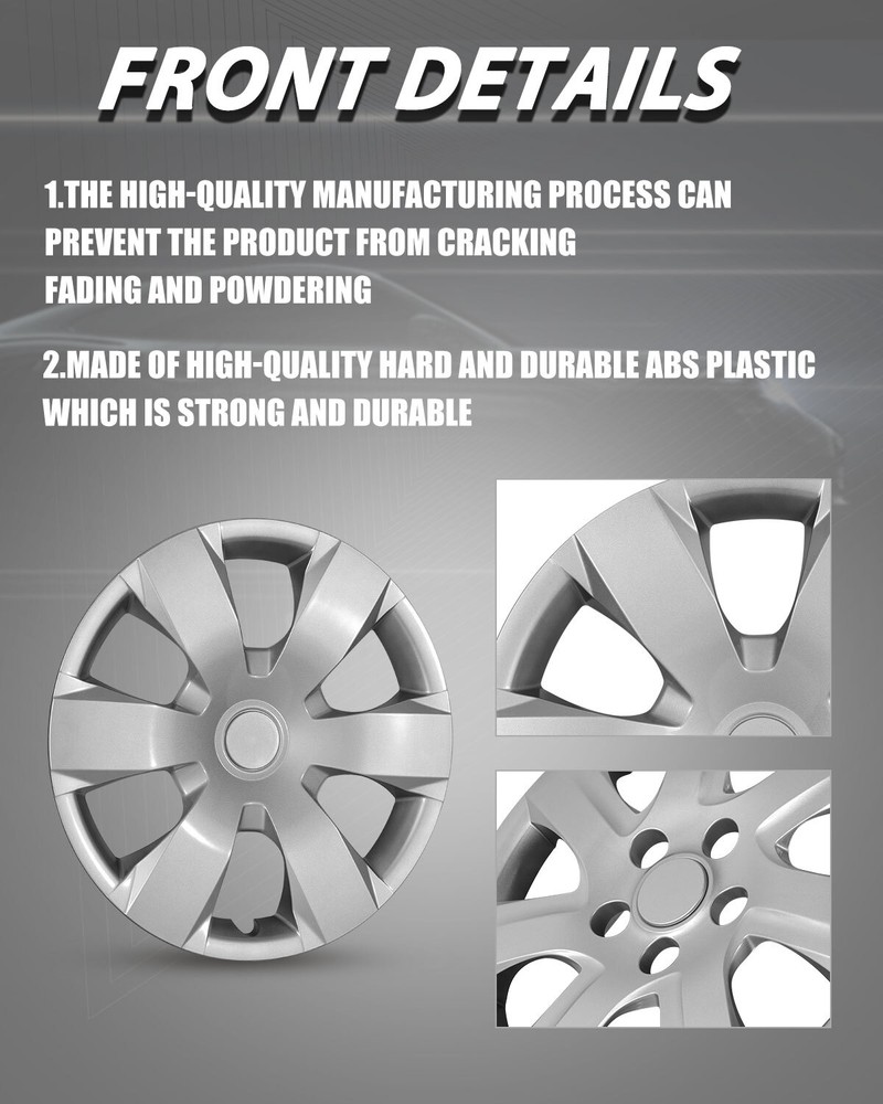 Store Categories Other Car Refrigerator Front Bumper Rear Bumper Fender Flares Inner Fenders Side Steps Running Board A-Pillar Light Mount Brackets Headlights Taillights Fog Lights LED Headlights LED Taillights LED Fog Lights Jeep Chevrolet Ford Toyota Dodge GMC Wheel Covers Features ✴ PERFECT FIT: This wheel hub cap is specifically designed to perfectly fit for 16-inch wheels, ensuring a seamless match and enhanced aesthetics. It complements the overall design of the vehicle, elevating its visual appeal. ✴ HIGH-QUALITY MATERIAL: Constructed from high-quality materials, this wheel hub cap guarantees durability and longevity. It withstands various road conditions and environmental factors encountered during daily driving, maintaining its pristine condition. ✴ EASY INSTALLATION: Installing this wheel hub cap is a breeze and requires no specialized tools or modifications. It comes with a user-friendly system, allowing for a hassle-free installation process by following the provided instructions. ✴ PROTECTIVE FUNCTION: Besides its aesthetic appeal, this wheel hub cap serves as a protective barrier for the wheels. It prevents scratches and potential damage caused by stones, debris, or other objects, safeguarding the wheel's surface. ✴ AFTER-SALES SERVICE: If There Is a Loss of Product Parts, or Any Parts of The Problem, We Can Provide After-Sales Service, Please Contact Us on The Order Page. Wheel Covers Specification ✴ Type: Hub caps ✴ Number in Pack: 1 ✴ Color: Silver Lacquer ✴ Material: ABS ✴ Compatible Wheel Diameter: 16 in ✴ Finish: Glossy ✴ Installation Type: Snap-On ✴ Model: For 2007-2011 Toyota Camry / For 2007-2011 Toyota Camry Hybrid Wheel Covers Package ✴ 1 Hub cap and 1 retention ring Payment Delivery details Terms of sales About us Contact us Payment We accept PayPal, credit card , Apple Pay & Google Pay etc. Delivery details All items will be shipped within 1-3 business days after payment received, we will try our best to ship out as soon as we can, hope for your understanding. Please double confirm your address and contact information, which will help the delivery faster and more accurately. Note :buyers who purchase international products need to pay import tariffs!!! Terms of sales Professional installation is highly recommended. Any problem of the item please feel free to contact us first , please D o Not leave negative feedback before that, or simply return it within 60 Days in original condition. We will resolve it for you ASAP. About us Any questions please do not hesitate to contact us directly by eBay message . We will reply you within 24 hours asap, thanks for your understanding. Contact us Should you have any problem or require any further information please feel free to contact us . If you are satisfied with our product and service, please kindly leave us a positive feedback. Popular Categories On Mar 14, 2025 at 20:35:13 PDT, seller added the following information: