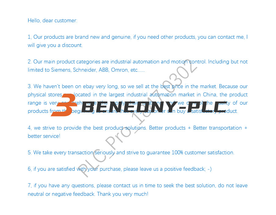 Product Description 1. We can provide new or used products to meet your requirements. Discount for inquiry. 2. There are a lot of goods for sale, we didn't list all of them in the store, if you can not find the product you need in our store, please contact us. Payment Method We accept payments only from verified accounts with a confirmed address from the payment holder. Delivery Details We ship all items using Speedpak,DHL, FEDEX express global shipping services. Items will be shipped within 2-7 business days after receiving cleared payment. If you choose expedited shipping, the delivery typically takes only 4-5 business days after shipped. Please provide your phone number to ensure timely delivery. For locations not included in our standard shipping areas, we offer international shipping services; please contact us for detailed shipping information. Please Note Import duties, taxes, VAT, and charges are not included in the item price or shipping cost. These charges are the buyer's responsibility. Return Policy We accept returns for exchange or refund within 30 days. If you are not satisfied with the item upon receipt, you may return it for a refund or exchange within 30 days, but you will need to pay for the return shipping. costs and ensure that the item remains in the condition it was in when shipped. Please contact us before returning an item. About Our Shop All products sold in our store are authentic and come with a 3-month warranty. Due to the wide variety of models, we cannot list all of them online. If you cannot find the product you need in our shop, please feel free to contact us. Your satisfaction is our pleasure. If you are satisfied with our products and services, please leave your positive feedback. We will also provide you with a 5-star review. Contact Us Feel free to contact us at any time. You can send us a message by clicking on the "Contact Seller" button on Payment Policy Shipping Policy Returns Policy About Us Payment Policy We accept all major credit cards through PayPal. We accept payments only from verified accounts with a confirmed address from the payment holder. Shipping Policy We ship all items using Speedpak,DHL, FEDEX express global shipping services. Items will be shipped within 2-7 business days after receiving cleared payment. If you choose expedited shipping, the delivery typically takes only 4-5 business days after shipped. Please provide your phone number to ensure timely delivery. For locations not included in our standard shipping areas, we offer international shipping services; please contact us for detailed shipping information. Returns Policy We accept returns for exchange or refund within 30 days. If you are not satisfied with the item upon receipt, you may return it for a refund or exchange within 30 days, but you will need to pay for the return shipping. costs and ensure that the item remains in the condition it was in when shipped. Please contact us before returning an item. About Us Our company was founded in 1995 and has nearly 30 years of industry experience. Operating various types of industrial products, mechanical modules. The company has a technical team of nearly One hundred people , which can provide customers with the best service Copyright © 2023 Dianxiaomi