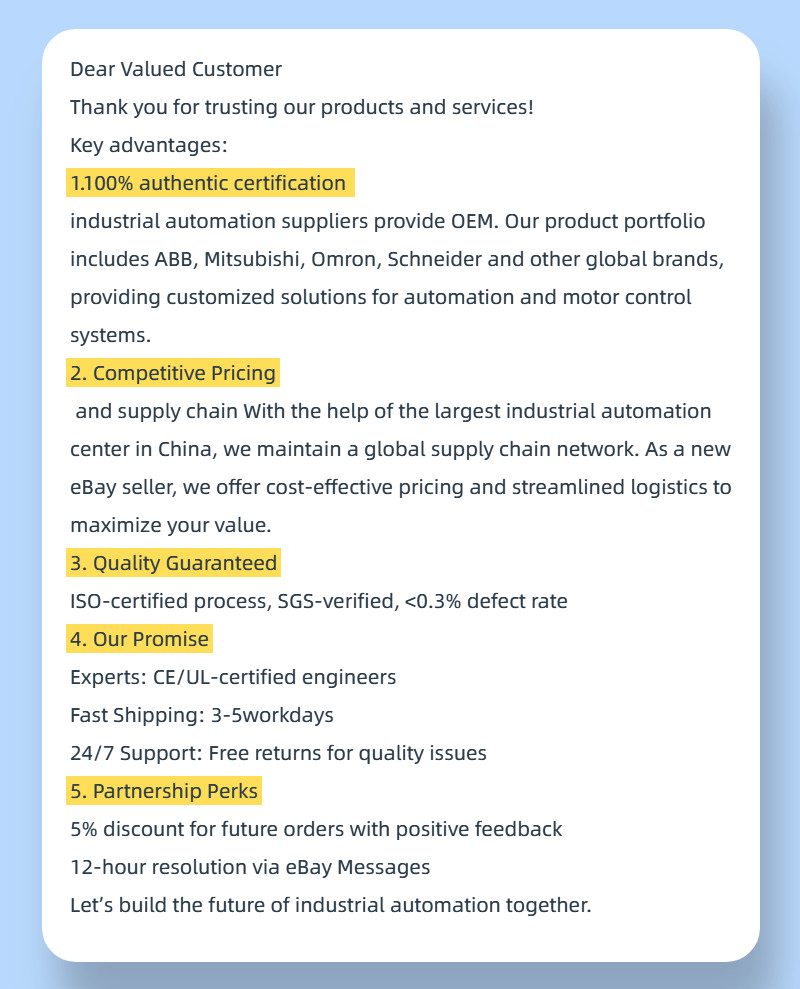 Sell a variety of PLC series Product Description Welcome to visit my shop My shop sells:Allen-Bradley, PRO-FACE, Keithley, Siemens, beckhoff, wago, Cisco, Huawei, H3C, Omron, Mitsubishi Yaskawa, FANUC, EMERSON, B&R, Schneider If you need other models, you can leave a message to me at the store, and our customer service team will reply you within 2 hours Payment Policy Shipping Policy warranty Payment Policy We support pay, credit card, bank card and other payments Shipping Policy Dear buyer hello As long as all products purchased in our store will be quickly delivered by UPS/DHL/UPS warranty If it is a brand-new sealed product warranty for one year, if it is a used product warranty for 6 months Copyright © 2023 Dianxiaomi