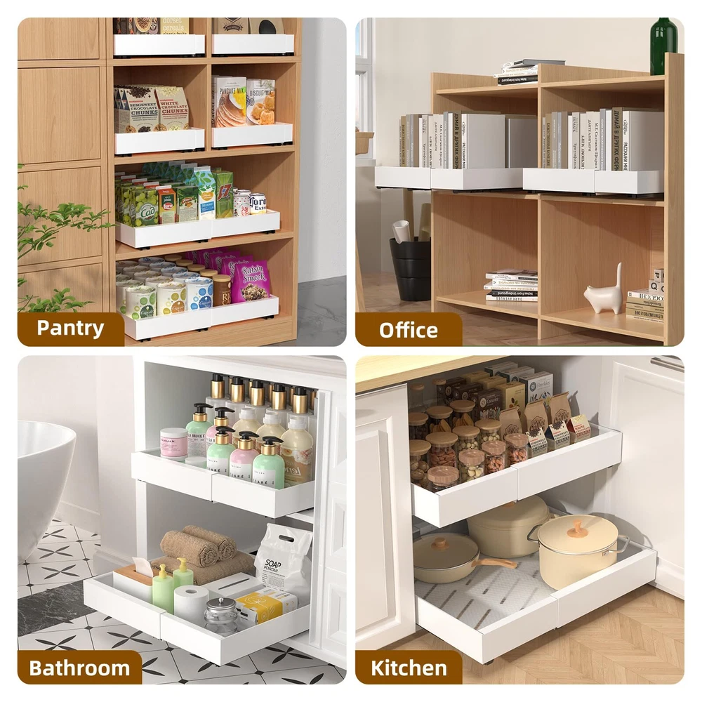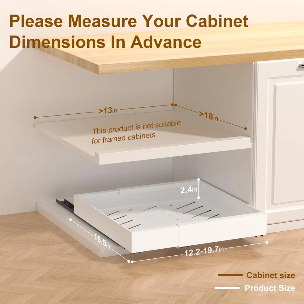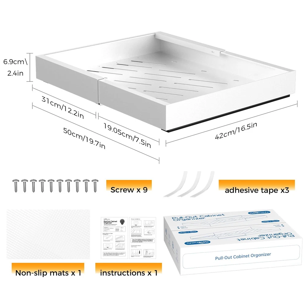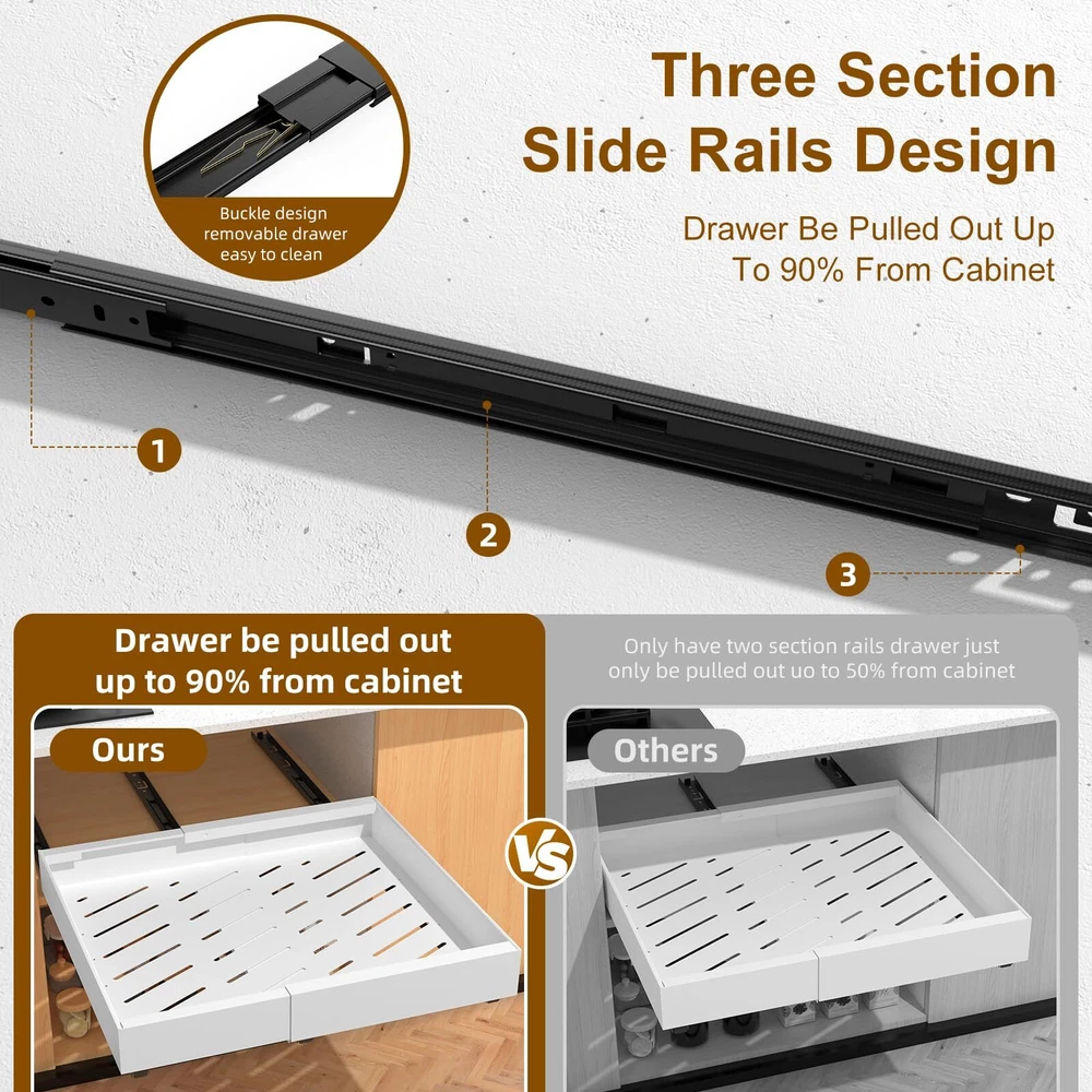 Anti-slip design: Unlike traditional pull out drawers for cabinets on the market, is equipped with anti-slip protective drawer mats, which effectively protects kitchen drawers from falling down when pulling out items when in use. New design pull-out cabinet organizer : The pull-out cabinet organizer has three slide rails are more stable when using it, and it has stronger weight capacity. Very stable and long-lasting, and the rails be slided smoothly without jarring noise. And It is three section slide rail design, the drawer can be pulled out of the cabinet completely, more convenient to use Removable Drawer Design: Buckle design, the rails can be slided out, the drawer can be removed and more easier to clean. Just move the plastic buckle to the left simultaneously inside the three slide rails.(Tips: Two people are required, it need to slide the drawer out of three rails simultaneously) Extendable Design: Our pull out cabinet organizer is made of high quality rustproof carbon steel. With an extendable design can be adjusted to fit different kitchen cabinets. Size is 16.5" depth *2.3" height, and from 12.2" to 19.7" in width. So you can adjust the slide out drawers width for kitchen cabinets as you need Easy to Install and Maintain: The pull out cabinet organizer fixed with adhesive nano tape and screw. We offer 3 pcs Nano tape and 9 pcs screw.(Tips:Not suitable for frame cabinet). The pull out cabinet organizer has many holes, drainage design is convenient to clean and maintain Widely Use: The pull out cabinet organizer offter more easier storage method, pefect for kitchen cabinet, small appliances, pots, pans, various seasonings and canned goods. Even suitable for pantries, bathroom daily necessities and cosmetics storage, bedroom closet underwear storage and office document storage, offering versatile storage