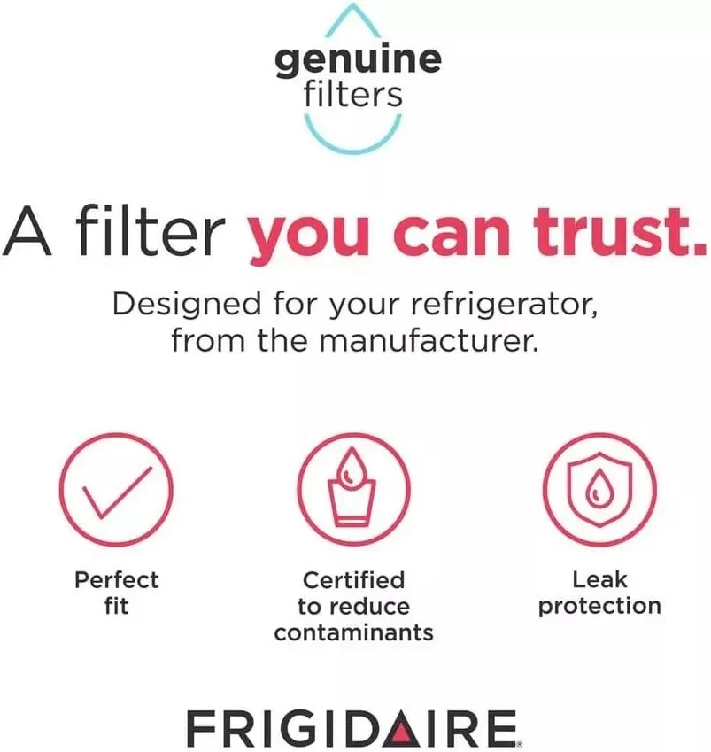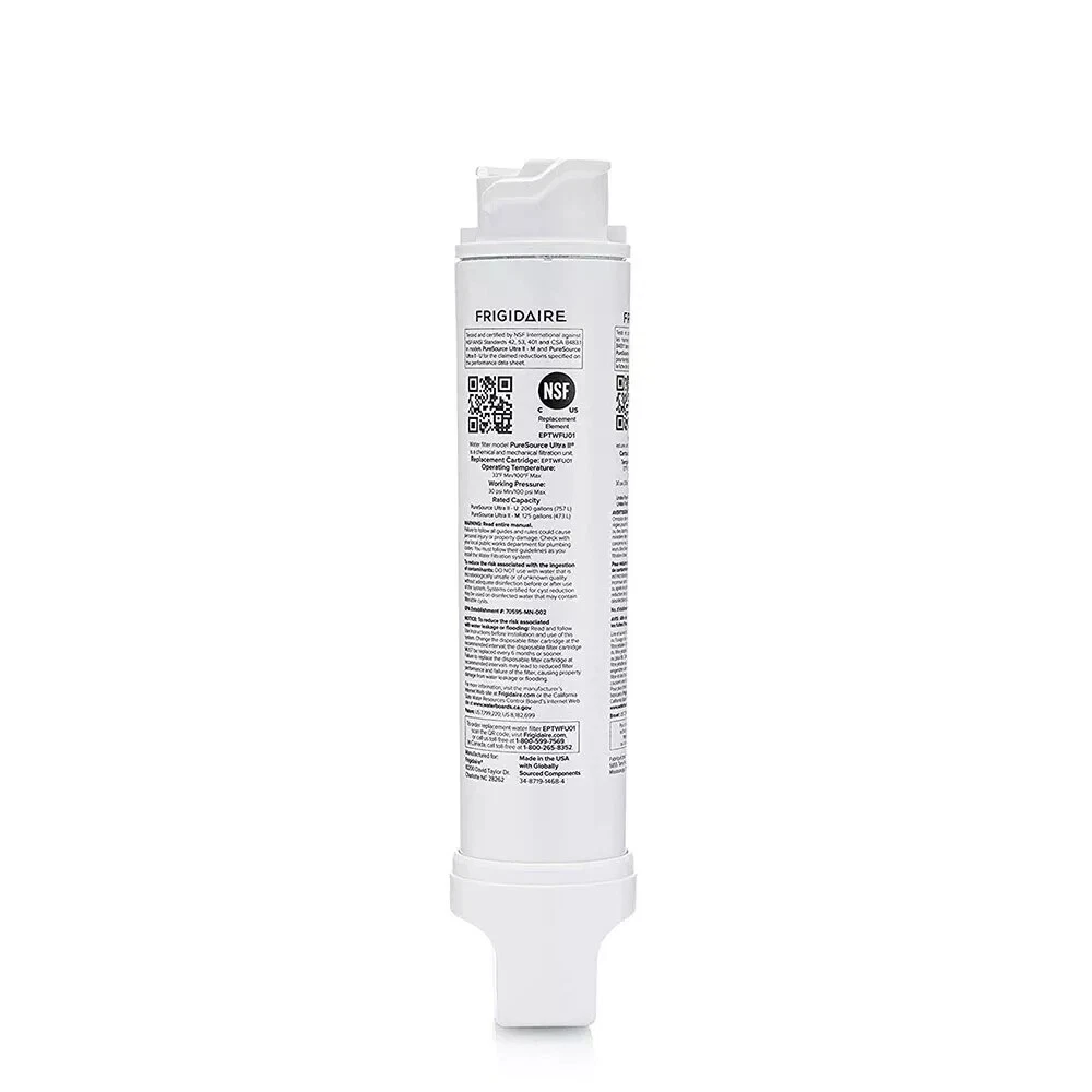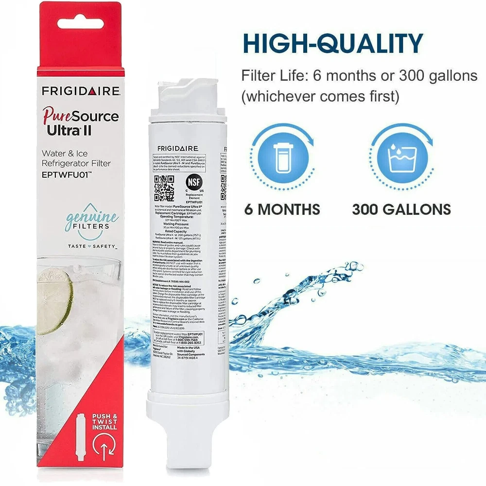 Please note: this filter is EPTWFU01 , NOT FPPTWFU01 Make safe water second nature: Certified to reduce contaminants and keep great tasting water flowing for you and your family Filters out up to 99% of contaminants. Push and twist easy install: Always review your use and care guide before installation, to install slide new filter in with grip oriented horizontally. Push firmly and turn 90° to the right until it snaps into place NSF 42, 53 and 401 certified to filter out contaminants: Tested and certified by NSF International against NSF/ANSI standards 42, 53 and 401 in PureSource Ultra II – U and PureSource Ultra II – M for reduction of claims on the performance data sheet Features High quality, affordable activated carbon filter replacement for: Frigidaire Filter Model/Part Numbers: EPTWFU01, EPTWFU01C, EWF02 4562222 012505454226 Compatible with refrigerator model numbers: FPBC2277RF, FPBC2277RF0, FPBC2277RF1, FPBC2277RF2, FPBC2277RF3, FPBC2277RF5, FPBG2277RF, FPBG2277RF0, FPBS2777RF, FPBS2777RF0, FPBS2777RF1, FPBS2777RF2, FPBS2777RF3, FPBS2777RF4, FPBS2777RF9, FPSC2277RF0, FPSS2677RF0 Will fit and lock in all compatible refrigerators. Will not leak! Guaranteed or 100% money back. Long lasting up to six months or 300 gallons. Tested and certified by Iapmo R&T to NSF/ANSI Standard 42. Details Package Dimensions: 9.1 x 2 x 2 inches Item Weight: 7.7 ounces Shipping Weight: 7.7 ounces Manufacturer: Clearwater Filters Installation Instruction: 1.Shut off water source 2.Remove the existing filter by turning it left,and then take it out 3.Remove the cap of a new filter,insert it into refrigerator and turn right to lock it in place 4.Recover the water source,and check it there is leakage 5.Run the working press for 4 minutes(about 8 cups of water )for purge6 reset replacement indicator light by pressing the ICE TYPE button and the CHILD LOCK(or MOISTURE CONTROL)button simultaneously for 3 seconds