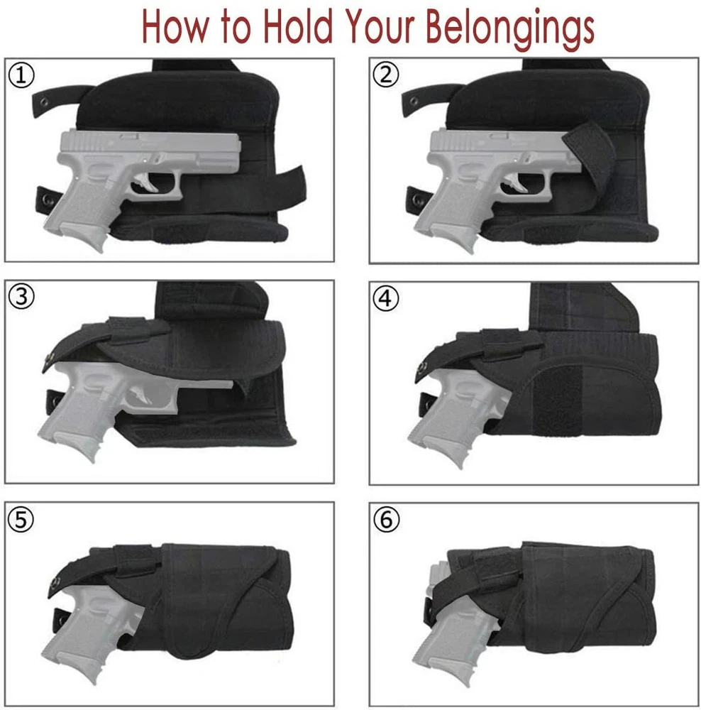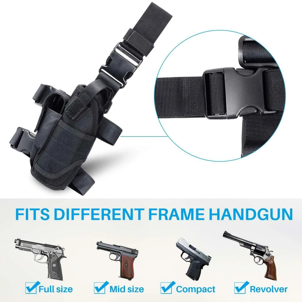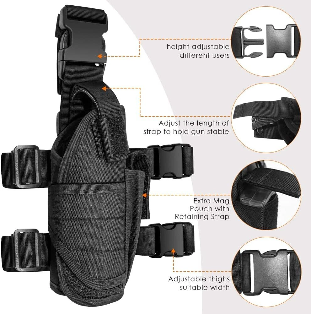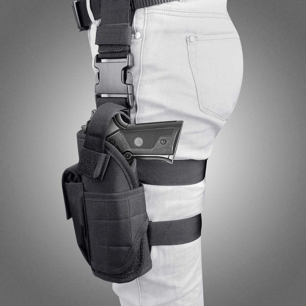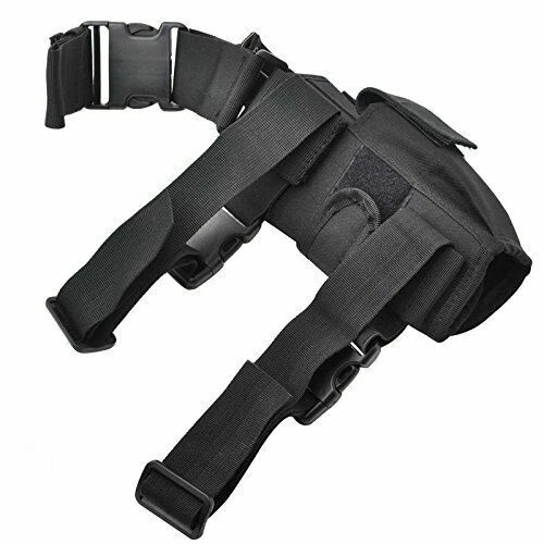 Product Description You may want to take your weapon with you while you hike. Sometimes a waistband holster just doesn't cut it. You may want to carry extra items like spare mags, a flashlight or tactical knife. Normally worn by military or outdoor types, the drop leg holster is great for lots of movement, and little person interaction. Drop leg holsters are primarily a military item that were designed for the battlefield. The point is to disperse your necessary equipment over a larger part of your body, making it easier to carry. Additionally, a drop leg holster makes it much easier to draw your firearm.It also comes into its own when you're wearing a rappelling harness. There is no point in extending your draw stroke and adding unnecessary weight to your legs (when your hips are better at carrying it) unless you're going to gain something from it. This style of holster definitely has distinct advantages, but they will only be realized when used in the right circumstances. Description: Type: Drop Leg Holsters Material: Nylon Size: 105mm x 50mm x 565mm Package: 1 x Holster(Left) 1 x Holster(Right) Specification: Used to hold handgun, pistol & revolver Can be attached in the wrist belt and fasten to the leg Fully adjustable wrap-around design for additional fit and security Adjustable non-slip leg straps minimize movement and provide maximum comfort Quick release buckle and Velcro strap make this holster fully adjustable Ideal for military, law enforcement, hunters, home /self defense and more How to Install Step 1 Take it out and hold your belongings. Step 2 Connect it to your belt and put onto your thigh. Step 3 Connect the two interface and buckle.