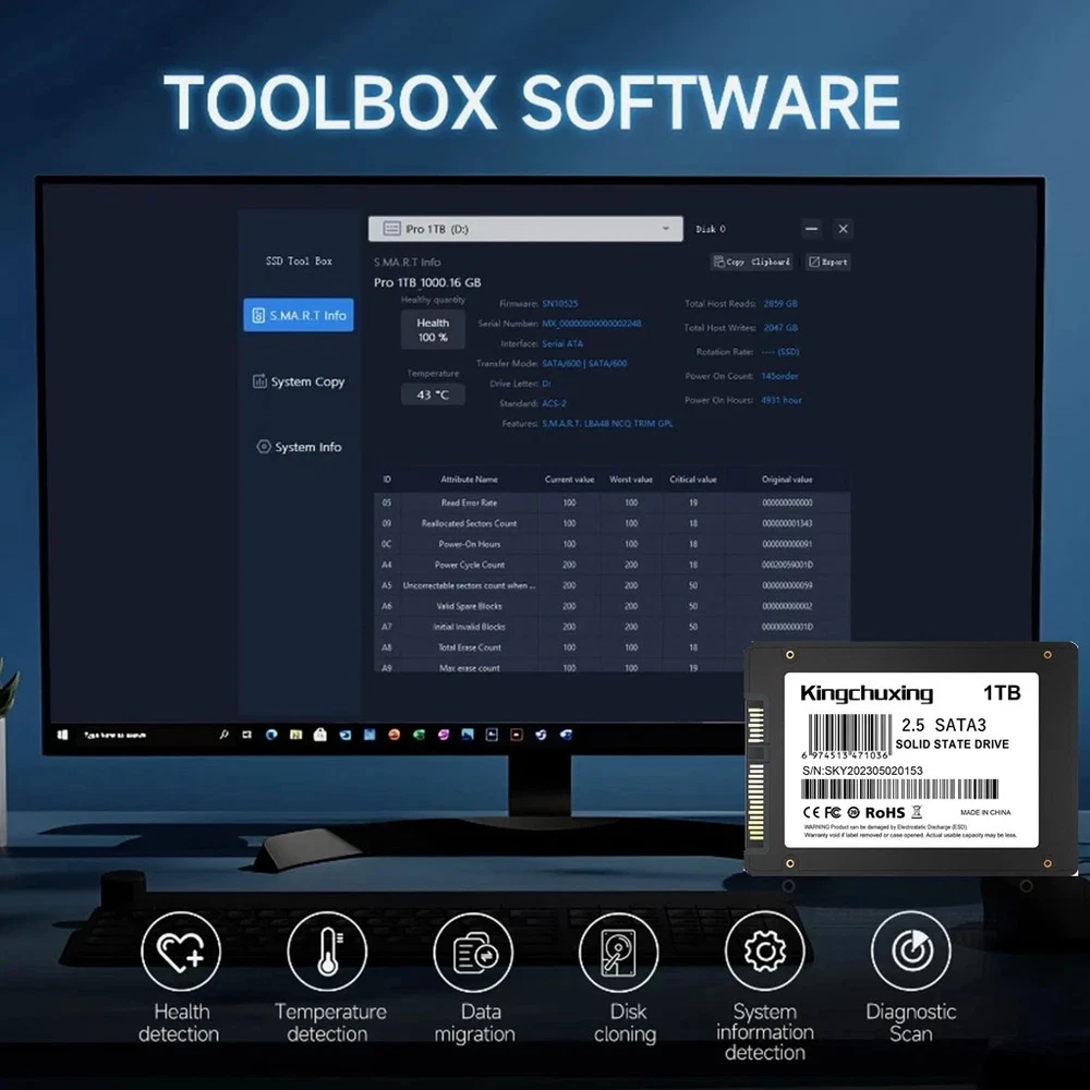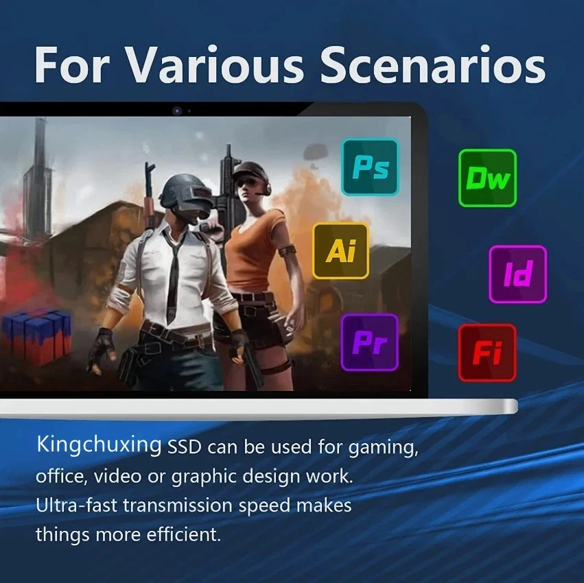 Solid State Disk Introduce: Physical dimension: 2.5 Inch(100mm×70mm×7mm) Product Model: SATA 2.5" Interface: SATAIII、SATAII、SATAI Application: Desktop、Laptop、Ultrabook、Computer integrated machine Features:quickness、stabilization、energy-saving、Mute、Light weight SSD Capacity: 1TB System support: Windows xp、windows 7、Windows8. 1、Windows 2003、Windows 2008、DOS、Linux、Unix. Warranty: 3 years Application scenario The 2.5 interface compliance for mostly desktop and laptop. Performance Testing There are differences in the read and write speeds of different capacities, different windows version or computer model still have speed differences, so please treat them rationally. In most times the speed of laptop should be lower than Desktop.
