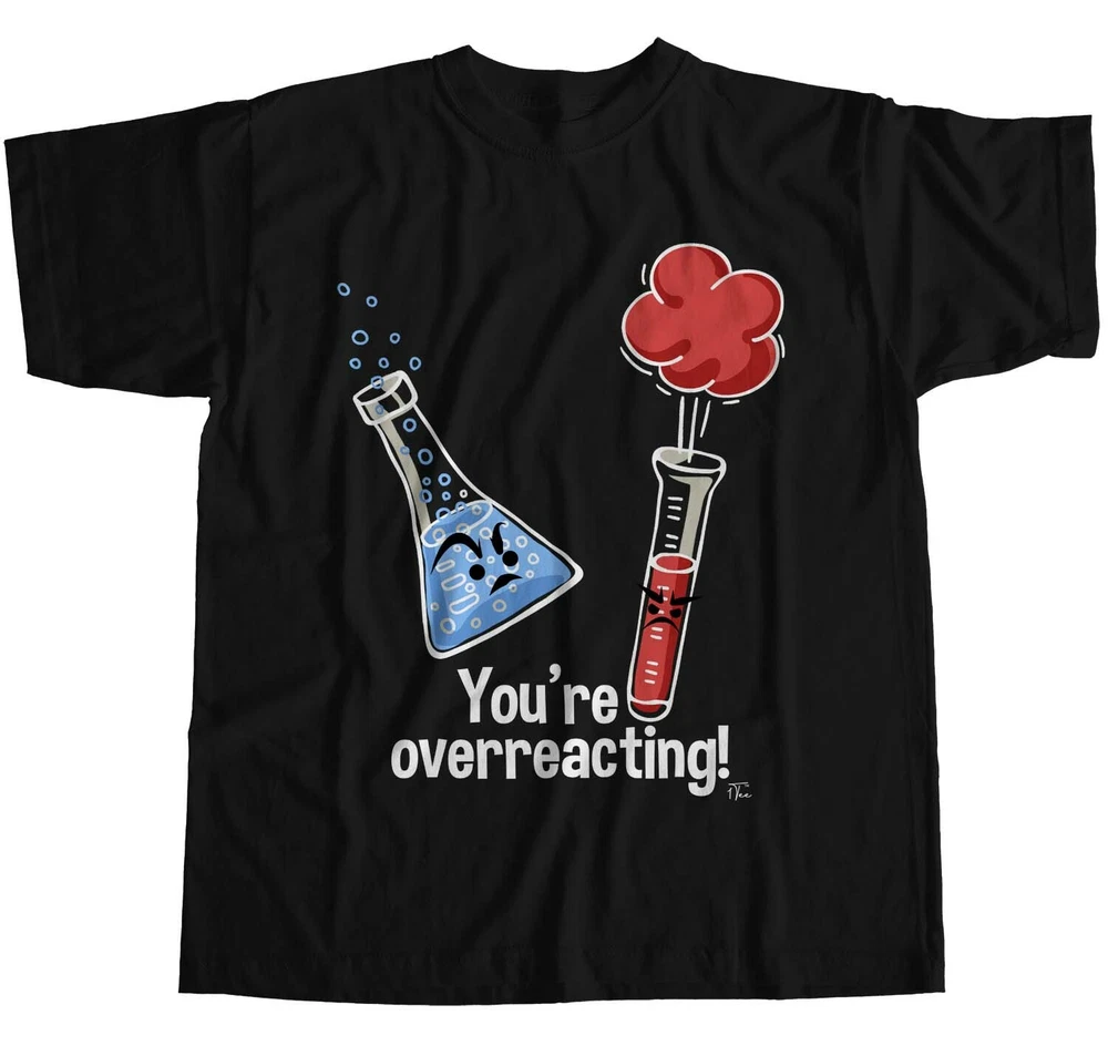 1Tee Womens Loose Fit You're Overreacting Chemistry Science T-Shirt This t-shirt is perfect for every chemist and scientist. Feauturing a funny illustration of two flasks who think the other is overreacting. - Womens Loose fit t-shirt - Soft ringspun cotton - Short Sleeves - Available in sizes: S, M, L, XL, 2XL, 3XL, 4XL, 5XL - Beautifully made t-shirts for you to enjoy - Fully machine washable whilst retaining shape, feel and quality - Iron inside out to prolong the life of the t-shirt We use the latest printing technology to ensure prints will not fade or crack after washing. Returns / Exchanges If you need to exchange or return for a refund please do not hesitate to contact us, we offer a 30 day returns policy, all we ask is the t-shirt is not worn.