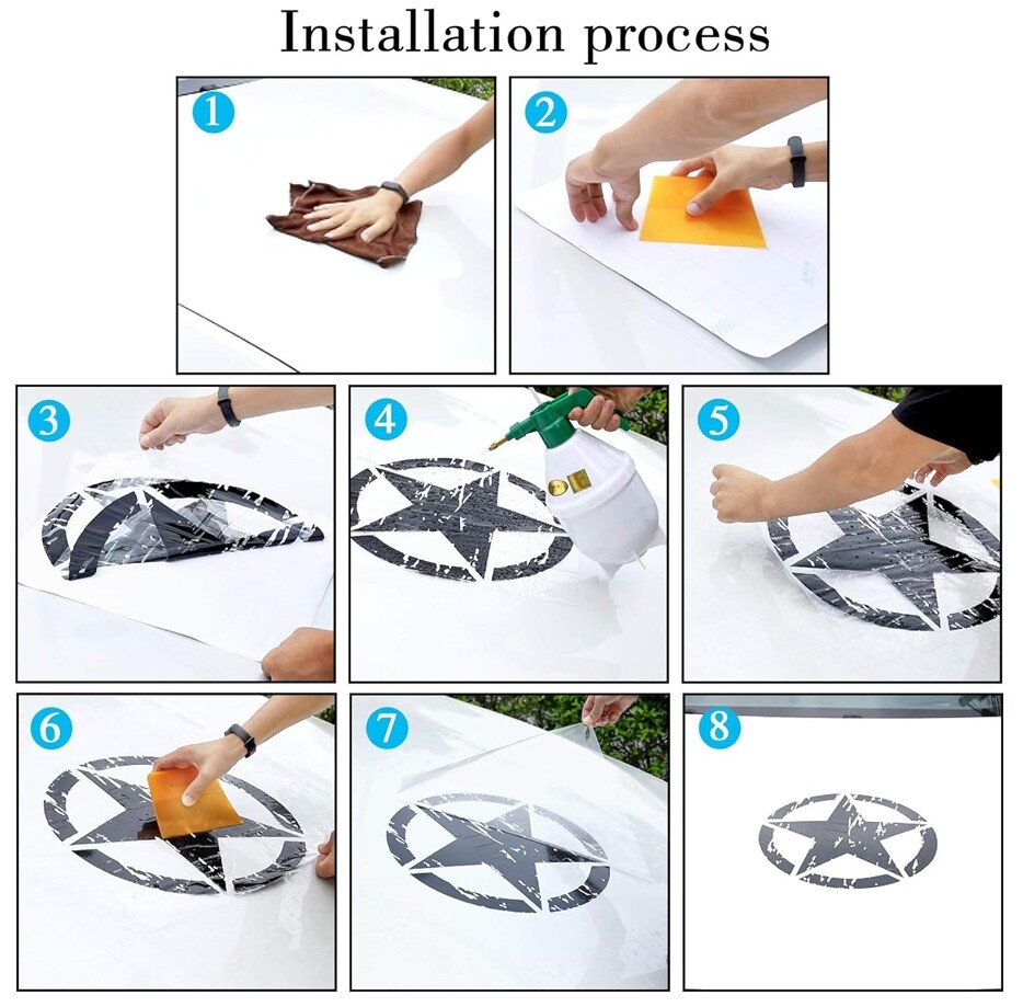 Material: Vinyl Size: 19.68" x 19.68" Package includes: 1 pcs of sticker Material: Vinyl Size: 19.68" x 19.68" Package includes: 1 pcs of sticker Installation steps for large car stickers, wet stickers, suitable for large car stickers (two-person operation is recommended) (If you are not sure about the paste, it is recommended to go to the decoration shop to ask the master for help.) Wet stickers tools: watering can, detergent, clean rag , Scraper, utility knife, hair dryer (with a small amount of detergent in the water) 1. After cleaning the body, spray water with a watering can on the body part to be pasted (mainly used to reduce the viscosity of the sticker and facilitate adjustment of the position). 2. After determining the position to be pasted, lift the transfer film (the transparent adhesive film pasted on the car sticker) and the car sticker from right to left (or from top to bottom) to one side and press it on the car with a rag. On the table, then stick it, flatten it with a rag, and peel off the bottom paper. 3. In case of door handles or anti-collision strips, the materials should be cut and wrapped or cut off according to the situation. 4. Adjust at the right time to determine the general position of the graphics. Use a scraper to repeatedly scrape off water and air bubbles. When using the scraper, scrape diagonally from right to left, and then tear off the transparent transfer film 5. Use a utility knife to separate the door and the seam evenly, and paste it inside. 6. Try to make the moisture in the car sticker dry, and if possible, use a hair dryer to heat and dry it. When the car sticker is to be removed, use a baking gun to heat it in the car wash shop, and then tear it off directly without leaving an offset print and not hurting the paint. Brand Unbranded Universal Fitment Yes Manufacturer Warranty 3 Months Country/Region of Manufacture China Theme Star Placement on Vehicle Front, Hood, Left, Rear, Right, Side Suitable For Car, Van Material Vinyl Type Body Decal