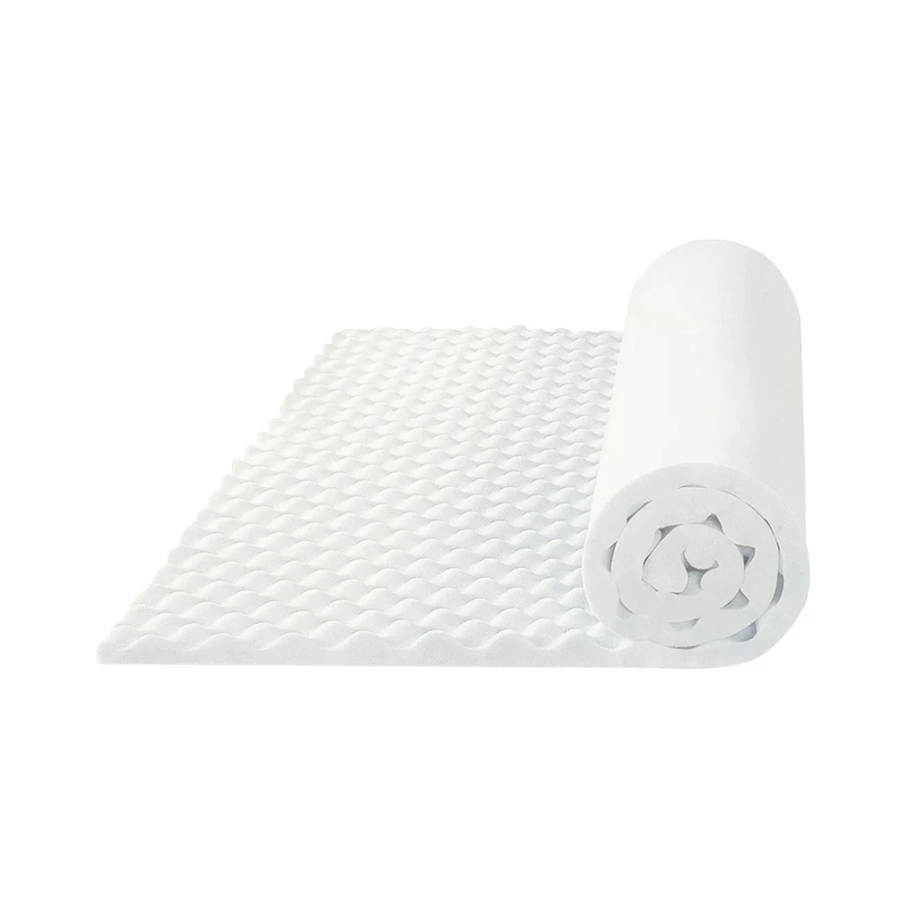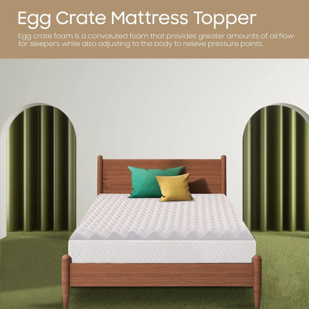 The premium foam adds luxurious softness while not taking away from the support of the mattress. These bed toppers have been effective in enhancing the comfort level of new and old mattresses alike, providing a better sleep experience for most people. This Convoluted Egg Shell Breathable Foam Topper is made from good quality foam that gently cradles you in individualized comfort and support. It also provides you with pressure-relieving cushioning in the hip and shoulder areas while still supplying enough support, so the body doesn't get imbalanced. These unique mattress toppers are to be used on top of your mattress for additional comfort. This prevents your body from sinking and curling while sleeping and promotes a better posture, which reduces and strain on your spine and increases energy levels during the day. Our premium-level mattresses are here to help you get the best possible comfort at all times when you sleep or lie down to relax. Pressure : The convoluted design of the foam helps to distribute weight evenly, which can help reduce pressure points on the body. This can be particularly helpful for people who suffer from joint pain or other conditions that make it difficult to get comfortable in bed. Increased comfort: The convoluted design can also make the mattress topper feel softer and more comfortable, which can lead to a more restful night's sleep. CertiPUR-US certified foam: Rest easy knowing that the topper's foams are CertiPUR-US certified, meeting stringent standards for durability, performance, and content. Quality you can trust. Motion isolation: The convoluted foam design can help to absorb movement, which can be helpful for people who share a bed with a partner. This can prevent motion from transferring across the bed and disturbing the other person's sleep. Versatility: Convolute foam mattress toppers are making them versatile and suitable for use with different types of mattresses. Toppers can be used on a variety of surfaces, such as futons or camping cots, to provide extra cushioning and comfort.