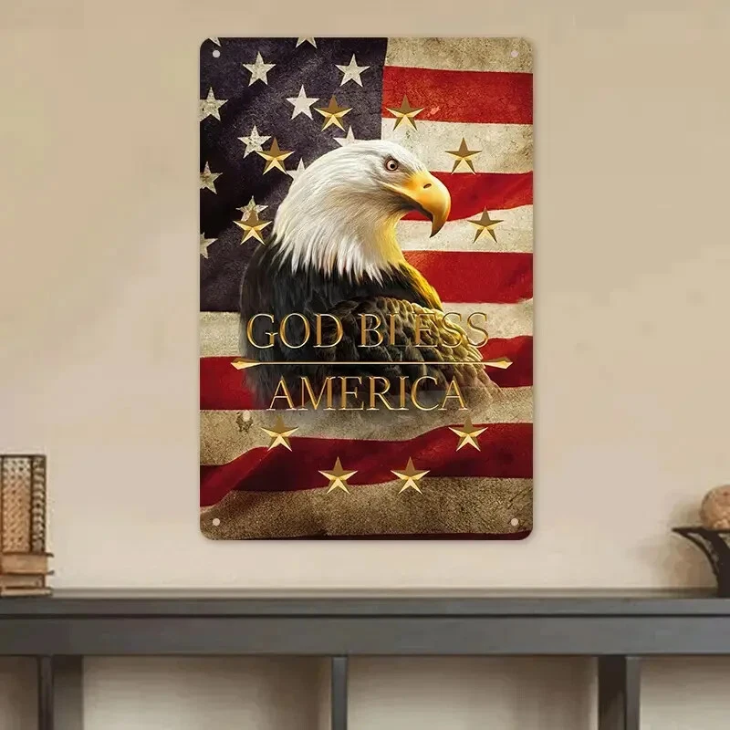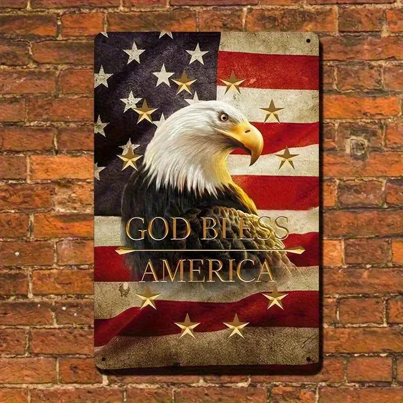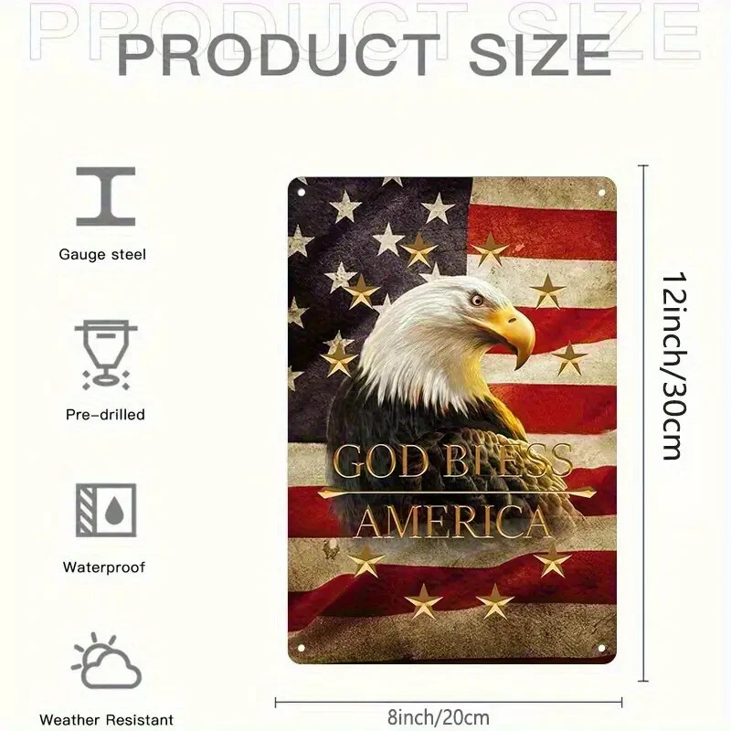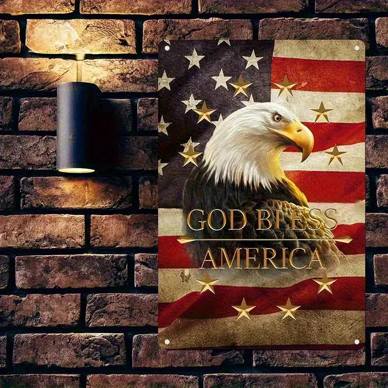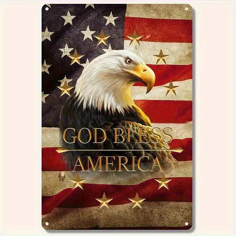 2D Flat, 1pc Retro American Flag & Eagle Metal Wall Art Sign - 8x12 Inch Patriotic "God Bless America" Quote, Durable Iron Vintage Home Office Decor, Wall-Mounted Rustic Room Decoration, American Flag Decor, Classic Americana Style, Highquality Craftsmanship, Americana Collectors Material: Aluminum Recommended Usage: Multipurpose Mounting Type: Door mount/ Wall hanging Frame Type: Frameless Thickness: 0.2 inch Power Supply: Use Without Electricity Size: Each metal tin sign measures 8x12 Inch . This United States of America Sign Makes a Great Gift To Any Parotitic American or Military Veteran Features and materials: These signs are made from high-quality metal tin and are produced as a single unit. Durable Construction: Crafted from high-quality metal, this sign is built to withstand indoor and outdoor conditions without fading or rusting. Wall Mountable: Equipped with pre-drilled holes, this sign can be easily mounted on walls, fences, or any desired surface for display. Decorative Appeal: With its eye-catching color scheme and retro aesthetic, this sign adds a unique touch to any living space Each vintage sign displays artistic graphics, highlighting a classic and sophisticated style, and includes pre-drilled holes for convenient mounting. This retro metal plaque is ideal for use inside and outside, suitable for anyroom like guest, living room, bathrom, restroom... outdoor or indoor... Care tips: Do not wash the metal tin sign by hand; rather, use a moist cloth to keep the colors bright. An excellent idea for a gift: Retro metal signs are wonderful options for your friends, family, significant other, or even for yourself during celebrations such as birthdays, Christmas, Thanksgiving, holidays, Father's Day, Mother's Day, anniversaries, Valentine's Day, and beyond. Perfect Gift on Holiday like birthday,Valentine’s Day, Independence Day, Labor Day, Halloween, Veterans Day, Thanksgiving Day, Black Friday, Christmasday, New Year Day, Easter Day, Mother's Day ...