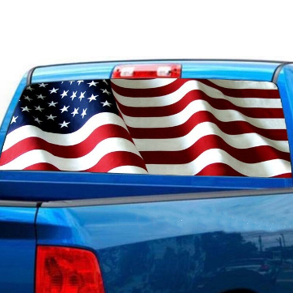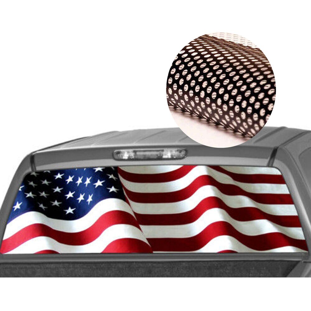 eBay This Perforated Window Graphic is a simple and unique way to add just the right touch to your car. It is digitally printed in high resolution, using top quality solvent inks on high quality 50/50 perforated vinyl, which provide long term durability and vivid colors. Graphic installs on OUTSIDE surface of window and see thru from the inside. These graphics are easy to apply and easy to remove, just peel, apply and trim! sizes to fit MOST vehicles:22" x 65" Packing included: 1 x AMERICAN FLAG waving Rear Window Graphic Decal Wrap Tint Print Truck SUV