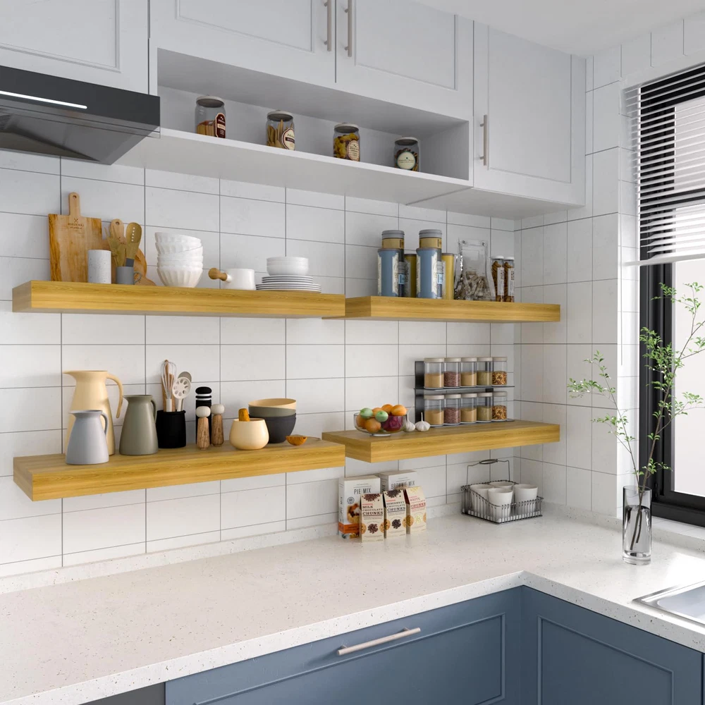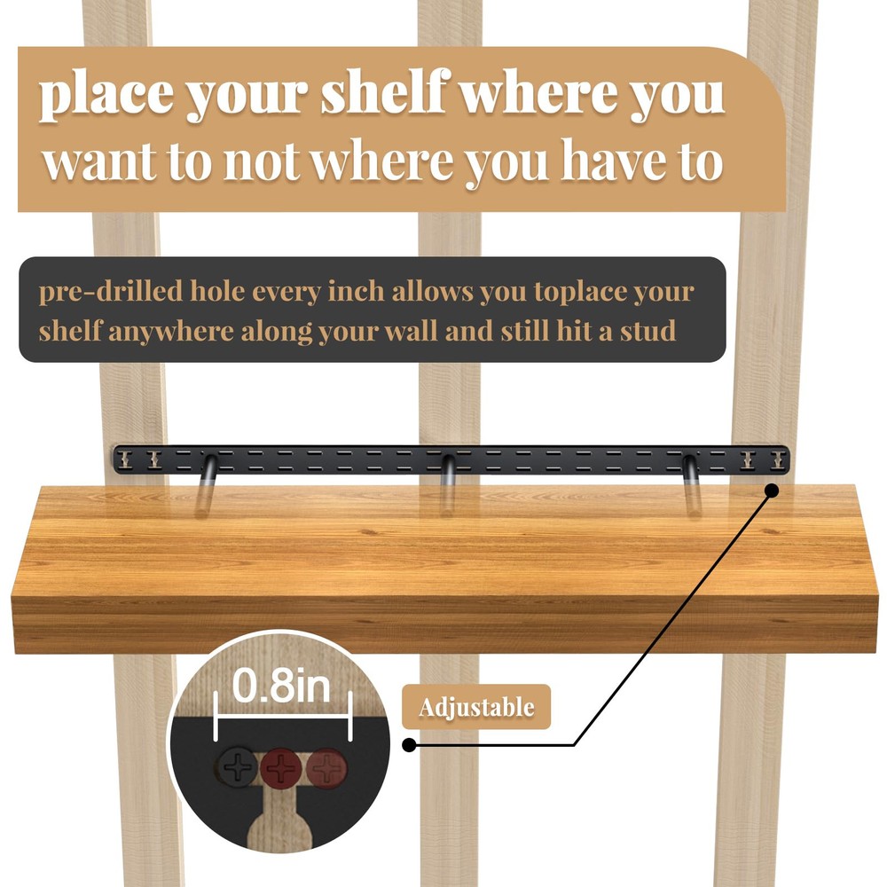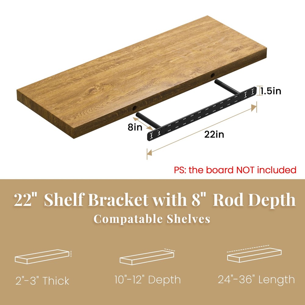 【Heavy Duty Weight Rating】HD floating shelves bracket made of high quality solid steel,can hold 50 lbs per stud when installed correctly,won't bend or warp over time.Each metal blind shelf supports through hundreds of hours of work by top industrial designers in the field.Every black shelves bracket undergoes rigorous quality testing to ensure our customers receive satisfactory hardware brackets. 【Always Hit Stud】Our heavy duty floating shelves brackets have a pre-drilled hole every inch allowing you to place your shelves anywhere along your wall and still hit a stud.What’s more,these stud attach floating shelf hardware can be fixed to drywall, brick, concrete, tile and even timber. 【Easy to Install】Packing include floating shelf bracket installation dowel jig kit,routing jig,auger bit,router bit,screws,wall anchors and easy to read instructions.provide you with complete installation tools for your DIY floating shelf project. 【Decorative Invisible Shelves Brackets】 Designs floating shelf hardware mount directly behind shelves or mantel that are from view,which add an elegant look to any room in house.Use wall mounting shelving bracket to support benches, desks, bars,book etc.The brackets perfect for open shelving bracket in kitchen,bathroom,pantry, fire place mantle, garage any place in your home or office. 【Practical】HD floating shelf bracket supports shelves from 2" to 3" thick and 10" to 12" deep.