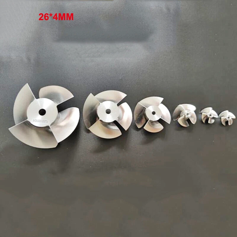 Jet Boats Water Pump 4-blade CNC Propeller Dia 40mm 60mm 80mm 100mm Aluminum Jet Paddle for DIY Sprayer Impeller Remarks : 26x4mm, it means propeller diameter is 26mm, and hole diameter is 4mm 40x5mm, it means propeller diameter is 40mm, and hole diameter is 5mm Because this product is customized, the appearance is inevitable but will not affect the use. Perfectionism carefully shot. Notice:the shaft and coin which is only for your refer,not include CNC aluminum water spray pump impeller: 1. High-efficiency impeller specially designed for marine waterjet propellers and ducted propellers. It adopts 4-blade angle of attack design, and it has high efficiency of open water and anti-cavitation. The the oretical thrust is increased by 72% compared to the 2-blade impeller. 2. The impeller adopts a large chord length design and has a wide range of high efficiency on the pump spray. 3. The impeller adopts high-strength aluminum alloy CNC multi-axis machining, which has high strength and good dynamic balance. Pa rameter: Propeller diameter:26mm/28/mm36mm/40mm, shaft diameter:4mm Propeller diameter:55mm/60mm, shaft diameter:6mm Propeller diameter:80mm, shaft diameter:8mm Propeller diameter:100mm, shaft diameter:10mm Package include: 1pcs x Propeller (no shaft)
