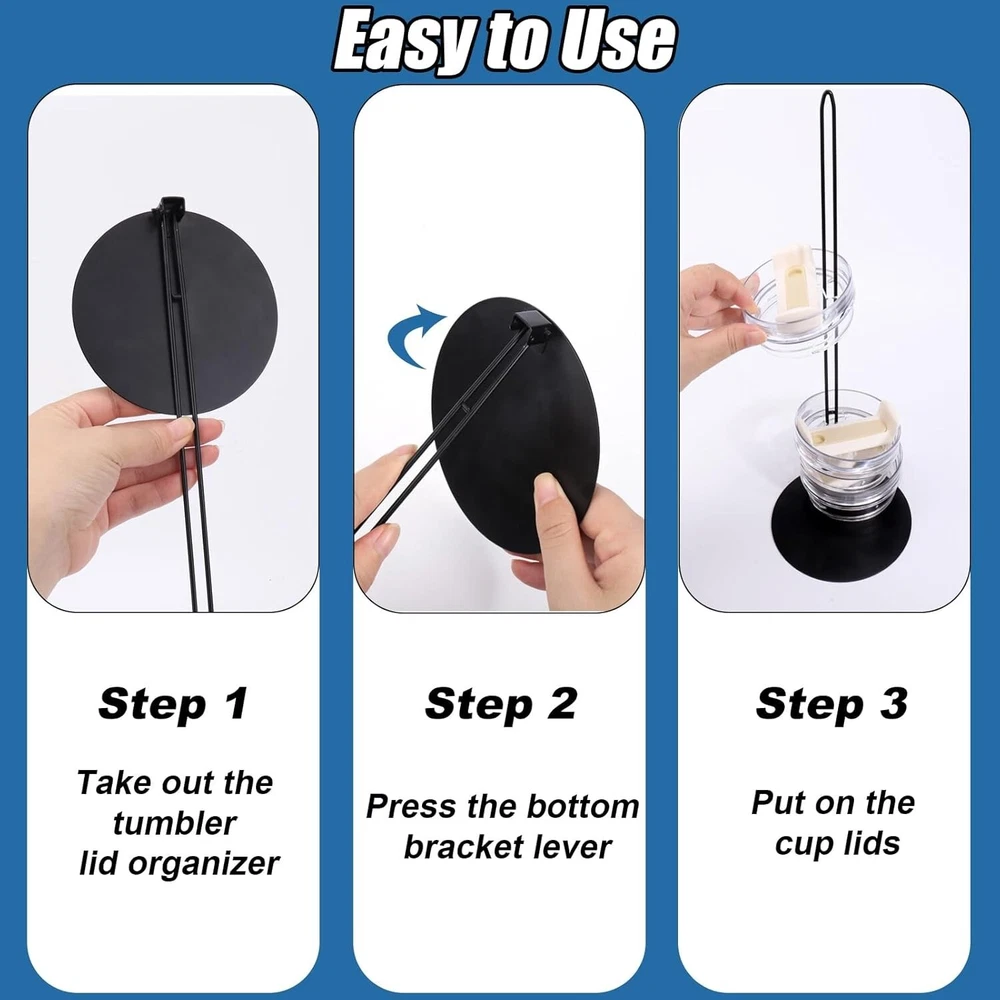 ### Tumbler Lid Holder **Efficient Organization:** Our unique tumbler lid organizer is designed to streamline the organization of your cup lids, preventing clutter and misplacement. It keeps your cup lids from scattering, maintaining tidy kitchen cabinets, and saves you time and energy by allowing you to quickly find your lids every time. **Compatibility:** Carefully crafted to fit most cup lids, our wire holder is not suitable for straw lids with small openings. Compatible with YETI, Stanley, RTIC, Hydro Flask, Starbucks, Tervis, Ozark Trail, Simple Modern, Reduce, SUNWILL, Meoky, KISSKIND, IRON °FLASK, BJPKPK, Hydrapeak, Serborni, MaxBase, Ello, Klean Kanteen, and Owala tumbler lids with openings larger than 0.5 inches. **Extended Design, Holds up to 12 Cup Lids:** Our stacking tumbler lid holder features an extended metal shelf, upgraded from 20cm to 30cm, capable of holding up to 12 cup lids. No more worrying about excessive cup lids piling up or lacking storage space—everything will be in order, making your storage efficient, convenient, and comfortable. **Space-Saving:** Not only does our stacking tumbler lid holder keep kitchen countertops neat and organized, but it also serves as a striking piece of home decor. Efficiently organize cup lids, save time searching, enhance aesthetics, and enjoy easy cleaning. Simplify your life, add style, and make home organization easier and more efficient. You will love it! **High-Quality Material, Reusable for Years:** Unlike other tumbler lid organizers, our cup lid holder is made from a one-piece electroplating process, requiring no screws or manual fixing. It is durable, resistant to damage and deformation, and can be reused for years. Let our metal cup lid organizer become a standout feature in your home, providing you with a unique storage experience.