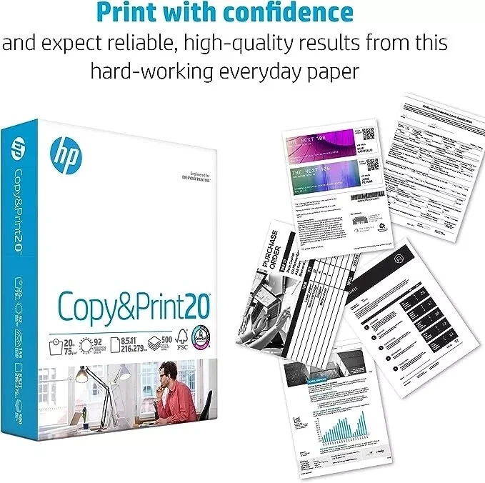 HP Papers is sourced from renewable forest resources and has achieved production with 0% deforestation in North America. Each ream is wrapped in a polyurethane coated paper wrapper to protect the cut sheets from moisture damage Sheet size – 8.5 x 11; Thickness – 20 pounds; Brightness – 92 bright white HP Copy&Print20 20 pounds printer paper is Forest Stewardship Council (FSC) certified and contributes toward satisfying credit MR1 under LEED (Leadership in Energy and Environmental Design) All HP Papers provide premium performance on HP equipment, as well as on all other printer and copier equipment; 100% satisfaction guaranteed; ColorLok technology provides more vivid colors, bolder blacks and faster drying Superior quality, reliability, and dependability for high-volume printing at home, at school and in the office; HP Copy&Print20 print and copy paper prevents yellowing over time to ensure a long-lasting appearance for added archival quality