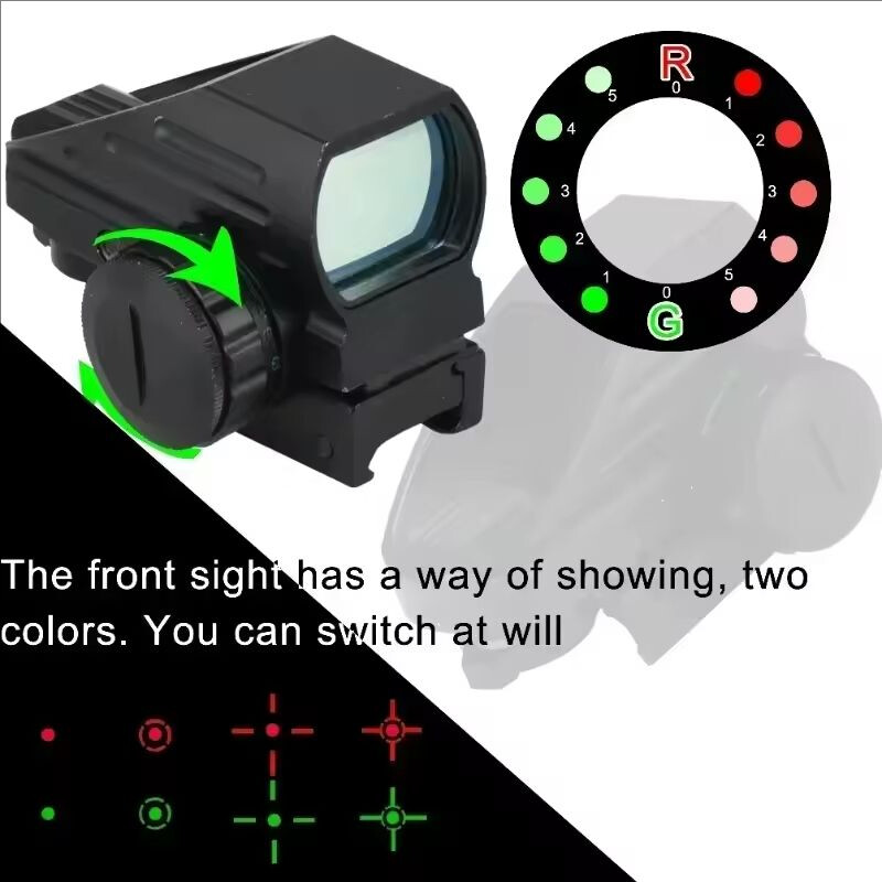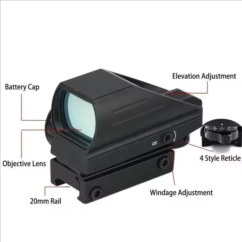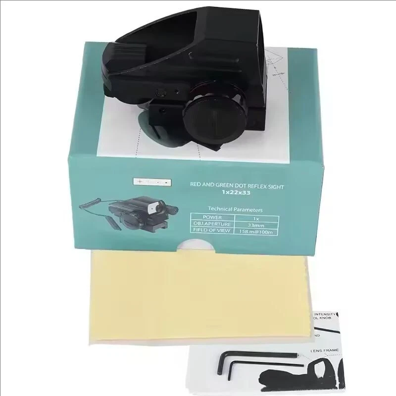 1x22x33 Hunting Red Dot Sight Tactical Optics Reflex Collimator 4 Reticle Red/Green Adjustable Fit Riflescope 20mm Rail Mount 1x22x33 Hunting Red Dot Sight Tactical Optics Reflex Collimator 4 Reticle Red/Green Adjustable Fit Riflescope 20mm Rail Mount Features: Model: 1X22X33 Material: aluminum alloy Click: 1 MOA per click (also 1 "at 100 time) Magnification: 1x Objective aperture: 33 mm View Range: 15.8m-100m Length: 82mm Color: black Rail system: 20mm 1 xHolographic scope 1 x Wrench 1 x Cleaning Cloth Battery not included!!!!!!!!!!!! Note: Due to the different monitor and light effect, the actual color of the item might be slightly different from the color showed on the pictures. Thank you. Please allow 1-2cm measuring deviation due to manual measurement.