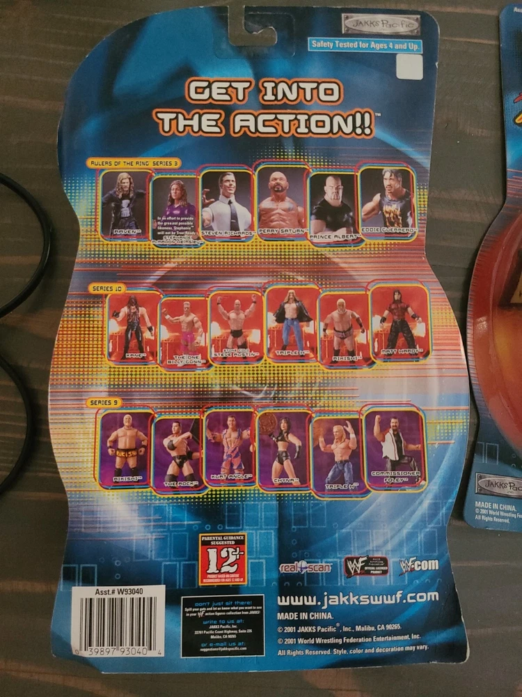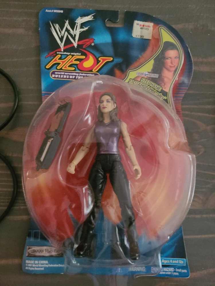 For WWE collectors and fans of Stephanie McMahon Helmsley, this is a great find! This original, unopened JAKKS Pacific action figure is from the year 2001 and is a part of the WWE Rulers Ring 3 series. The figure stands at 7in. and comes with a briefcase accessory. The Stephanie McMahon Helmsley figure is made of plastic and is recommended for ages 4-30. It is part of the WWE franchise and is from the Monday Night Raw TV show. This vintage item is a must-have for any wrestling fan and will make a great addition to any collection.