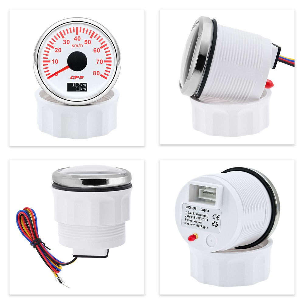 2'' 52mm GPS Speedometer 0-80km/h Gauge Odometer for Motorcycles Boat Car Truck 52mm Digital GPS Speedometer Speed Odometer Gauge 0-80Km/h for Car Boat Truck Specifications Item Name: 52mm GPS Speedometer Gauge Dial: White Material: Stainless Steel 316L Bezel + Anti-fog Glass Install Diameter: Φ52mm or 2" Signal: GPS Working Voltage: 9~32V DC Working Current: ≤100mA Operating Temperature: -30℃ ~ 75℃ Storage Temperature: -40℃ ~ 85℃ Size: 12x8x12cm / 4.72x3.1x4.75 inch IP67 waterproof and dustproof grade Indication Range: 0-80Km/h Backlight:7 Colors Backlight Product Descriptions High-brightness LED backlight. 316 stainless steel for long-term use even in acid-base, humid environment. IP67 waterproof and dust-proof grade. With curved glass( with anti-fog function). Suitable for all kinds of vehicle modification. Using stepper motor drive pointer, accurate display of the engine speed, and with the LCD display clear display mileage. Gauges have many kinds backlight color (red,yellow,orange,green,blue,purple,white),customers can adjust any color that you like. Connection: Black: Ground(-) Red: 9-32VDC Blue: Adjust Yellow: Backlight Package Includes: 1X 52MM Digital GPS Speedometer Gauge 1X Instruction 1X Wire Harness 1X GPS Antenna