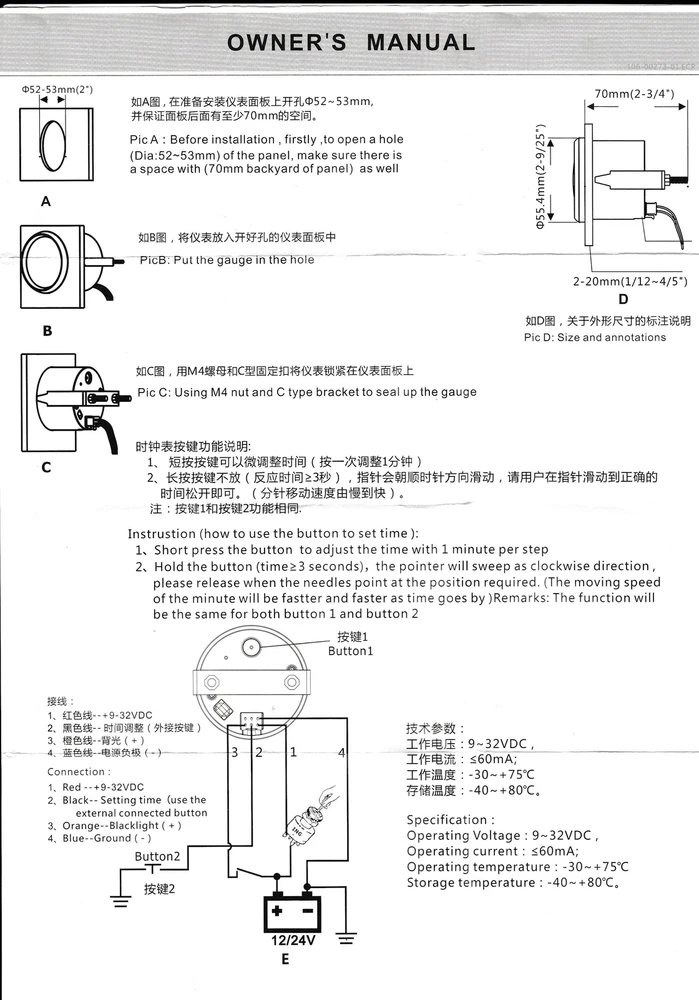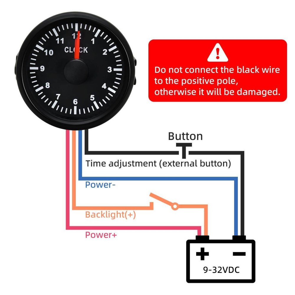 2'' 52mm Waterproof Digital Clock Gauge for Car Truck Motorbike Boat Yacht 9-32V 52mm Black Clock Gauge Modified 12Hours Show Clock Meter Hour Meter for Car Boat Description: Product name:clock gauge Material:sus316L+anti-fog glass+pvc Install diameter:Φ52mm or 2-1/16" Indication range:0~12hours Connection method:row insert Working voltage:9~32vdc Backlight color:red Operating temperature:-30~+75℃ Working temperature:-40~+85℃ Grade of protection:front cover IP67,back cover IP5 Item color:black Item condition:new Package method:neutral box Place of origin:China Features: 316L stainless steel for long-term use even in acid-base,humid environment IP67 waterproof and dustproof grade. Stepper motors used for full range of stepping gauges,great feature with its less power consumption,longer life,higher precision,etc. With curved glass (with anti-fog function). With ultra-wide working voltage design (long-term operating voltage:9-32v,maximum up to:36v). Backlight for standard is red,but various backlight could be customized according customers’ requirement. Customized color for stainless steel is provided. Fast delivery time,better for releasing your pressure of stockage and liquidity. There is a snap together with the harness connector,for best and firmly connected,in order that the gauges could work even in strong viberation,products can be used for the engines/generating units,ships,construction machinery,agricultural machinery,automotive modification,etc. Instrustion (how to use the button to set time ): 1、Short press the button to adjust the time with 1 minute per step 2、Hold the button (time≥3 seconds),the pointer will sweep as clockwise direction , please release when the needles point at the position required. (The moving speed of the minute will be fastter and faster as time goes by ) CLOCK: Please Connect the red clock holding wire, the clock wire isconnected to the positive pole of the red battery, or the clock will be reset. Package Includes: 1 x Clock gauge 1 x Wiring harness 1 x Instruction manual
