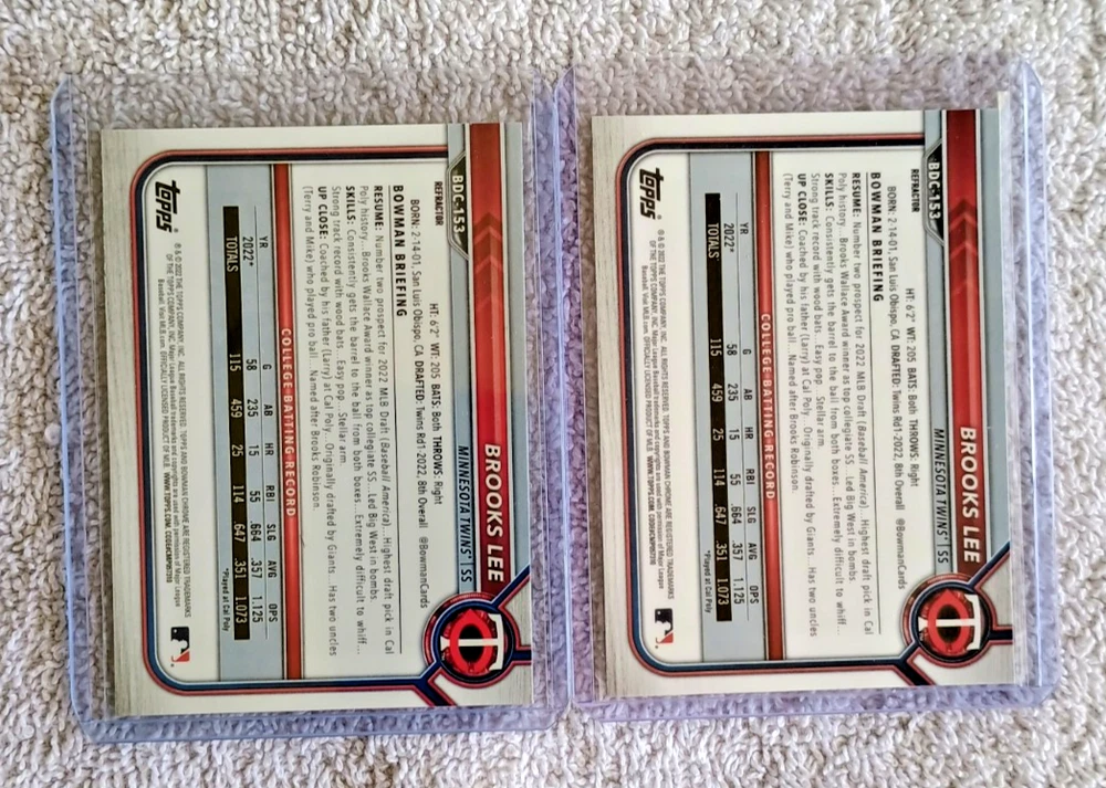 2 BROOKS LEE 2022 BOWMAN CHROME MEGA MOJO REFRACTOR RC LOT # BDC1253 TWINS SHIPPING WILL BE $4.99. I DO COMBINE SHIPPING FOR ADDITIONAL ITEMS PURCHASED. PLEASE CONTACT ME FOR DISCOUNTED RATES. USPS FIRST CLASS SHIPPING UNLESS OTHERWISE LISTED. I ONLY SHIP TO THE U.S. EBAY SELLER WITH 100% FEEDBACK. PLEASE VIEW MY OTHER LISTING. MONEY BACK IS GURANTED IF YOU NOT SATISFIED WITH THE RETURN OF THE ITEM OR ITEMS.