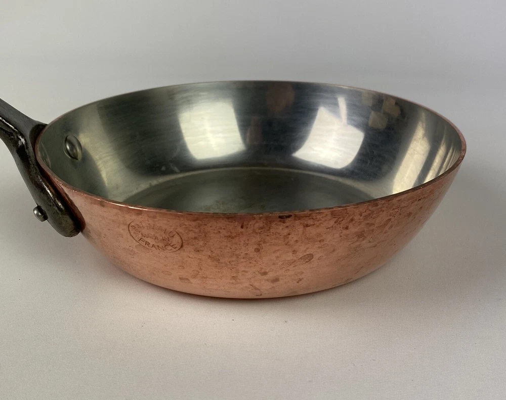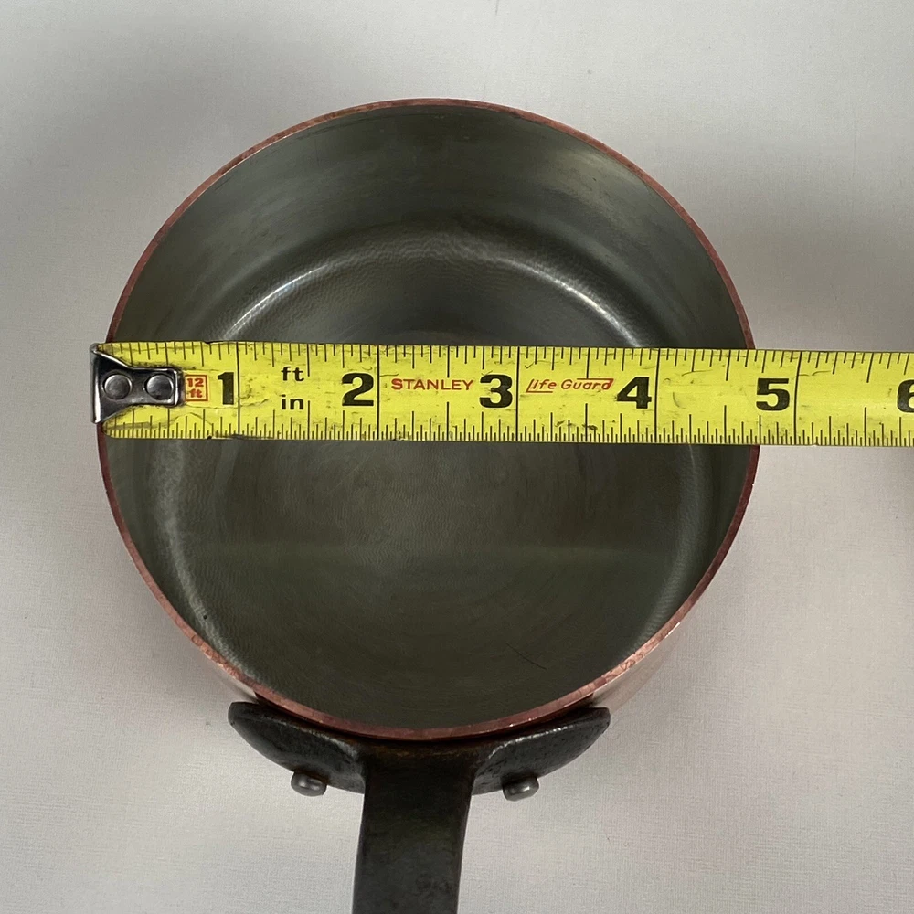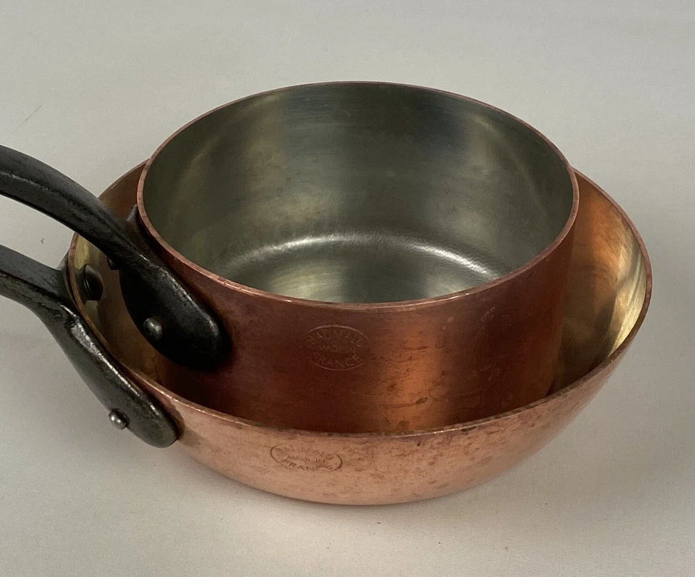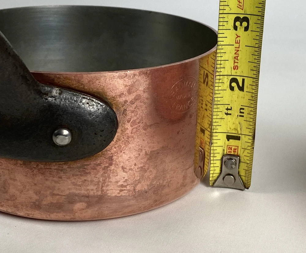Up for sale is a set of two Baumalu copper cookware pieces made in France. The set includes a 6.5" skillet and a 5" saucepan, both featuring cast iron handles. The copper surface coating adds a touch of elegance to any kitchen and is compatible with both electric and gas stove types. This set is a great addition for any collector of vintage or antique cookware. The round shape and copper color make for a beautiful display piece, while also being functional for cooking. Don't miss out on the opportunity to own this original, two-piece set from Baumalu. Most of our items are second hand and have some shelf wear on them. We do not guarantee mint condition unless otherwise noted. Please take time to look closely at all photos of items and specifics, as they are all part of the complete description. Most noticeable flaws we see will be pointed out with a pen. All items in the photos are of the actual product being shipped directly to you (minus display props and measuring devices) If an item is not in the photos, please do not expect it. If you have any questions or concerns, please reach out to us. Our feedback speaks for itself. We do all we can to keep you satisfied with your buying experience from Streamline717