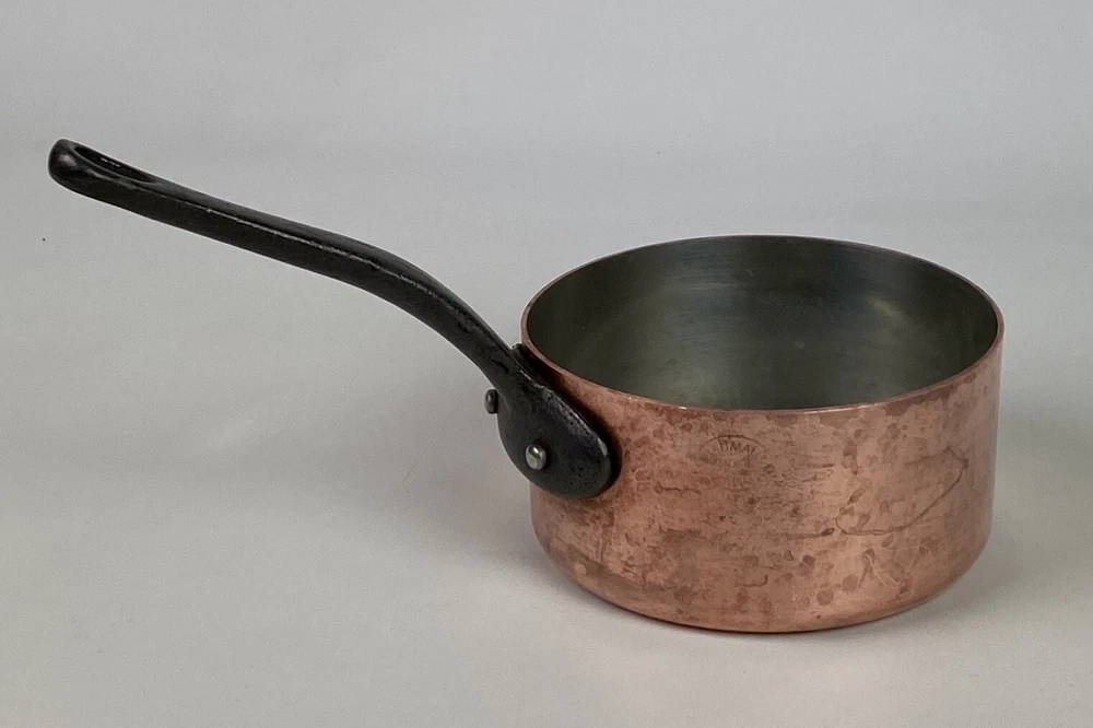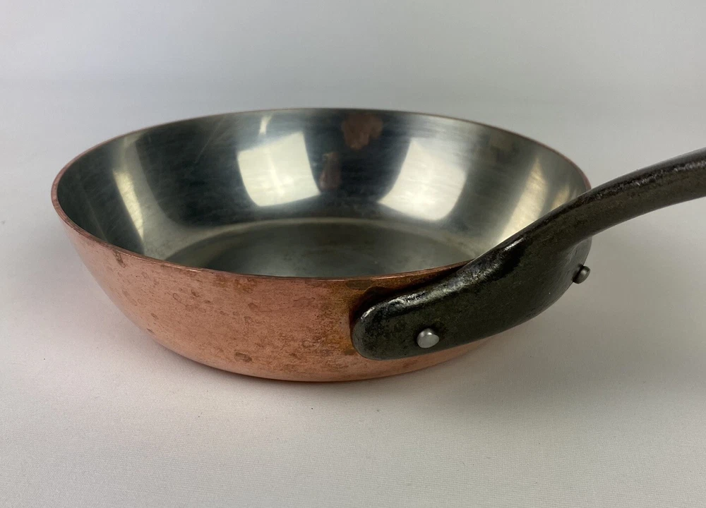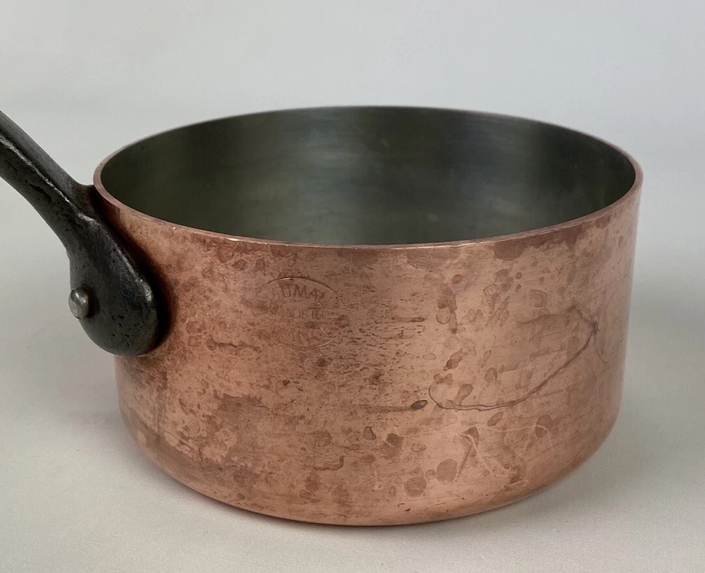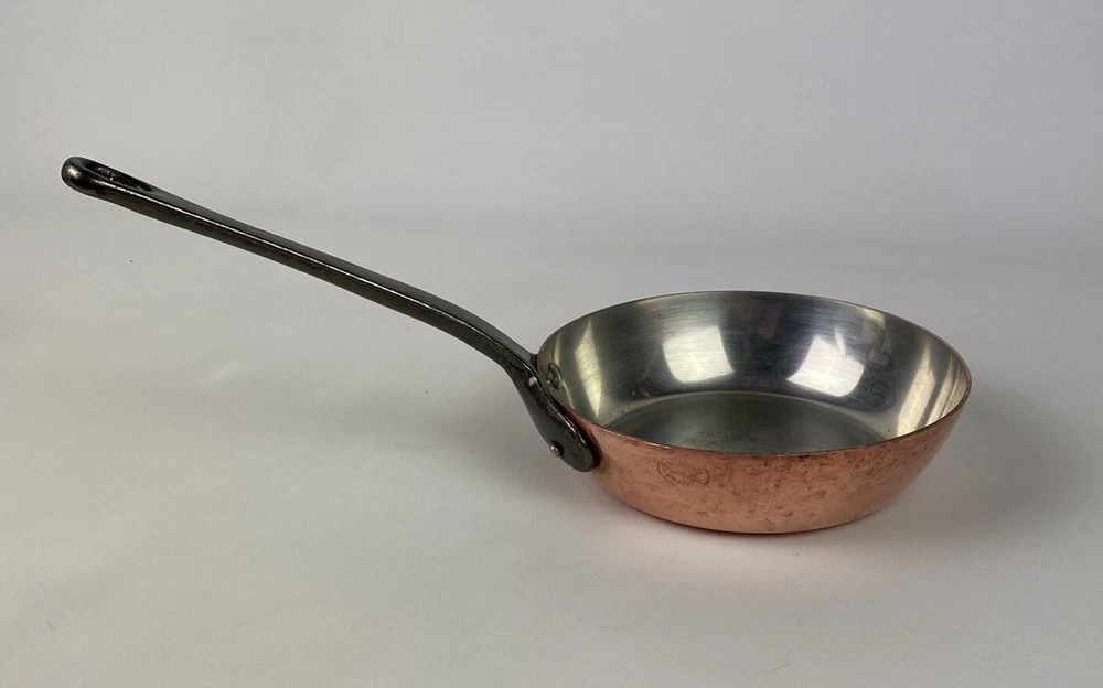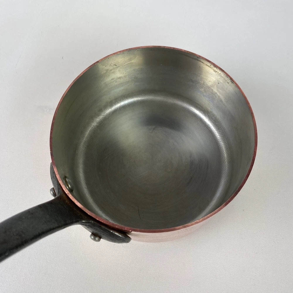 Up for sale is a set of two Baumalu copper cookware pieces made in France. The set includes a 6.5" skillet and a 5" saucepan, both featuring cast iron handles. The copper surface coating adds a touch of elegance to any kitchen and is compatible with both electric and gas stove types. This set is a great addition for any collector of vintage or antique cookware. The round shape and copper color make for a beautiful display piece, while also being functional for cooking. Don't miss out on the opportunity to own this original, two-piece set from Baumalu. Most of our items are second hand and have some shelf wear on them. We do not guarantee mint condition unless otherwise noted. Please take time to look closely at all photos of items and specifics, as they are all part of the complete description. Most noticeable flaws we see will be pointed out with a pen. All items in the photos are of the actual product being shipped directly to you (minus display props and measuring devices) If an item is not in the photos, please do not expect it. If you have any questions or concerns, please reach out to us. Our feedback speaks for itself. We do all we can to keep you satisfied with your buying experience from Streamline717