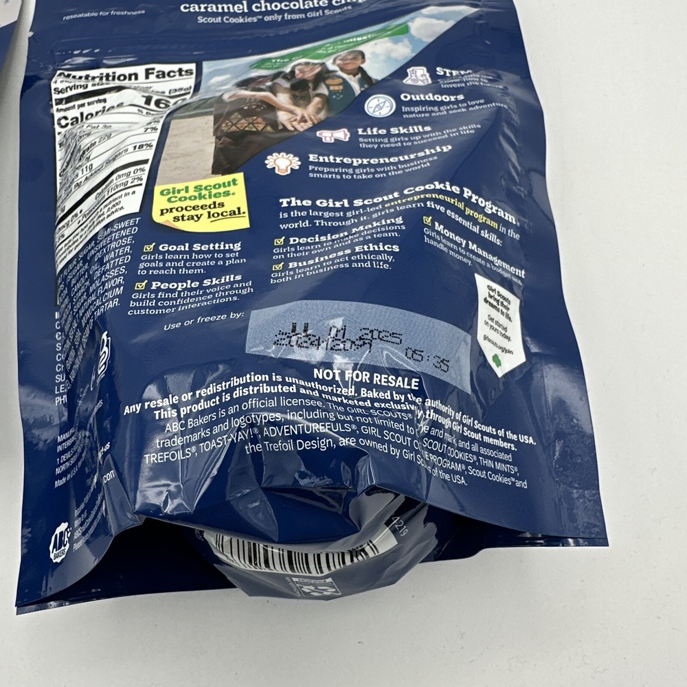 The product is a set of two sealed boxes of 2025 Girl Scout Gluten Free Caramel Chocolate Chip cookies. These cookies are made by Girl Scouts in the United States and are certified gluten-free and vegan. They contain peanuts and milk as allergens, with an expiration date of September 2025. The cookies come in a box packaging and have a delicious flavor combination of chocolate and caramel, making them a popular choice for those looking for gluten-free treats. Perfect for pantry storage or for sharing with friends and family who have dietary restrictions. D1