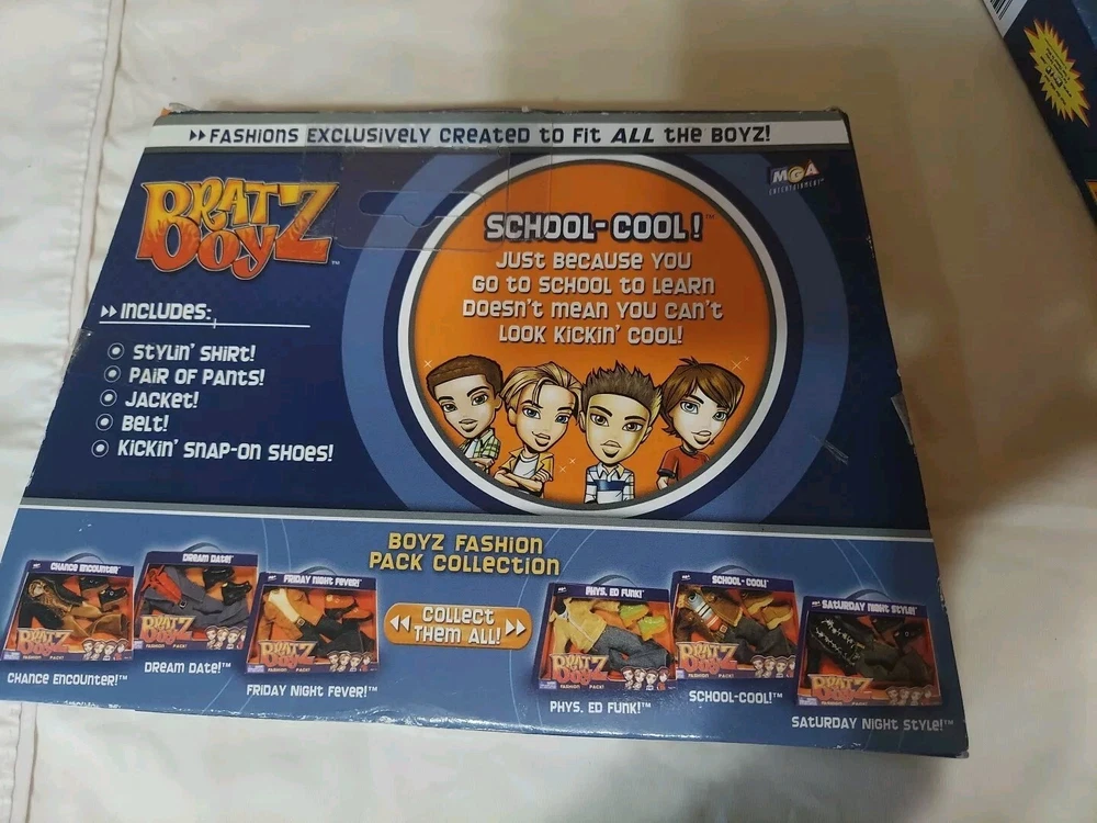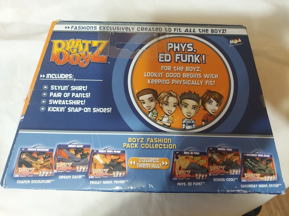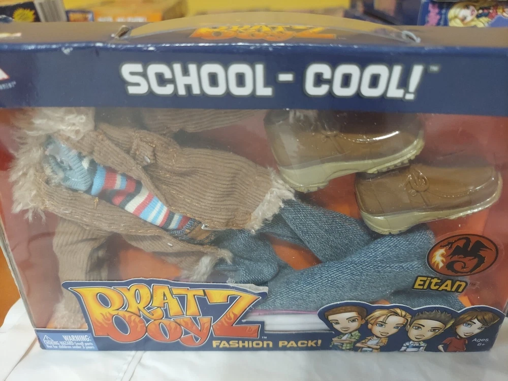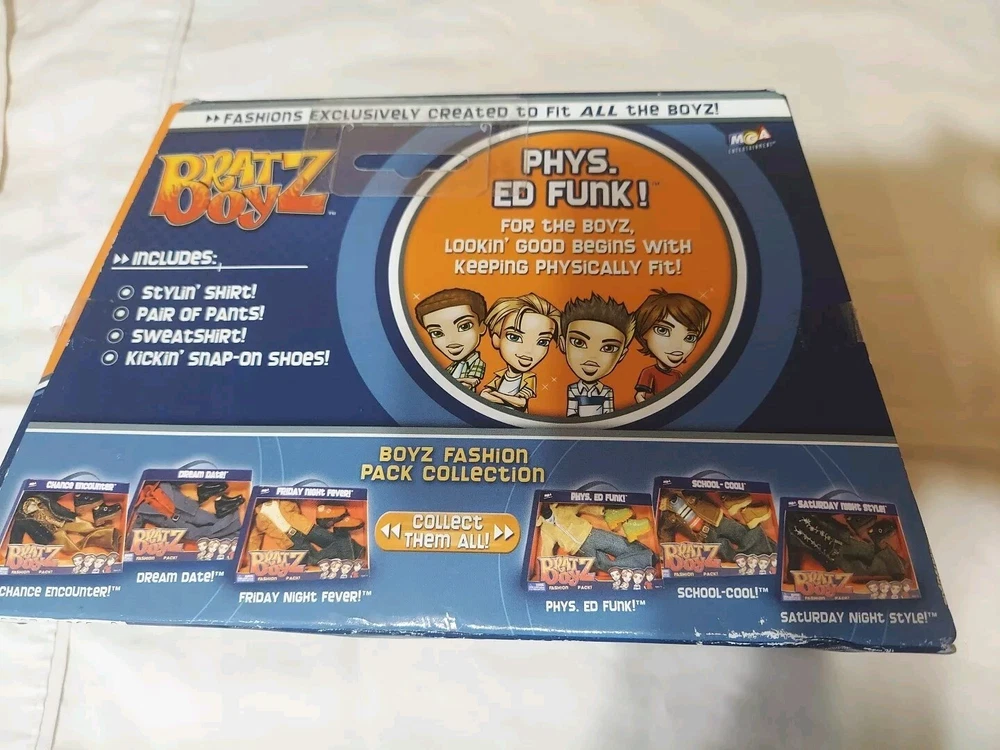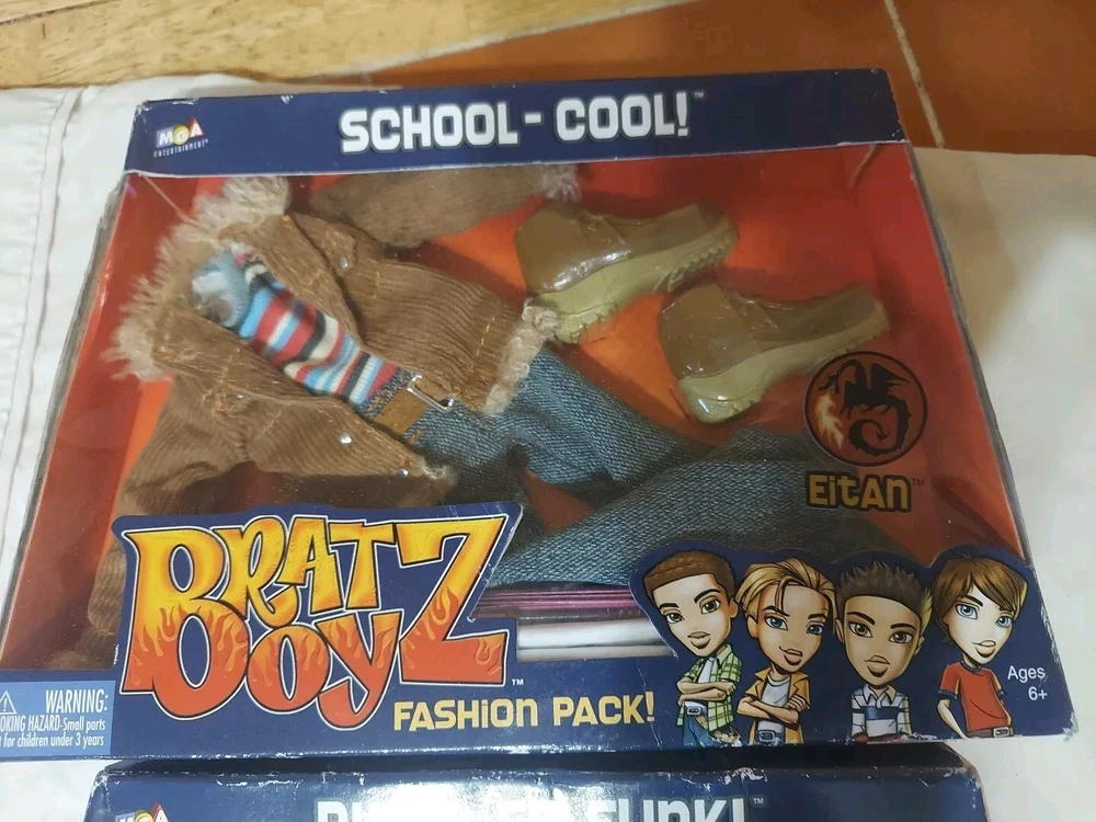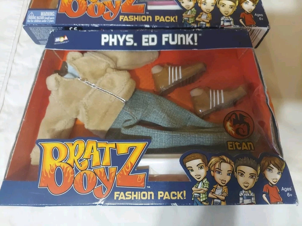 Up for bid, dated 2003 are the 2 Bratz Boyz Fashion packs seen in the photos. Both still sealed. Eitan's Phys. Ed Funk! and School - Cool!! 2 cute sets. Boxes have some wear. See photos Thanks!