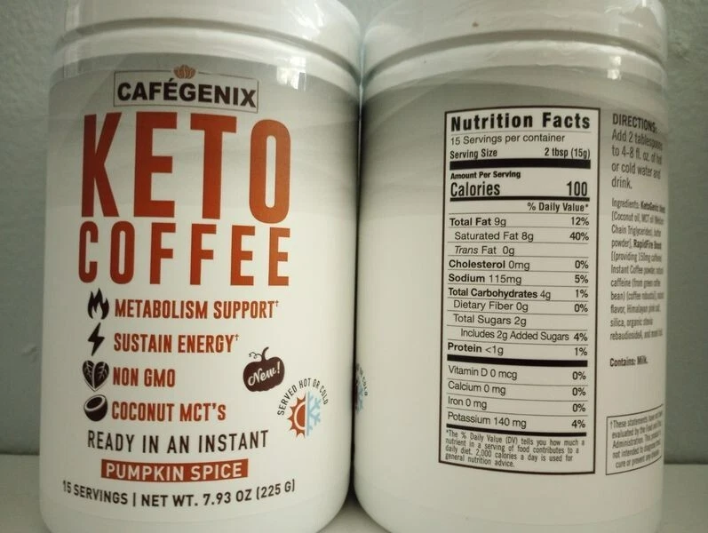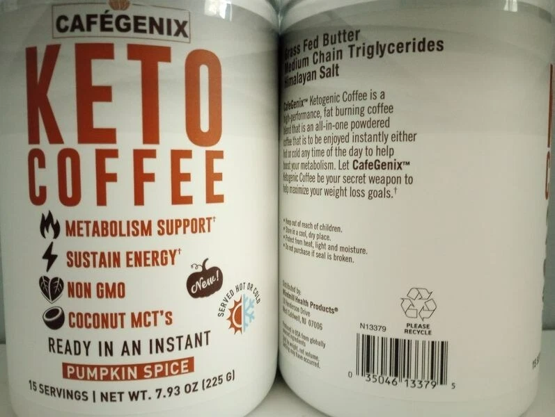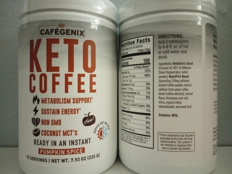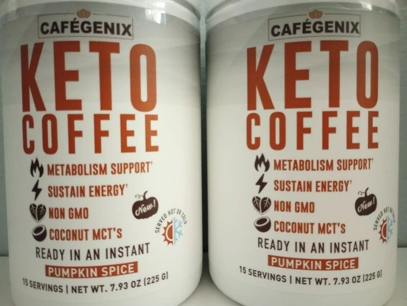 Cafegenix Keto COFFEE with Grass Fed Butter MCT Oil PUMPKIN SPICE 7.93oz (2 Pack) by Cafegenix Features: • Organic Coffee • Himalayan Salt • Pumpkin Spice Flavor • Offers Metabolism Support • Sustains Energy • Non GMO • With Healthy Coconut MCT's • Fat-burning Coffee Blend • Serve Hot or Cold Maintain your Ketogenic lifestyle without giving up delicious flavored coffee. This Keto Instant Coffee is pumpkin spice flavored and can be served both hot or cold. Not only is this coffee full of flavor, but it also offers metabolism support and sustained energy. KETO & PALEO FRIENDLY: Rich in MCTs and healthy fatty acids to enhance the body’s production of ketones to promote increased metabolism, weight loss, and brain function. No gluten, soy or artificial ingredients DIET & WEIGHT LOSS: Quickly metabolizes to ketone energy, rather than storing as fat, with only 100 caloriesper serving and helps provide feeling of fullness 1. Instant Keto Coffee is high-quality organic instant coffee with MCT powder from Organic Coconuts. 2. Instant Keto Coffee makes a great replacement to your morning coffee brew since it contains less caffeine, more high quality fat, and more energy! 3. Instant Keto Coffee contains 10g of MCT Oil Powder, which is equal to 7g of total MCTs per serving. 4. Instant Keto Coffee contains 60mg of caffeine. If you can tolerate higher levels of caffeine, Instant Keto Coffee can be blended with an additional cup of coffee.