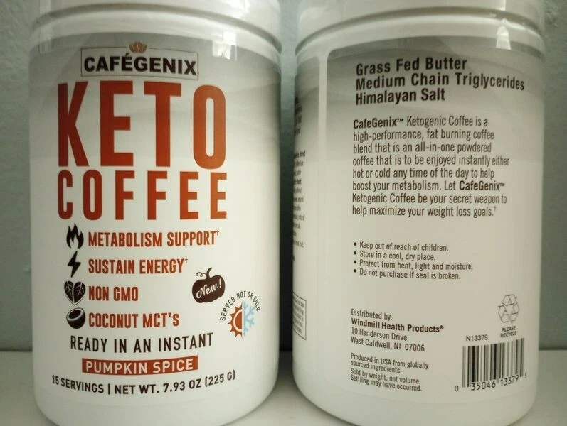Number of Pills: N/A Features: GMO-Free, Grass Fed, Low Carb, Metabolism Support, Sustain Energy, Non GMO, No Sugar Added, Grass-fed butter from pasture-raised cows, Naturally Caffeinated, Ready In An Instant!, Green coffee Bean, Coffee Robusta Food Aisle: Pantry Formulation: Powder MPN: 13379 Volume: 8 fl oz Caffeine: 150 mg Department: Unisex Nutrition Facts Label: Yes Manufacturer: Windmill Type of Diet: Fitness, Keto Supply: 1 Month and Longer gtin13: 035046133795 Flavor: Pumpkin Spice Brand: Cafegenix Ingredients: Coconut Oil, Potassium, MCT Oil, Himalayan pink salt, Instant Coffee, Green Coffee Bean Item Weight: 7.93 oz Type: Drink Active Ingredients: Caffeine, Coconut Oil, Green Coffee (Coffea arabica), Himalayan pink salt, Grass-Fed Butter Powder, MCT Oil Country/Region of Manufacture: United States When to Take: After Meal, Before Meal, Before Workout UPC: 035046133795 Expiration Date: 05/2025 Coffee Roast: Medium Dosage: 2 Tablespoons with water Main Purpose: Endurance/Energy, Fitness, Weight Loss