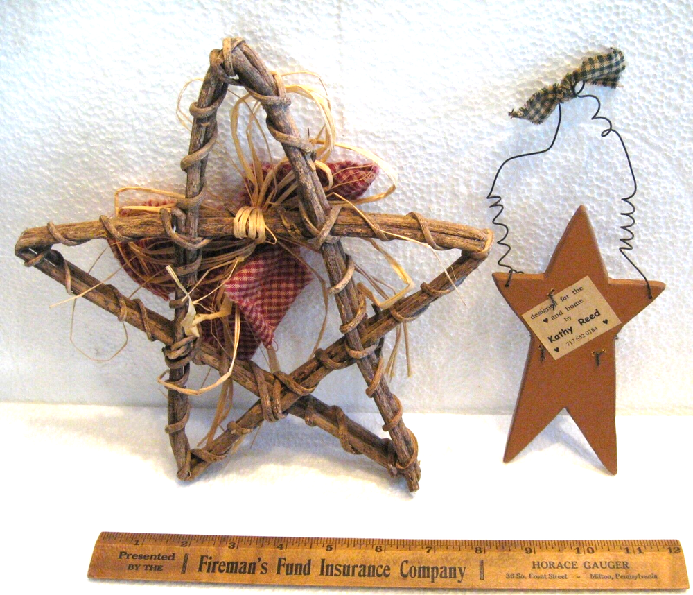 2 Country Farmhouse Decor Hanging Stars Grapevine Red Bow Wooden w Buttons Wire Grapevine star is 9" x 10" and wooden one is 3" x 6", not including the wire.