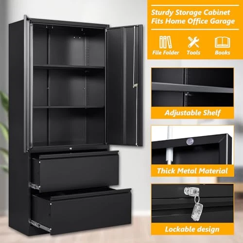 【MULTIFUNCTIONAL FILE CABINET】This metal cabinet combines the functions of filing cabinet and storage cabinet. Equipped with two drawers for letter/legal/A4 size documents. Above the filing cabinet, there is a storage cabinet with two shelves, The layered and combination design allows it to be used as a lockable office cabinet. 【SAFETY DOOR LOCK SYSTEM】metal cabinets and lateral file cabinet is equipment a separate built-in metal lock and each metal lock comes with two keys to ensure the safety of your items stored in the metal cabinets or metal drawer. 【HIGH QUALITY METERIAL】metal storage cabinets are made of heavy gauge cold-rolled steel plate, sturdy and durable. Whole-in-one reinforced heavy duty metal frame, load capacity up to 100lbs per shelf, and load capacity up to 30lbs per drawer. 【LARGE STORAGE SPACE】Overall size of this metal cabinet is 71"H x 32"W x 16"D (H x W x D). There are two adjustable metal shelves in the metal storage cabinet, and two hanging rods in the drawer for hanging documents. The size of the drawer is H11.8*W30*D14.8. 【EASY TO ASSEMBLE】The Filing cabinet is knock-down structure, when you receive it, you need to assemble. The package comes with detailed assembly instructions, easy to assemble. You just need to follow the steps on the installation instructions and you can easily complete it within 20 minutes. Any question please feel free to contact us, we always respond within 24 hours.