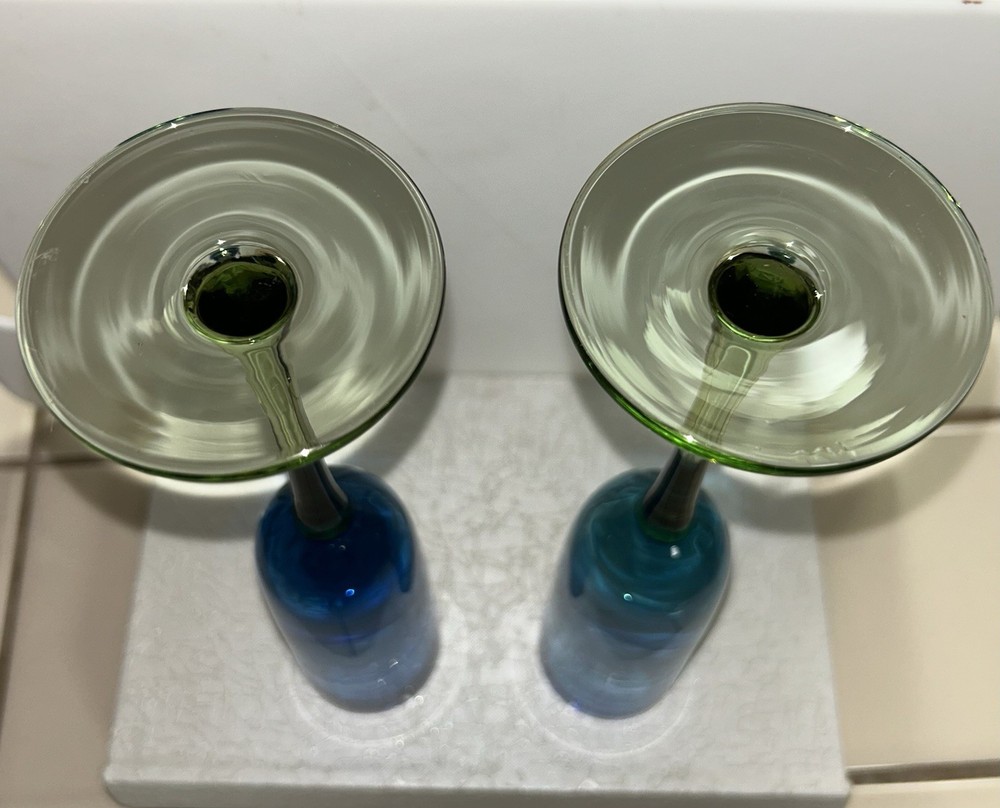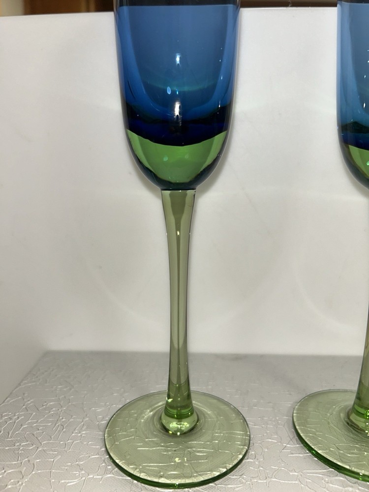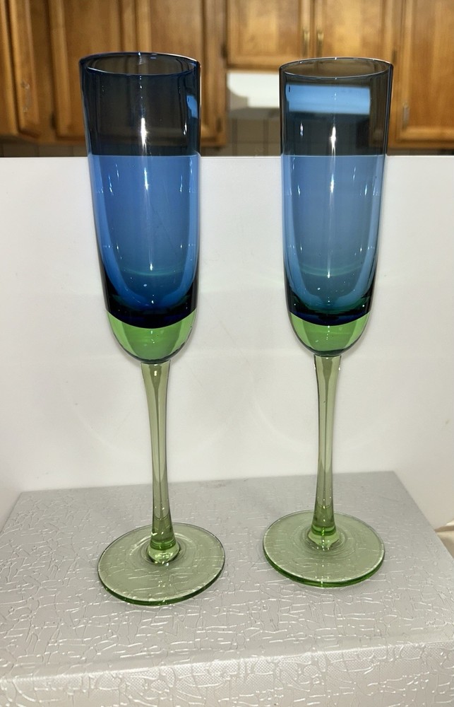 2 Festival Blue Green Champagne Flutes Glasses Block Metropolis Blown Glass Mint