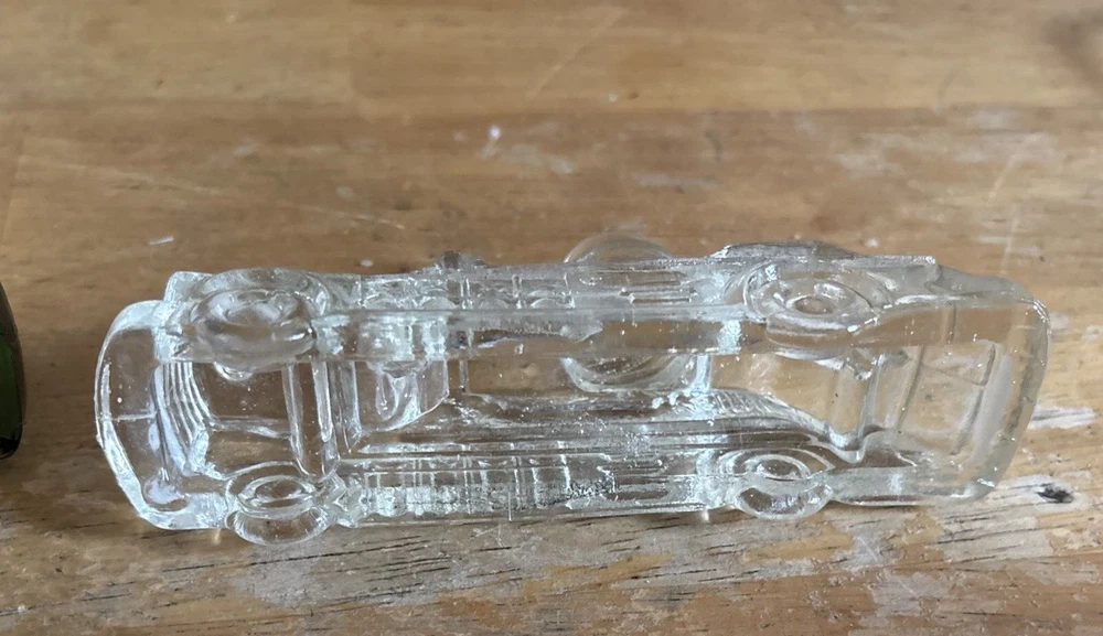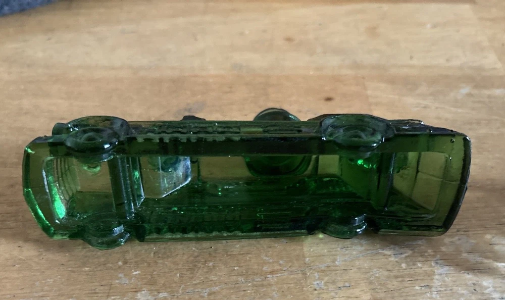 2 Fire Engine Truck Glass Toy Candy Container Emerald Green Clear Vintage Toy glass candy containers in the form of fire engine trucks. One is green and the other is clear. The clear one has "Taiwan" in the mold mark, the green one has no marks. Measure about 4 7/8" x 1 1/4" x 2". Have been pre-enjoyed and the clear is rough to the touch on the edge seam marks, whereas the green one is super smooth on the edges. I think the clear one is a reproduction and the green one is vintage. Please feel free to email your questions and take a look at my other items to combine shipments and save on postage cost. Shipping in US only.