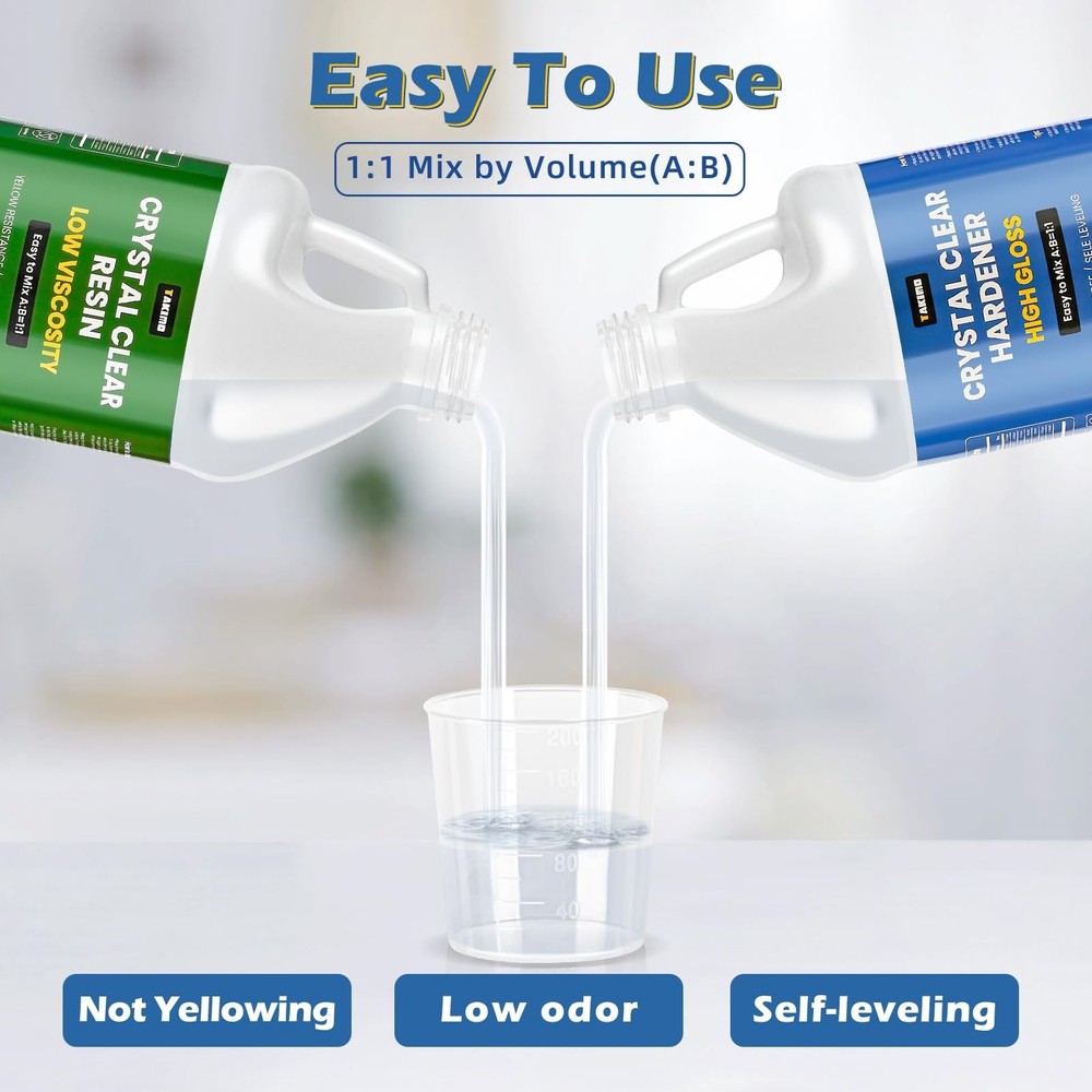 2 Gallon Crystal Clear Resin Kit,No Bubble & Not Yellowing Epoxy for Coating, Casting, Table Top,DIY, Bar Top, River Tables, Resin Art, Wood with High Gloss Finish Product Details Size: 2 Gallon Kit Brand: TAKIMO MPN: C-1G UPC: Does not apply EAN: Does not apply Brand: TAKIMO Specific Uses For Product: Fabric, Art, Craft, Table Top Coating, Countertop, Painting, Wall Art, Jewelry, Woodworking, Carpentry, Furniture, Wood See more Material: Epoxy Resin Compatible Material: [Multiple Materials] Item Form: Liquid Brand: TAKIMO Specific Uses For Product: Fabric, Art, Craft, Table Top Coating, Countertop, Painting, Wall Art, Jewelry, Woodworking, Carpentry, Furniture, Wood Material: Epoxy Resin Compatible Material: [Multiple Materials] Item Form: Liquid Special Feature: Dries Clear, Fast Drying, Non Toxic, Self Leveling, Strong Color: Clear Item Package Quantity: 1 Package Information: Bottle Item Volume: 1 Gallons Viscosity: Moderate Full Cure Time: 24 Hours Water Resistance Level: Water Resistant Unit Count: 256.0 Fluid Ounces Manufacturer: TAKIMO Package Dimensions: 13.35 x 12.13 x 6.85 inches Item model number: C-1G Item Weight: 18.24 pounds Date First Available: September 5, 2023 EASY TO USE & FASTER CURE Our kit include 1 gallon clear resin and 1 gallon clear hardener.As long as mixing 1:1 ratio by volume of the resin and hardener,it cures quickly within 8-24 hours.Requires no experience, even if you are new to resin.To make a perfect finish in cold weather:Prewarm resin and hardener before using. NO BUBBLES AT All - Our brand cares a lot about user experience, so we have changed the formula to add defoamer for this purpose,which can prevent air bubbles as well as stronger defoaming ability, recommended each layer no more than 1/4 inch,can be completely eliminated within one hour.Also,our epoxy kit is non-toxic,odorless and non-flammable,more safe than others. SUITABLE FOR BEGINNERS & PROS - 40 minutes working time allows you to create what you want,after this time it becomes scratch resistant, advanced additive resistant to heat up to 203F (95C). Our casting and coasting resin are suitable for All kinds of DIY craft projects such as making jewelry, coasters, tumbles, table tops, countertop, painting, etc. And it fits perfectly with silicone molds, not causing molds tearing. WHY CHOOSE US We are an experienced manufacturer specializing in resin development and production. To ensure optimal results, always follow the instructions carefully and conduct a small test before full application. This helps avoid common resin issues, such as curing problems.