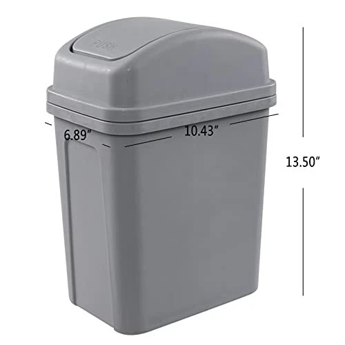 2 Gallon Trash Can Durable and easy to clean: It is made of durable plastic and and easy to clean Capacity : 8-Liter/2-Gal - Dimensions: 10.43" x 6.89" x 13.5" Swing lid design is use-friendly Convenient side handles make the can easy carrying It is great for bedroom, living room, bathroom, office and kitchen