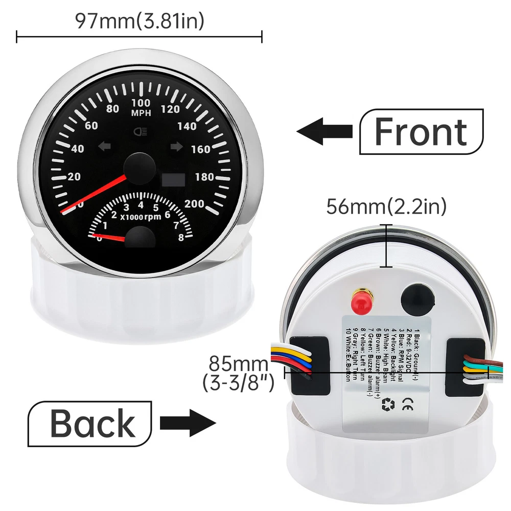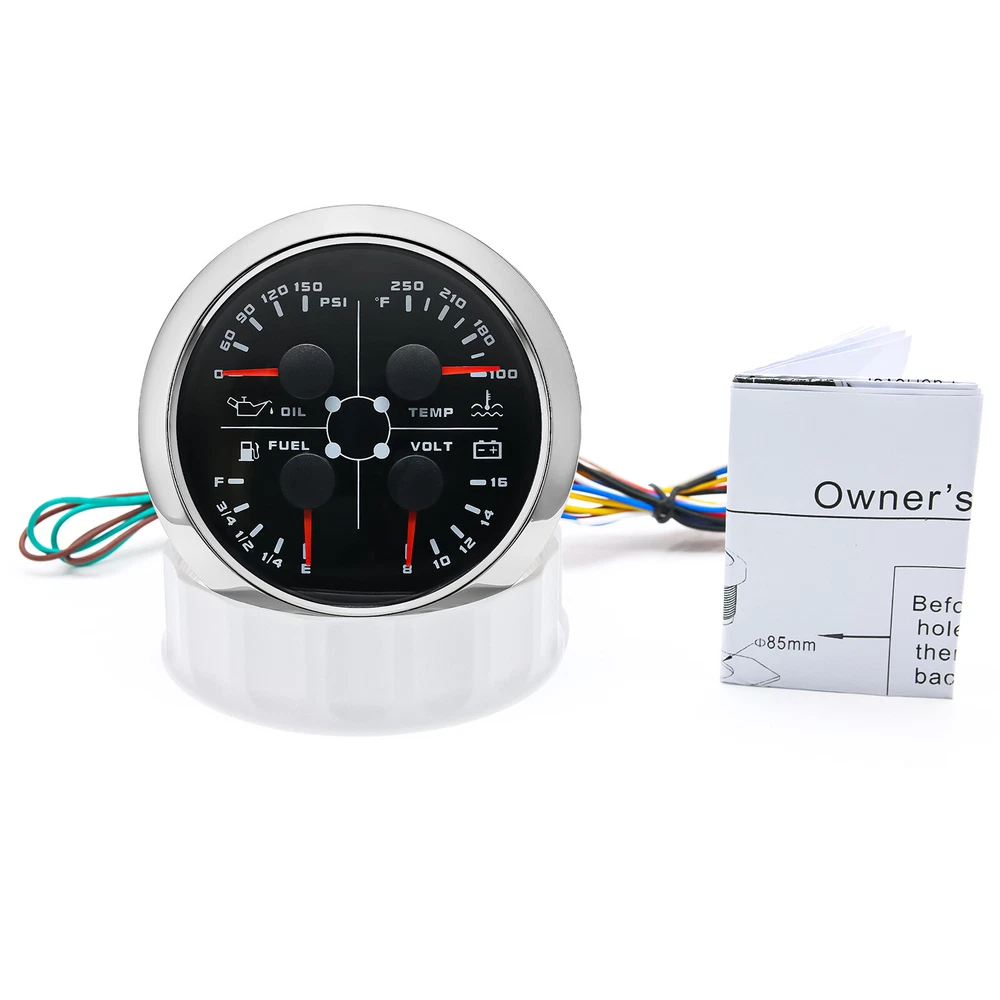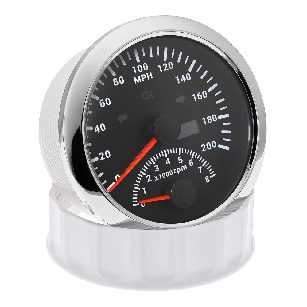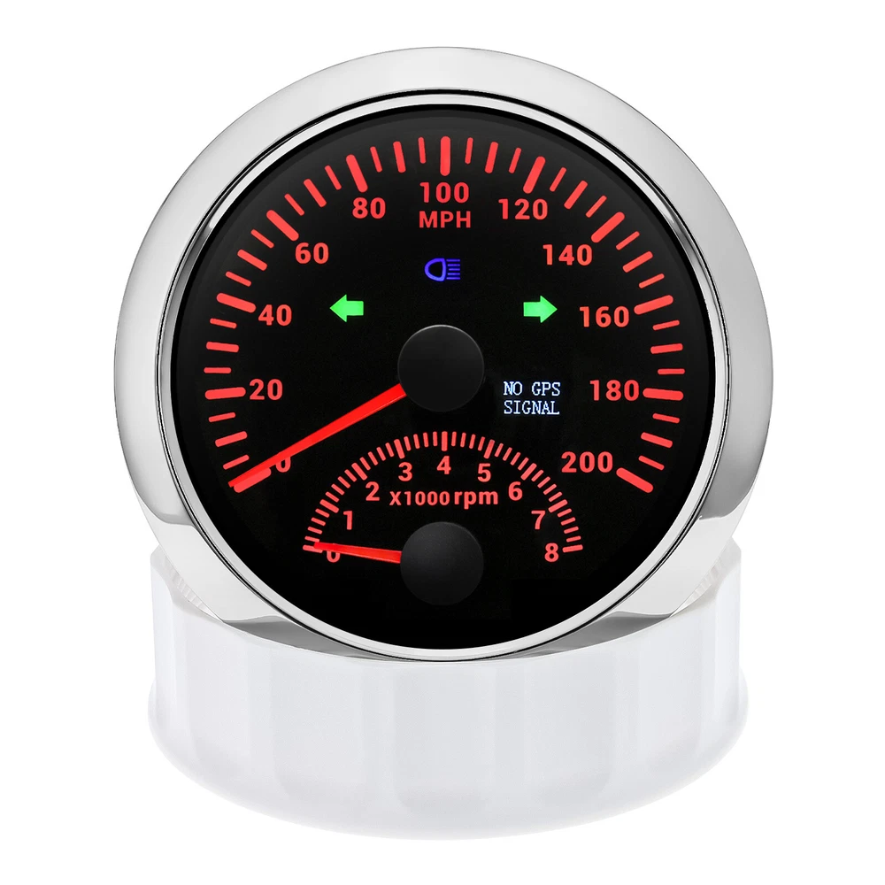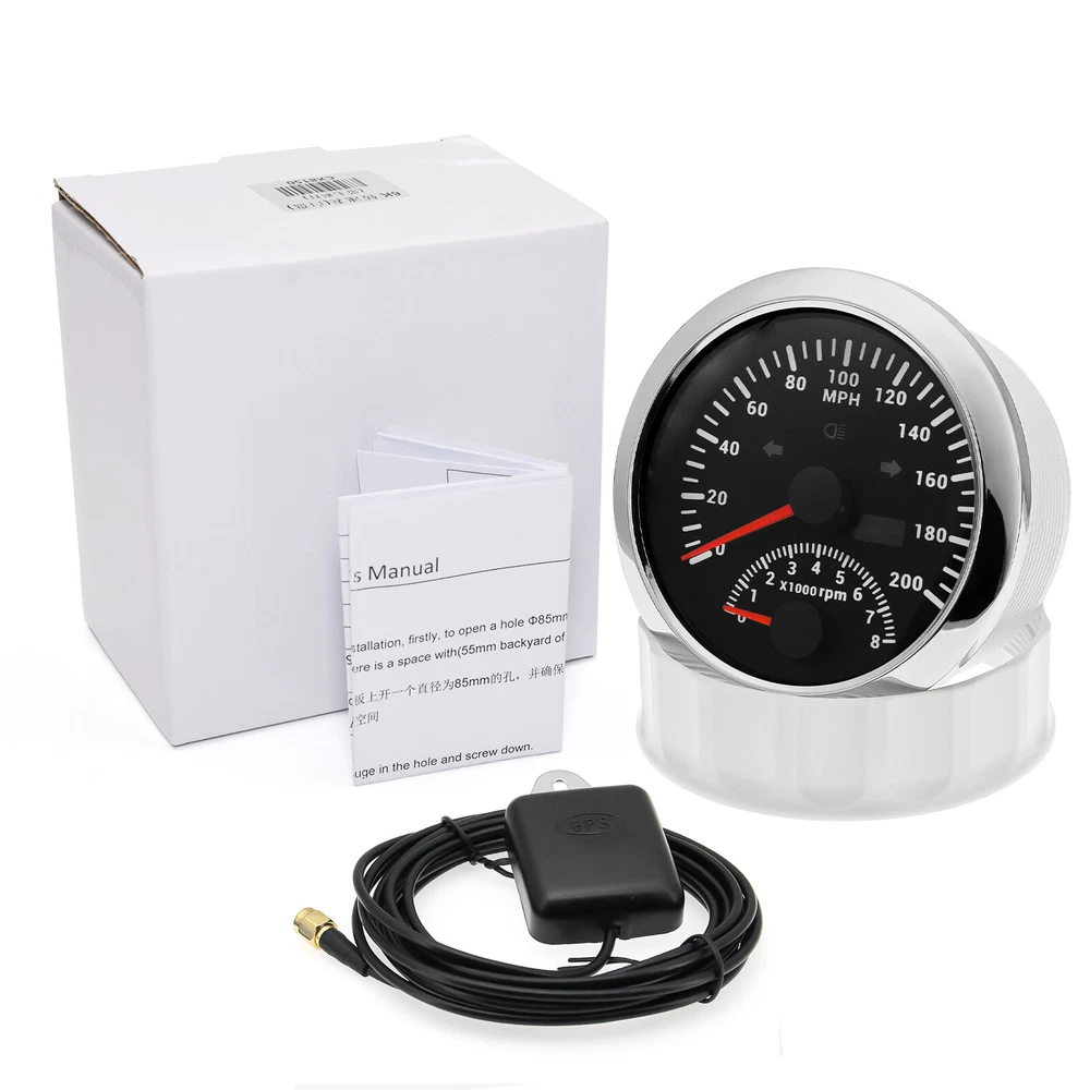 2 Gauge Set 85mm GPS Speedometer 0-200MPH & 4IN 1 Fuel/Water Temp/Oil Press/Volt 2 Gauge Set with Senders 85mm GPS Speedometer 0-200MPH with 85mm Fuel Level Water Temp Oil Pressure Volt For Car Boat Features: Suitable for all vehicles and off-road vehicles The signal comes directly from the satellite signal receiver(GPS Antenna), don't need other speed sensor. The gauge has the advantages of high precision, quick location confirmation and short start up time. IP67 waterproof and dustproof grade Reverse polarity protection and anti-fogging performance Stepper motors used for full range of stepping gauges, great feature with its less power consumption, longer life, higher precision, etc. Most importantly, the gauge is easy to setup, and can be used in all vehicles, boats and off-road vehicles. Speedometer Specifications: Application: Universal fit for Motorcycle/ Boat/Truck/Bus/Car Electronic Speedometer (stepper motor) No Mechanic Sensor, get speed signal from GPS Speed ≠0 and show accurate speed in tunnel with the help of accelerometer Total Mileage Adjustable GPS Blind Area Odometer Compensation OverSpeed Buzzer Alarm (Value Adjustable) Indication Light (Left, Right and High Beam Installation Diameter: 85mm (3 3/8") Speed Range: 0~200MPH RPM Range : 0~8000RPM Mileage Range: 0-99999.9miles Working Voltage: 12V/24V Working temperatures: - 40 to 85°C Protection rank: IP67 Waterproof Reverse polarity protection and anti-fogging performance 4 IN 1 Gauge Technical Data: Fixing dimension: 85mm Indicating Range: Oil press. meter: 0-150PSI Water temp. meter: 100-250℉ Fuel level meter: 0-190ohms/240-33ohms, empty-full; The signal can be adjusted Voltmeter: 8-16V Working Voltage: 12V Input Signal: 10-184ohms for 0-150PSIoil pressure meter; 0-190ohms for fuel level meter;(Default 0-190ohms, can adjust to 240-33ohms) 8-16V voltage meter; Input Signal 320-22ohms for water temperature meter Red backlight Protection grade is IP67, the whole body is completely waterproof; Excellent antifogging function; 316 Stainless steel bezel with curved glass; Convenient Installation by multi-plug socket connecting way; Accessories: matched with connectors, Installation Instruction Package Included: 1 x 85mm 4 in 1 Multifunctional Gauge 1 x 85mm GPS Speedometer Gauge 1 x GPS Antenna 1 x M16*1.5 Tacho Sensor 1 x 1/8NPT Oil pressure Sensor 1 x 1/8NPT Water Temp Sensor 2 x Cable 2 x Installation Instruction