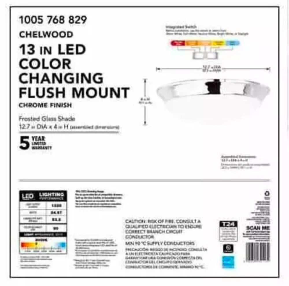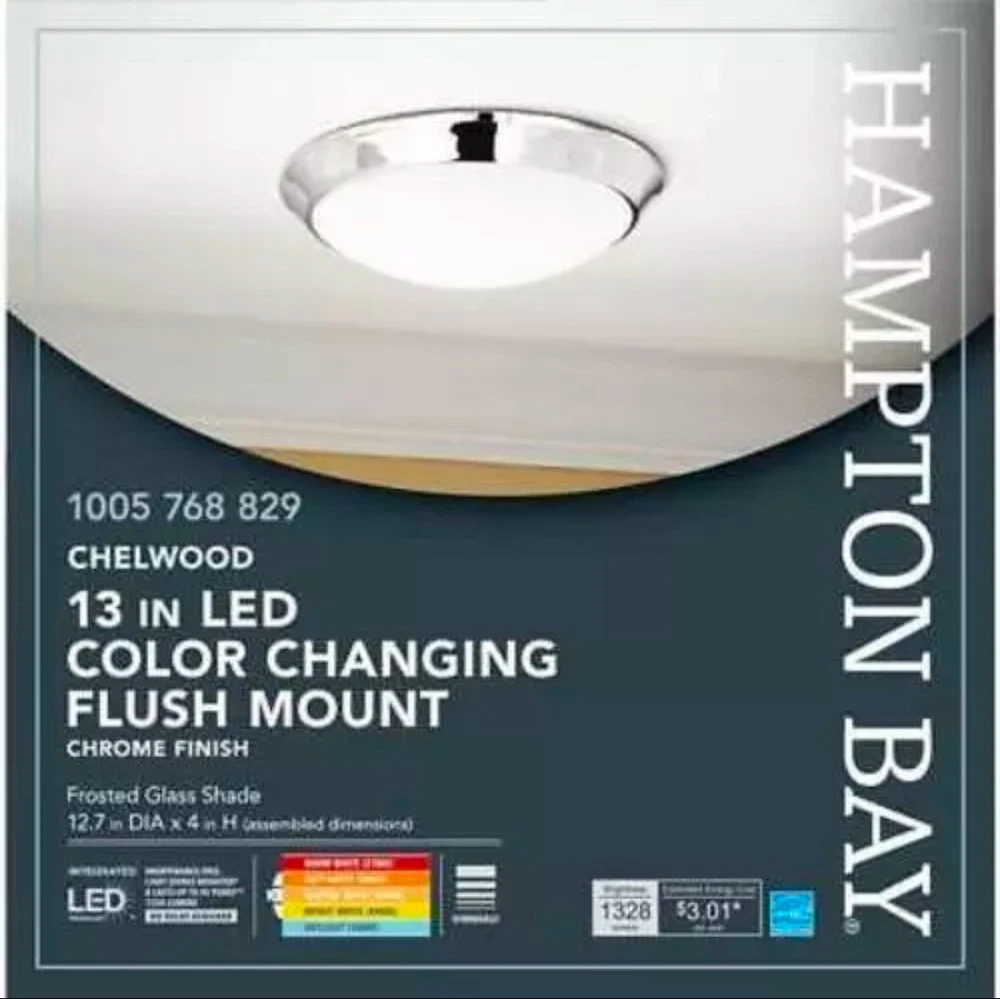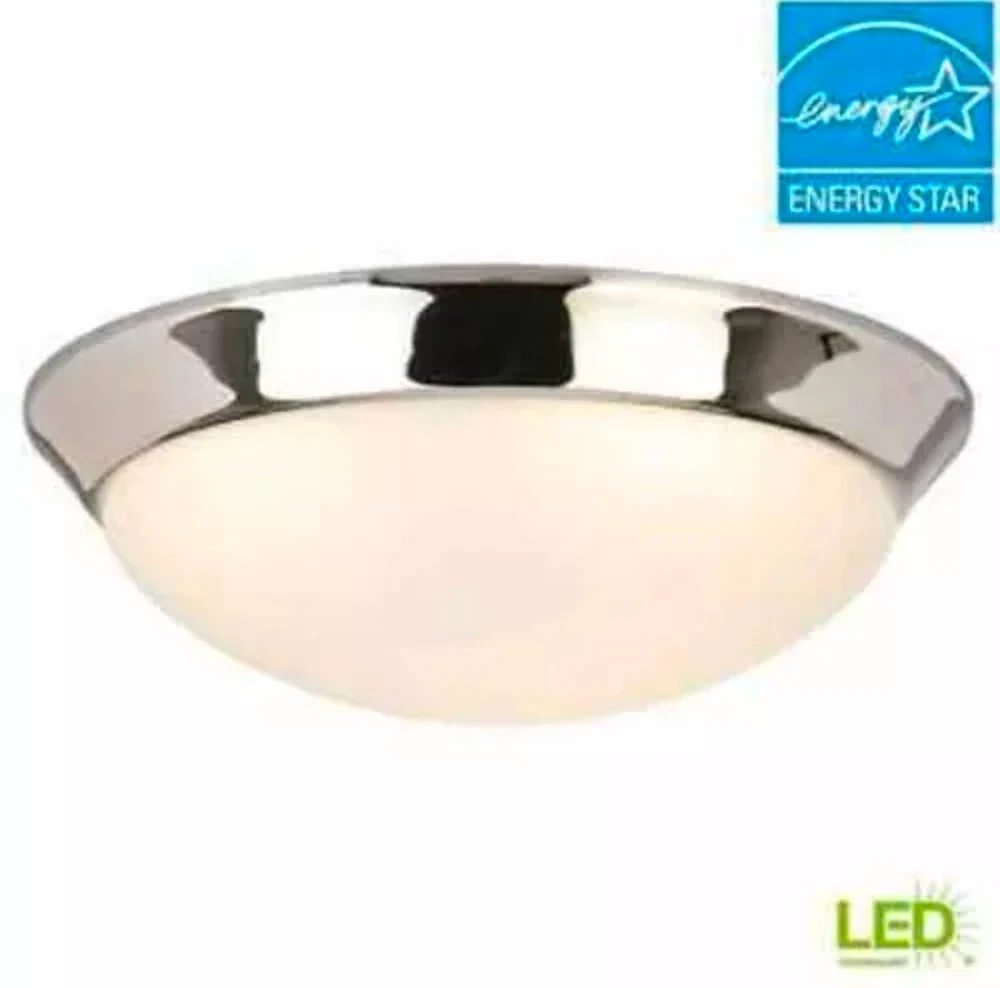 About This Product The technology of this 13 in. 25-Watt Chrome Ceiling Flushmount has a 90 CRI high color rendering that creates a perfect illumination and makes this fixture completely glare free providing more natural light for your home or office. The long-lasting LED technology provides light output equivalent to 180-Watt of traditional incandescent lighting, while using less than 20% of the energy for year round savings. If features a selectable color temperature feature which allows you to choose your preferred white light color: soft 2700K, warm 3000K, bright 3500K, cool 4000K, or daylight 5000K. Enjoy a 5-year warranty and a rated life of 45-years or 50,000-hours of continuous use. The Energy star certified light source is maintenance free with no bulbs to change. 2000K to 3000K: gives off a soft white glow, often yellow in appearance, best for living rooms, dining rooms, bedrooms and outdoor spaces 3100K to 4500K: gives off a bright amount of white light, best for kitchens, offices, work spaces and vanities where task lighting is needed 4600K to 6500K: gives off a bright amount of blue-white light, similar to that of daylight, best for display areas and work environments where very bright illumination is needed Brightness: 1328 Lumens Assembly and installation parts included Dry rated: a dry location is an indoor area that is not normally subject to dampness Streamlined design is ideal for above-the-door application Compatible with many LED wall dimmers ENERGY STAR
