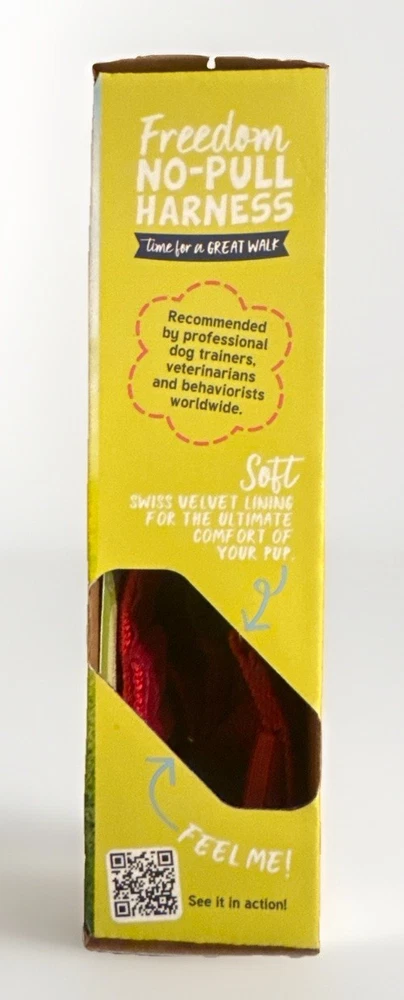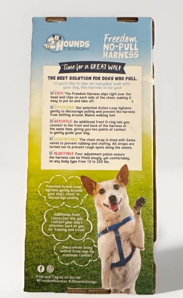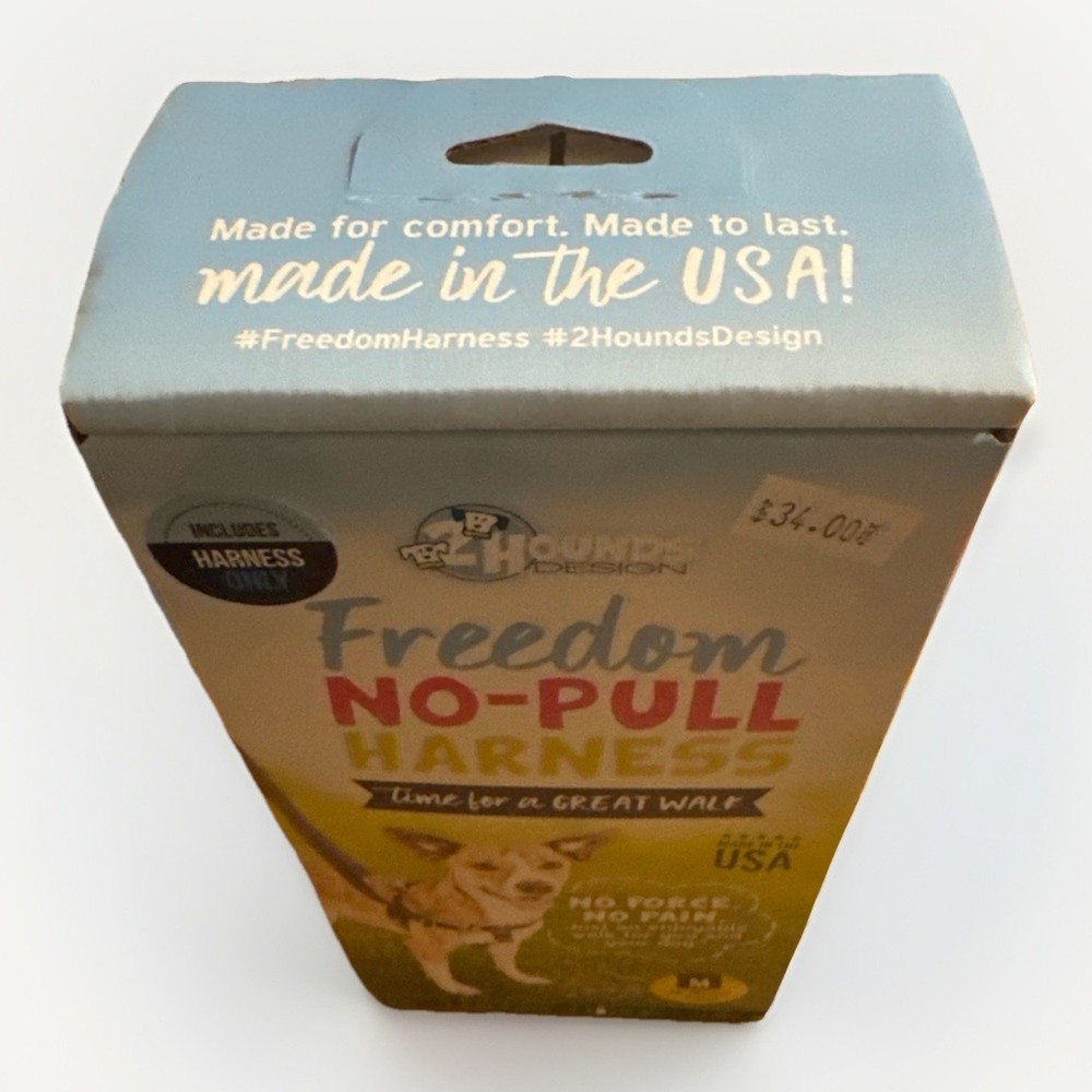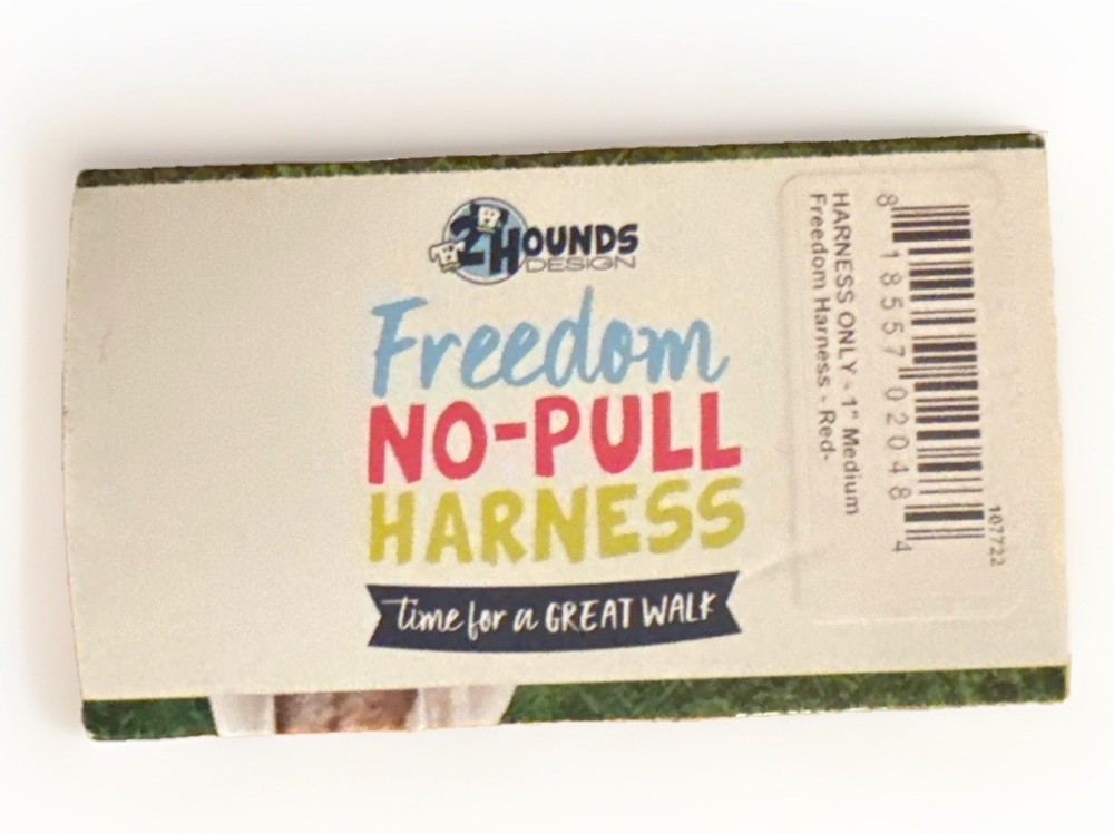 New 2 Hounds Design Freedom No-Pull Dog Harness, size Medium, color Red. Harness only (leash not included). Made in the USA. Designed to gently discourage pulling without force or pain. Features Swiss velvet lining for comfort and multiple adjustment points for proper fit. Item is new and unused. Box shows minor storage wear from handling. Please see photos for exact condition and sizing details. NIB