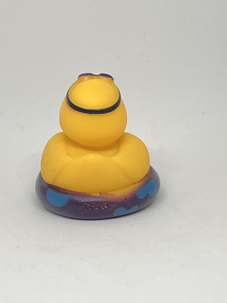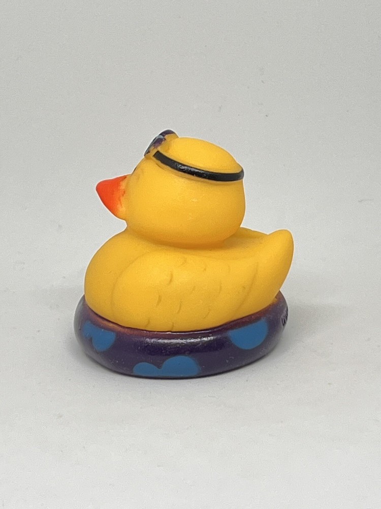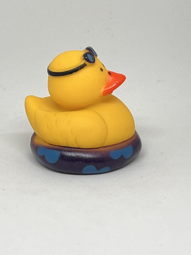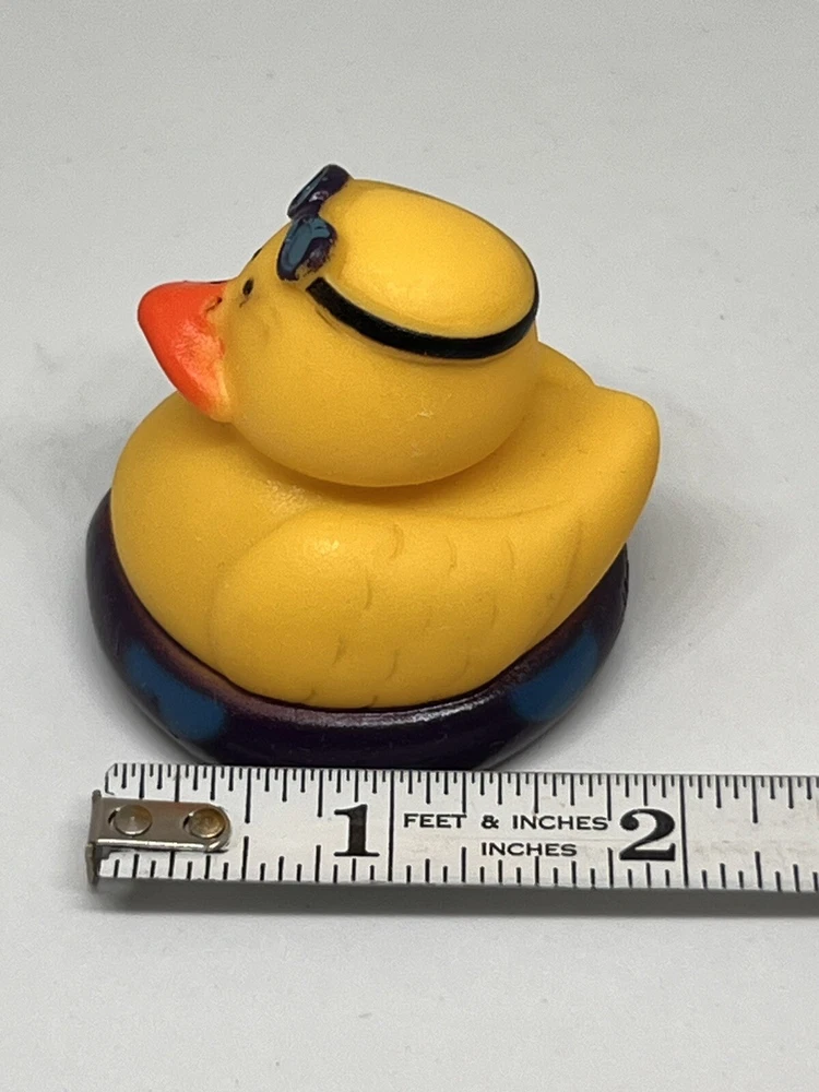This is a 2-inch yellow rubber duck toy from OTC that is designed to be used in the pool or bath. It is wearing goggles and has a swimmer character theme. Note: Item has marks/surface scratches; shown in photos! The bottom is not flat, it slightly curves up but sits as intended; as shown in photos! Thank you for stopping by!