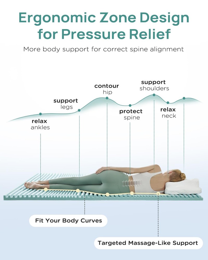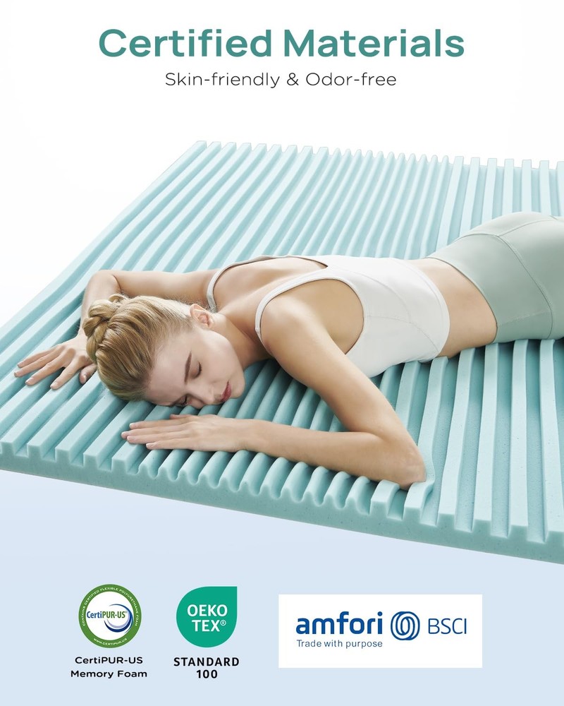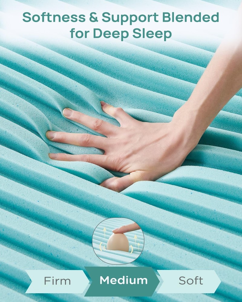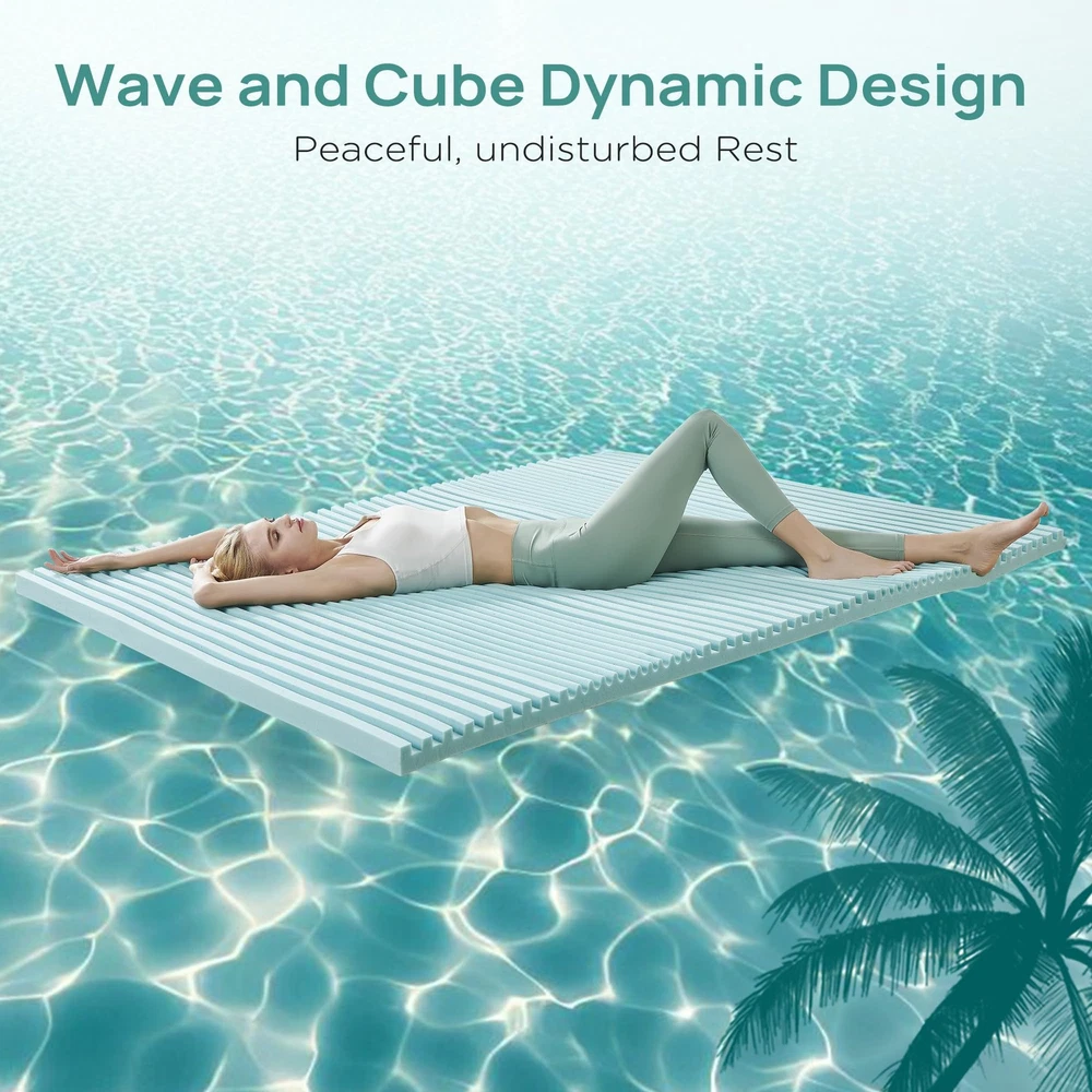 Upgrade your sleep with the Cooling Gel Memory Foam Topper, designed for ultimate comfort, support, and versatility. Featuring a unique 5-zone WAVE and CUBE Dynamic design, it provides targeted support for your head, shoulders, back, hips, knees, and feet, relieving pressure and promoting proper spinal alignment to ease back pain. Advanced cooling gel technology and innovative airflow channels ensure efficient heat dissipation, enhanced breathability, and temperature regulation, making it perfect for hot sleepers. Crafted from CertiPUR-US and OEKO-TEX certified materials, this skin-friendly topper offers a safe, healthy sleep environment for you and your family. Its dual-sided design lets you choose your preferred firmness, eliminating restless nights on an uncomfortable surface. Versatile and adaptable, it’s perfect for sofa beds, air mattresses, dorm rooms, RVs, or any space, with the option to trim for a custom fit. Delivered compressed in a box for convenience, it fully expands in 24–48 hours. Experience unparalleled comfort, support, and cooling with the mattress topper—your solution for a better night's sleep anywhere. 【Elevated Pressure Relief 5-Zone Design】- unique WAVE and CUBE Dynamic design divides the king size mattress topper into 5 zones, delivering targeted support for your head, shoulders, back, hips, knees, and feet. This innovative design helps easing body pressure and promotes proper spinal alignment, making it perfect for relieving back pain. No more pain sleep with cooling bed topper 【Next-Gen Cooling Gel Tech】- Our king mattress topper features advanced cooling gel technology, designed to efficiently dissipate heat for a cooler night's sleep. The innovative airflow channels enhance breathability and improve air circulation, keeping you refreshed throughout the night. Perfect for hot sleepers, this cooling mattress topper helps regulate temperature, reduce night sweats, and deliver a truly comfortable cooling sleep experience 【Ideal Support for Comfort】- The king memory foam mattress offers contouring support that adapts to your body’s curves, easing pressure and promoting deep sleep. Designed for all sleep positions—side, stomach, or back—it ensures lasting comfort throughout the night. With its dual-sided design, you can pick the side that best matches your comfort preferences, putting an end to restless nights on a mattress that’s too soft or too firm 【Certified Quality Materials】– Crafted from CertiPUR-US and OEKO-TEX certified materials, our king mattress topper is free from harmful chemicals and skin-friendly. Designed to provide a safe and healthy sleep environment, it’s perfect for you and your family. Experience the comfort and durability of cooling topper for a truly refreshing night 【Easy Set up & Multi-scene Use】- Enjoy enhanced sleep comfort anywhere with this versatile foam mattress topper. Ideal for sofa beds, air mattresses, floors, dorm room twin XL mattresses, queen-sized beds, or RVs, its adaptable design can easily be trimmed to fit your space. Conveniently delivered compressed in a box, it expands fully within 24–48 hours. Upgrade your sleep setup with this cooling gel memory foam topper, crafted to deliver superior comfort and support wherever you relax