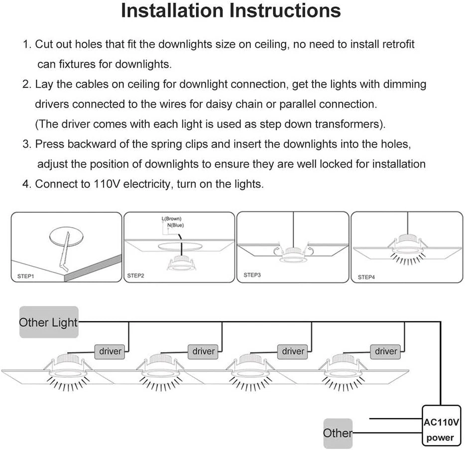 Store New Arrivals Add to Favorite View Feedback Contact 2 Inch LED Recessed Lighting, Dimmable Downlight 3W(35W Halogen Equivalent), CRI80, 3000K Warm White LED Ceiling Light with LED Driver(4 Pack) Description Item model number YGS-SH-3W-WW-4P Style Modern Number of Items 4 Power Source AC Number of Light Sources 4 Material Type Plastic Finish Types Unfinished Controller Type Push Button Unit Count 4 Count Room Type Indoor Product Dimensions 2.7 x 2.7 x 1.5 inches; 15.52 ounces Material Plastic Required Assembly Yes Model Number YGS-SH-3W-WW-4P Efficiency 44LM/W Additional Features Dimmable Specific Uses For Product Recessed light Light fixture form Recessed Fixture Type Non Removable Country of Origin China Light Fixture Form Recessed Item Dimensions L x W x H 2.7"L x 2.7"W x 1.5"H Shade Color White Mounting Type Ceiling Mount Color 3000k (Warm White) Wattage 3 watts Indoor Outdoor Usage Indoor Voltage 110 Volts Control Method App Style Name Modern Size 2Inch 4 Pack INSTANT SAVINGS - LED Recessed Lighting replace 35W halogen bulb by 3W dimmable LED. Save over 85% energy on electricity of lighting HIGH QUALITY - LED Recessed Ceiling Lights made of aviation aluminium and ABS plastic, make fast heat dissipation become possible while being light and solid DIMMABLE & CRI - LED Downlight has smooth dimming capabilities with modern LED dimmers. CRI80+, provides near-sunlight quality light for true color rendering and consistency inside your home, show natural color more vibrantly EASY INSTALLATION - Recessed LED lights kits can be easily fitted to replace ordinary 2.16 - 2.5 inch recessed light fixture. LED dimming driver is included. NO EXTRA recessed housing cans or accessories ARE REQUIRED. Please refer to the picture of the installation process QUALITY - LED Downlight life more than 40,000 hours, high light transmittance, providing even illumination. If you have any issues within two years of purchase, please feel free to for assistance Product Description CRI > 80 Highlight your decor with more vivid and sun-like quality lighting Prevent Fire Flame retardant PC Keeps fire away Warm White - 3000K Warm White light to set a cozy atmosphere in your living room, bedroom or study Specification: Power: 3W Input Voltage: 110V-130V AC Emitting Color: 3000K Warm White Dimmable: Dimmable Brightness: 250LM Material Type: Aluminum + Flame Retardant PC Front Diameter: 70mm/2.75inch Cutout Opening Diamerter: 53mm/2.08 inch Height: 34.8mm/1.37 inch Package includes: 4 x 3W Dimmable LED Downlights * Please Note: * If the wire color is Blue, you can connect them to "L""N" at will. If the wire color is Red (Brown) and Black (Blue), that means: Red (Brown): L, Live Line; Black (Blue): N, Null Line. ABOUT US We offer the best prices around on high quality products. Our E-store includes media such as books, movies, music and games while offering electronics, toys, sporting apparel, clothing, tools, general home, garden items and more. SHIPPING We are always working hard to ensure your package arrives as soon as possible. Please understand that some factors like weather, high postal traffic, and the performance of shipping companies are outside of our control. We offer free shipping to the lower 48 states and ship within 2 business days of payment, usually sooner. We do not accept P.O. Boxes. Please provide a physical address. For shipping outside of the continental USA, we only use eBay's Global Shipping Program.The item is shipped to KY and then sent to the rest of the world. International customers are responsible for all duties and taxes. Continue to check out in order to calculate costs for shipping the item to your country. Messages regarding eBay's Global Shipping Program MUST be directed at eBay EXCLUSIVELY. RETURNS We offer a 30-Day Return Policy on items which you are not completely satisfied with. You have the option for a full-refund or an exchange of the item. No returns are available on items shipped outside of the USA. PAYMENT We accept PayPal. CONTACT US This page content is yet to come Please ad us to your favorite seller and visit again later Thank You CUSTOMER SATISFACTION We try our very best to make sure every customer is completely satisfied. If there's a problem, message us! We're happy to help. WE ACCEPT Copyright © 2021 AutoDS. | All Rights Reserved