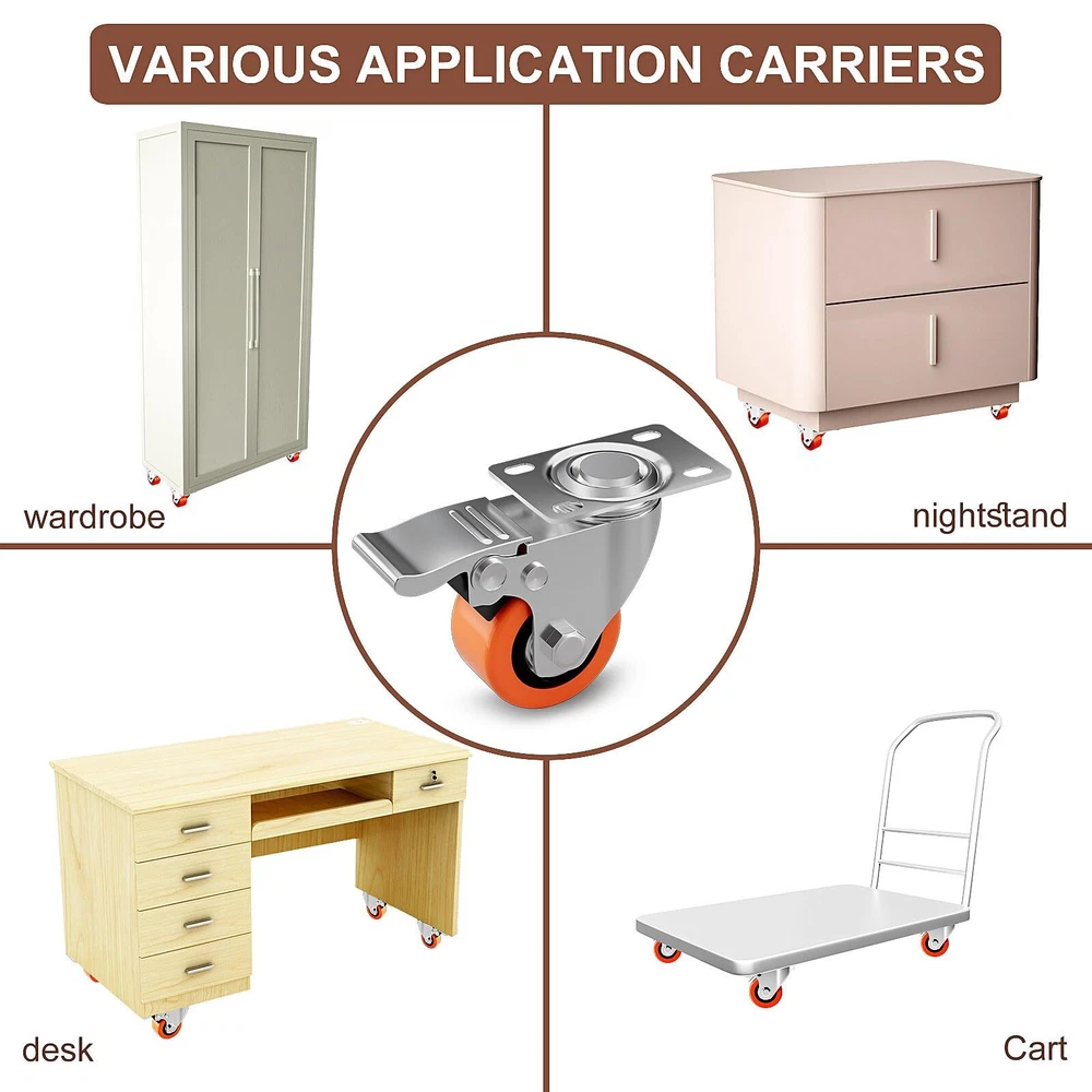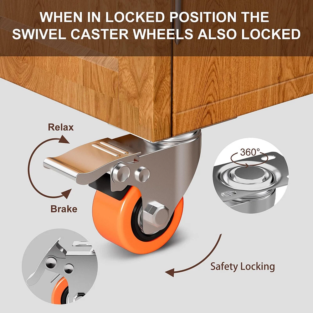 Double Ball Bearings & Heavy Duty - Our 2 inch heavy duty top plate swivel caster wheels can carry 150 Lbs.All the heavy-duty plate casters set of 4 are double steel ball-bearing designed, can support a load capacity of up to 600 Lbs. Double Safety Brake - Our top plate swivel caster wheels have double brake, it can brake the rotation direction of the bottom plate and the direction of the wheel forward, which is easy to operate.and also can effectively stop and prevent the device from moving and hurting others. Silent & Floor Protection - The high-quality polyurethane covering the steel wheels achieve smooth,quiet, and non-marking gliding experience on various flooring types.Wheels roll smoothly from indoor flat surface to outdoor rugged place.which will protect the floor. Smooth Rotation 360° Casters - Highly maneuverable casters let you turn easily.Swivel casters with ball bearings have smooth swiveling and protection from dust and debris, Enabling smoother swiveling and extending service life. Wide Application - they save mounting space and are suitable for baby beds, furniture,dressers,toolboxes, carts, speakers, cabinets, brackets,wooden boxes, desks,frames,BBQ desk,kitchen island,flight cases,instrument cases,various dollies,different equipment stands,light machinery,etc.
