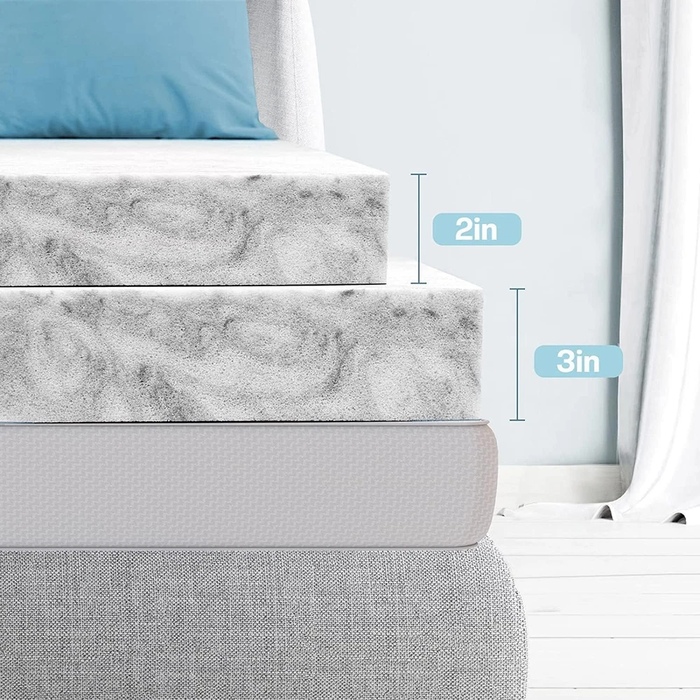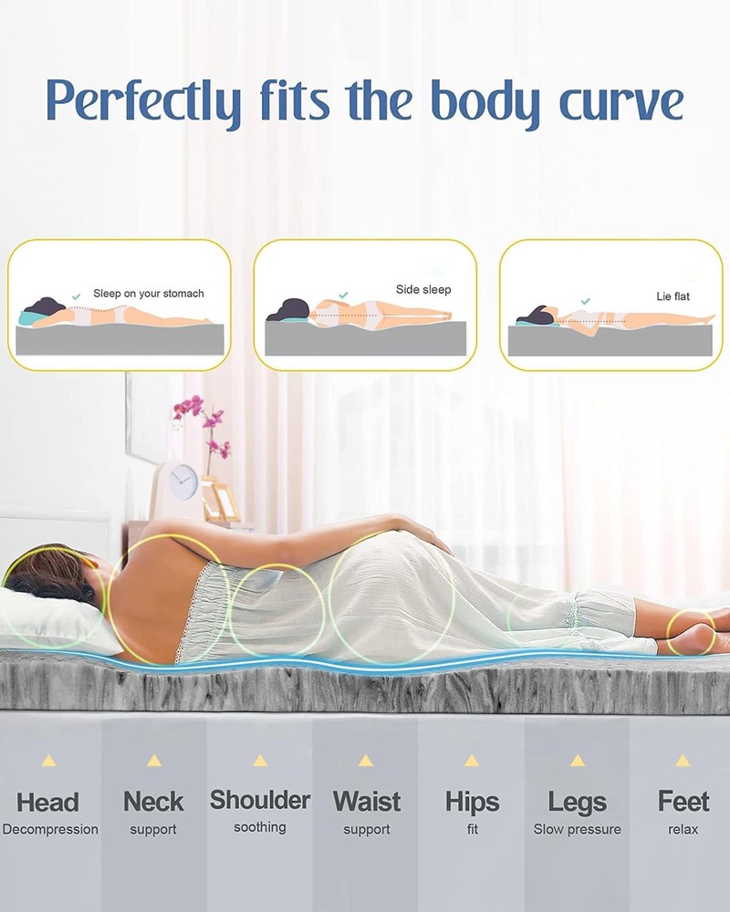 ✅Ventilated and Moisture Control - The negative ion integrated ensures a healthier sleep environment. Filled with charcoal microscopic porous attraction structure ventilation, naturally hypoallergenic memory foam is optimized for airflow and moisture control, reducing body heat retention and preventing odors. ✅Ultimate Comfort - Moderately soft and flexible polyurethane material is suitable for all body types, evenly distributing weight and reducing spinal pain and pressure points. Whether you sleep on your back or side, the bed topper fits your body's curve and increases the hours of deep sleep. ✅Extraordinary Mattress Toppers - Lounging on the couch, camping in the great outdoors, or hitting the road in your RV, this topper eliminates motion transfer allowing your family to enjoy a sound night. Sunk right in a layer of sumptuous and soft-to-the-touch memory foam. ✅Ideal Addition - Whether you're looking to rejuvenate an old mattress, enhance the comfort of a too firm bed, or add a touch of decorative flair, a foam mattress pad is the ultimate cost-effective solution. It turns your ordinary bed into a heavenly oasis enveloped in luxurious clouds! ✅Unpacking and Care Instructions - Memory foam topper comes smartly compressed. Upon receiving it, we recommend placing it in a well-ventilated area to regain its original shape. Moreover, please avoid exposing the topper to direct sunlight, as this could cause discoloration, turning it yellow.